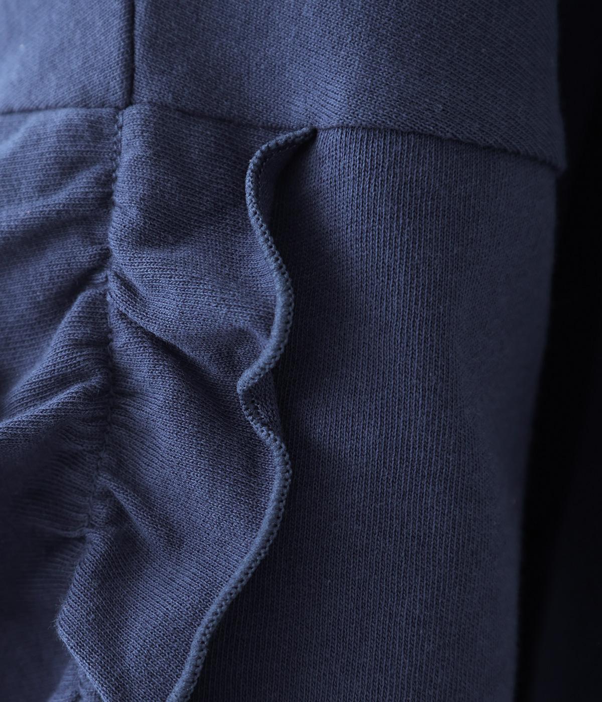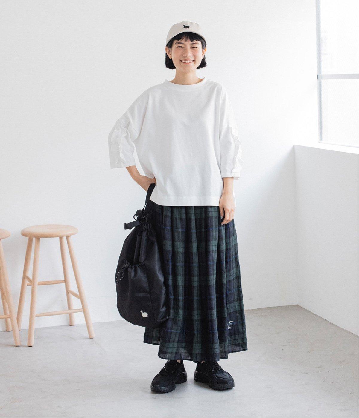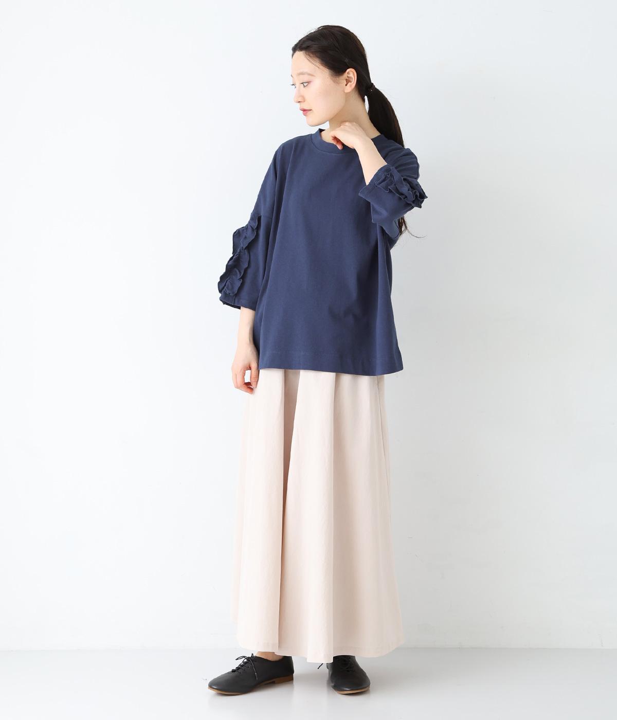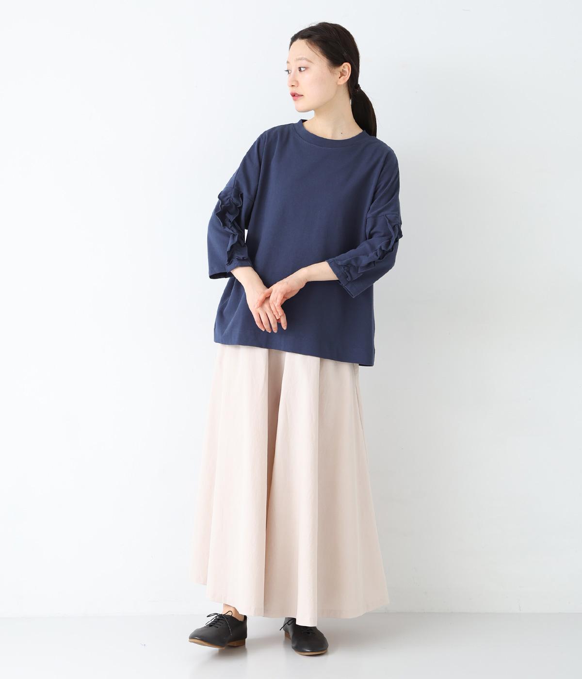 日常着として気軽に使える、甘すぎない袖フリルが主役のTシャツ。パンツやスカートはもちろん、サロペットと組み合わせても、バランスの取れたコーディネートが完成。