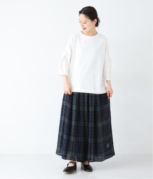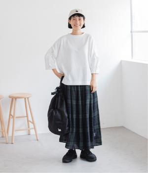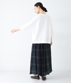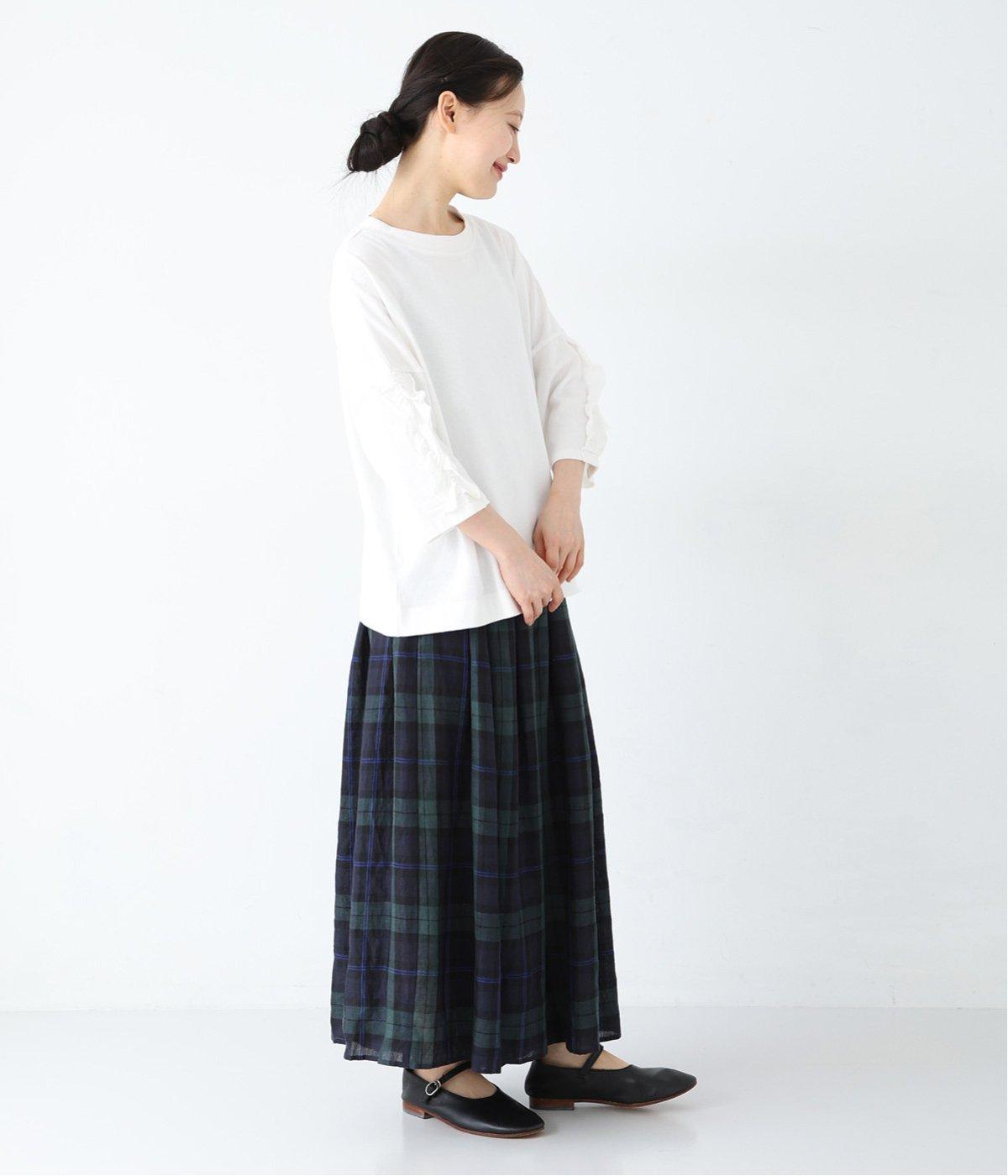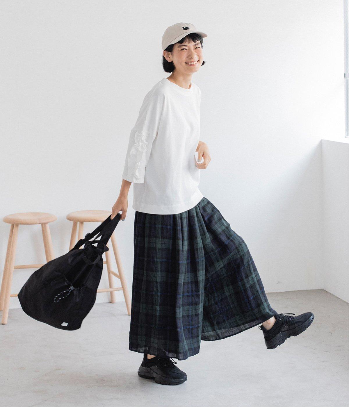 爽やかなホワイトは、ナチュランでも人気のブラックウォッチ柄が映えるワイドパンツを合わせて。フリルがあることで、気取らない装いにも凛とした雰囲気が漂う一着。
