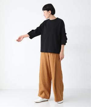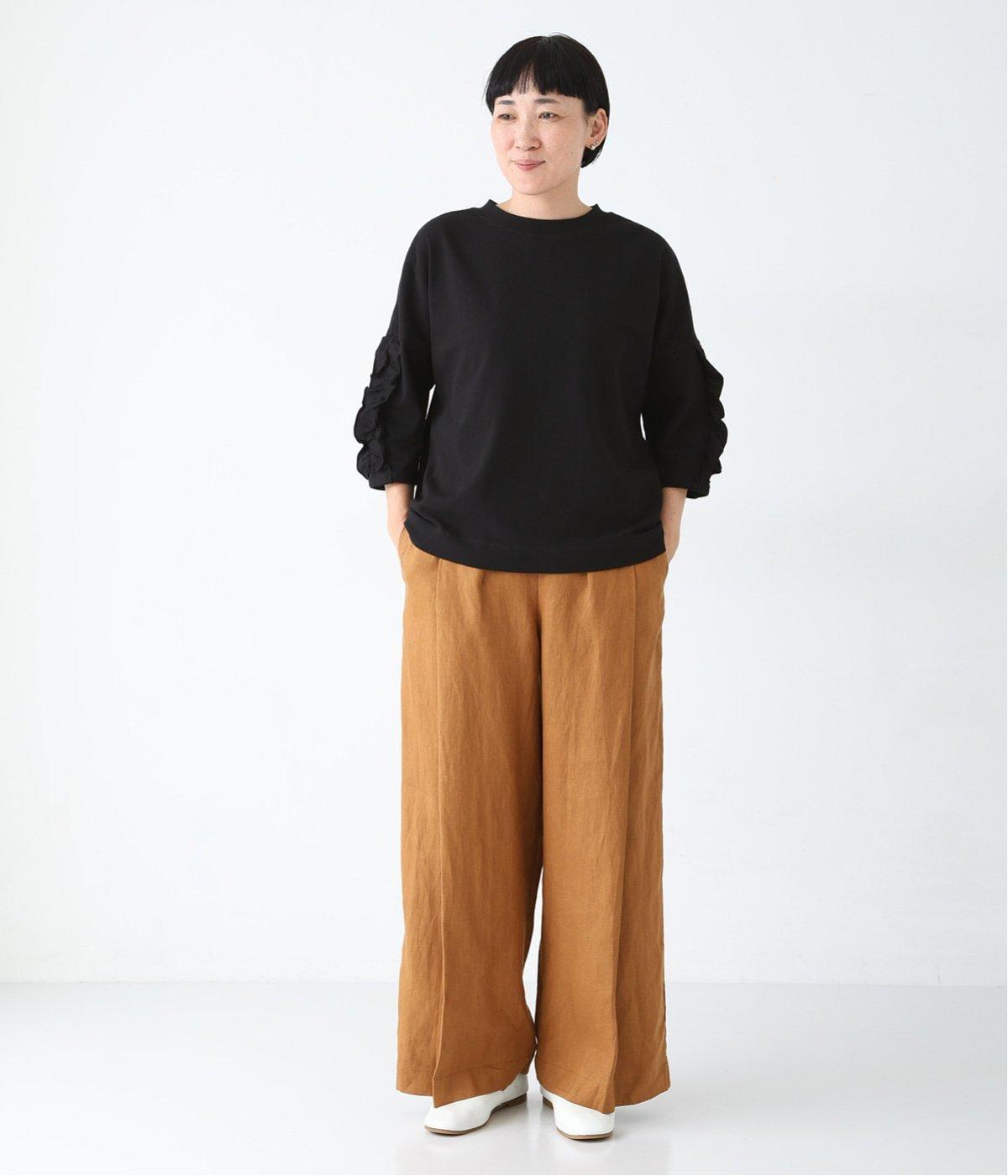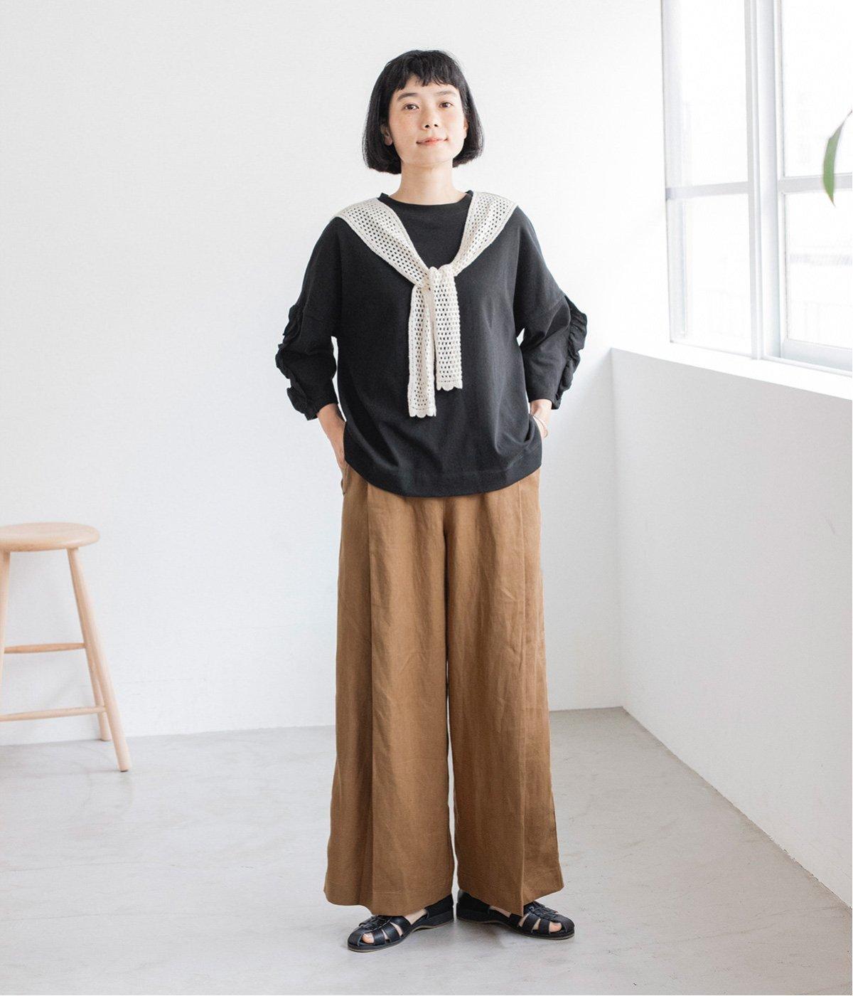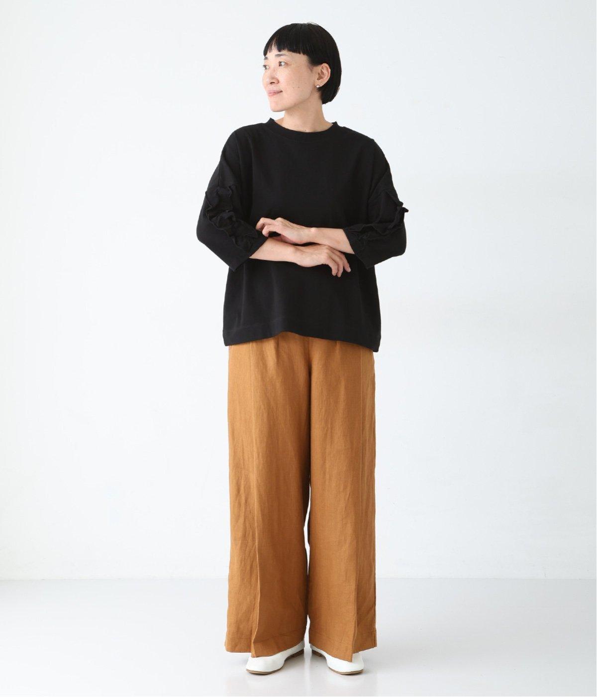 広めに入ったタック使いで、ストンと落ちるフォルムのワイドパンツ。風合いのある麻素材を使用した、ウエストゴムでストレスのない穿き心地が魅力。