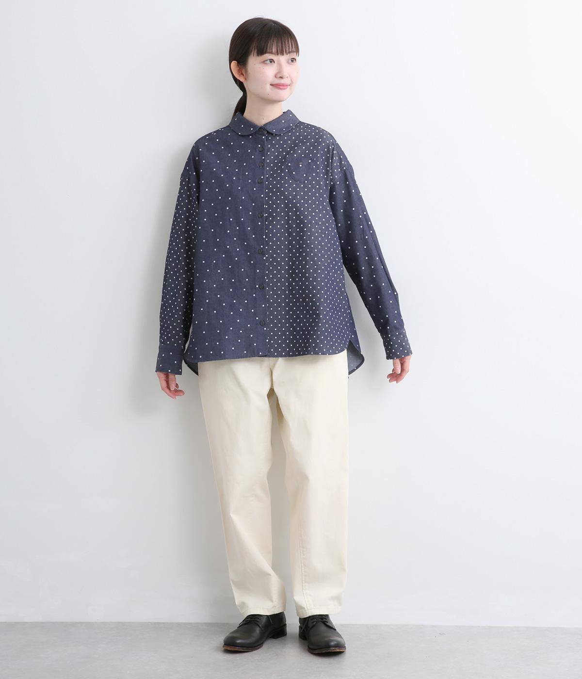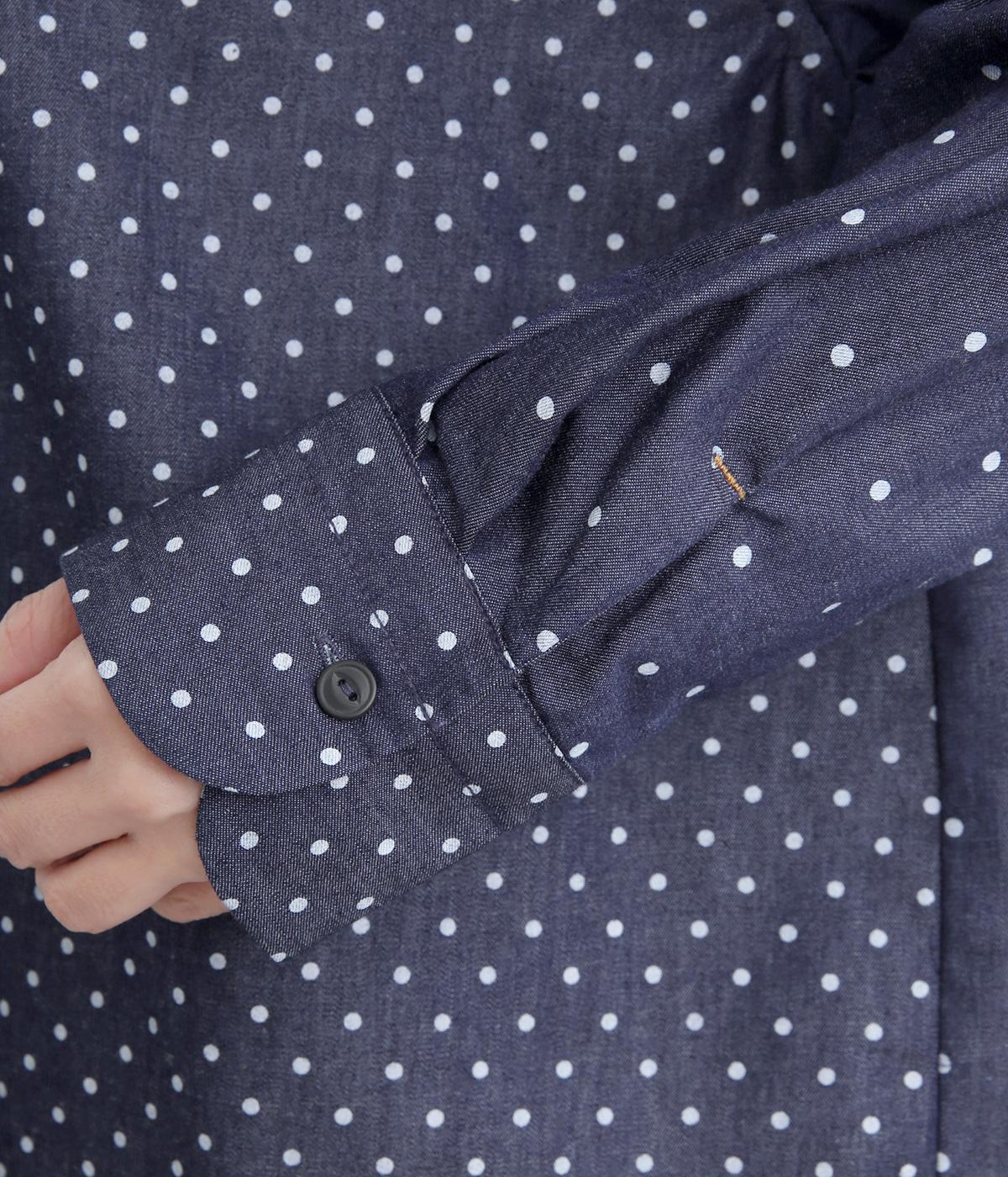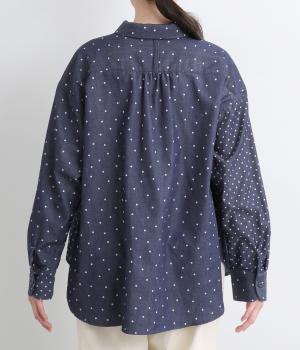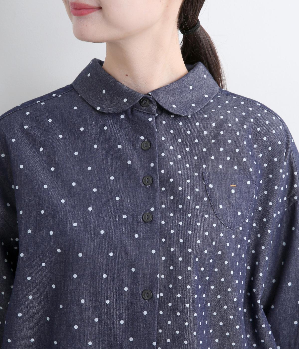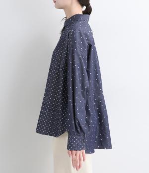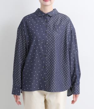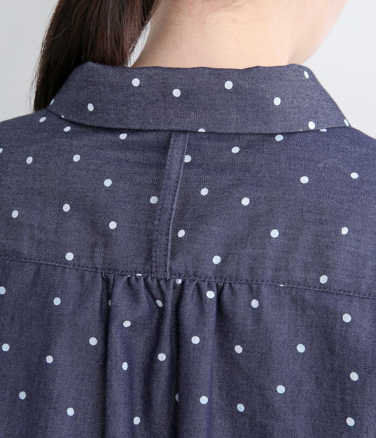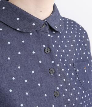 ピッチの異なる2種類のドットで甘すぎないバランスに仕立てました。小さな丸襟や胸ポケットもかわいらしさを添えています。ボタンは上部の間隔を狭くしてアクセントに。開け方も調整でき、上だけ閉めてふんわりと羽織るのもおすすめです。