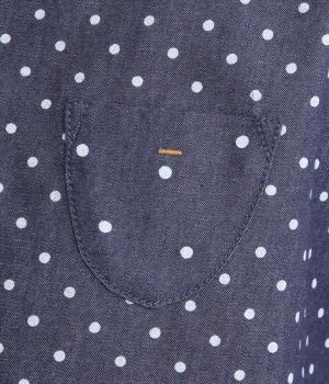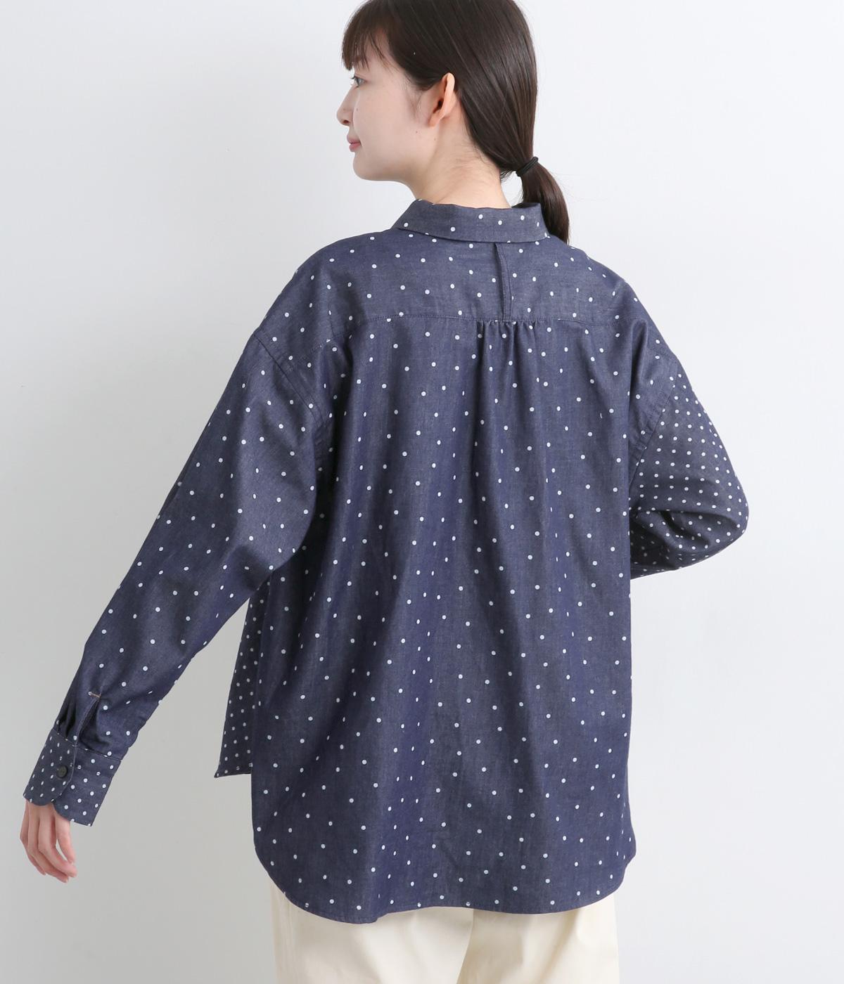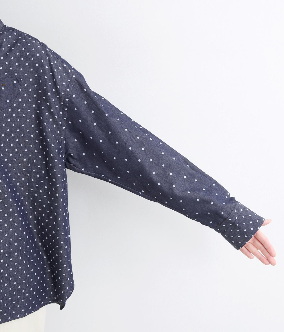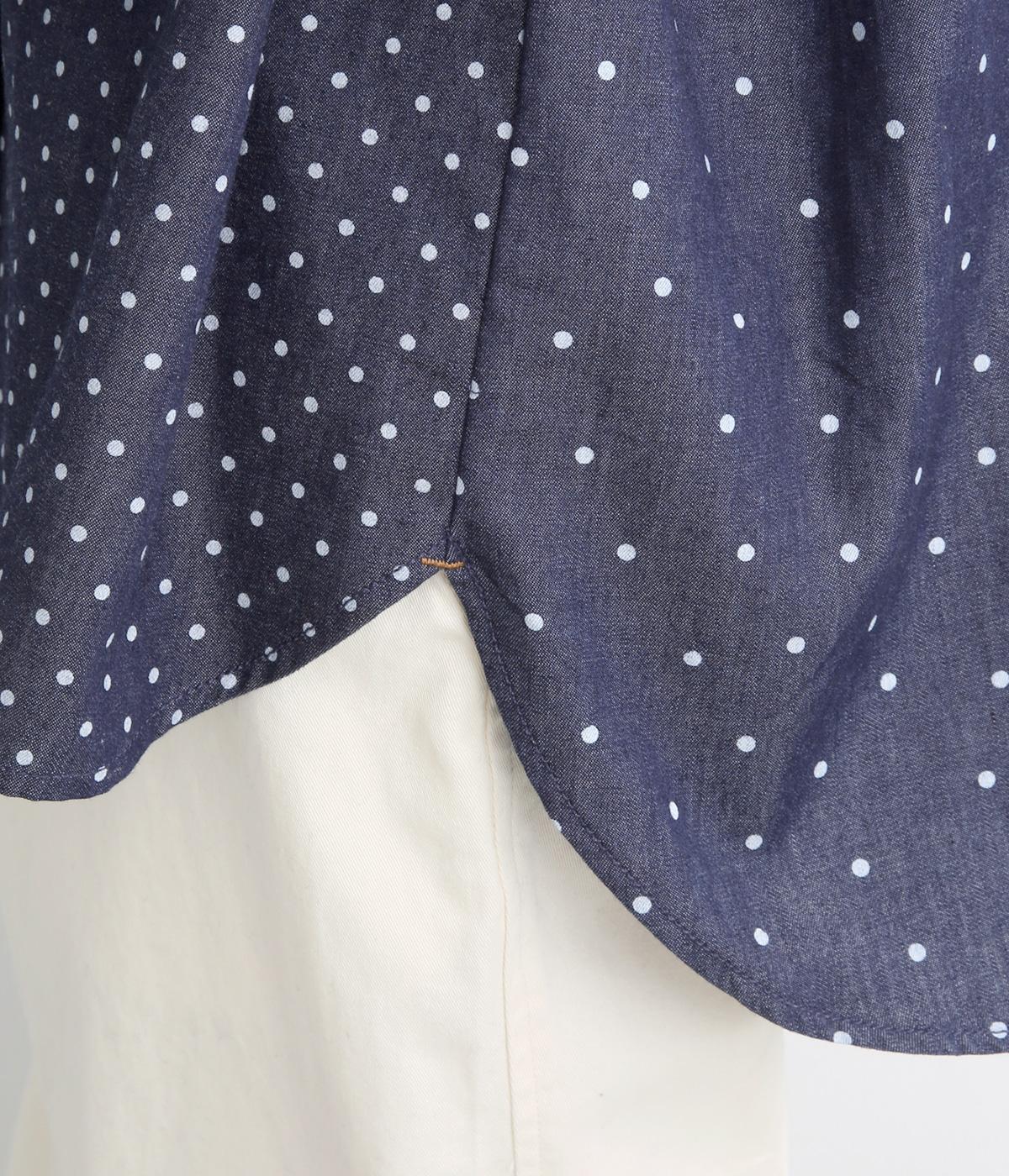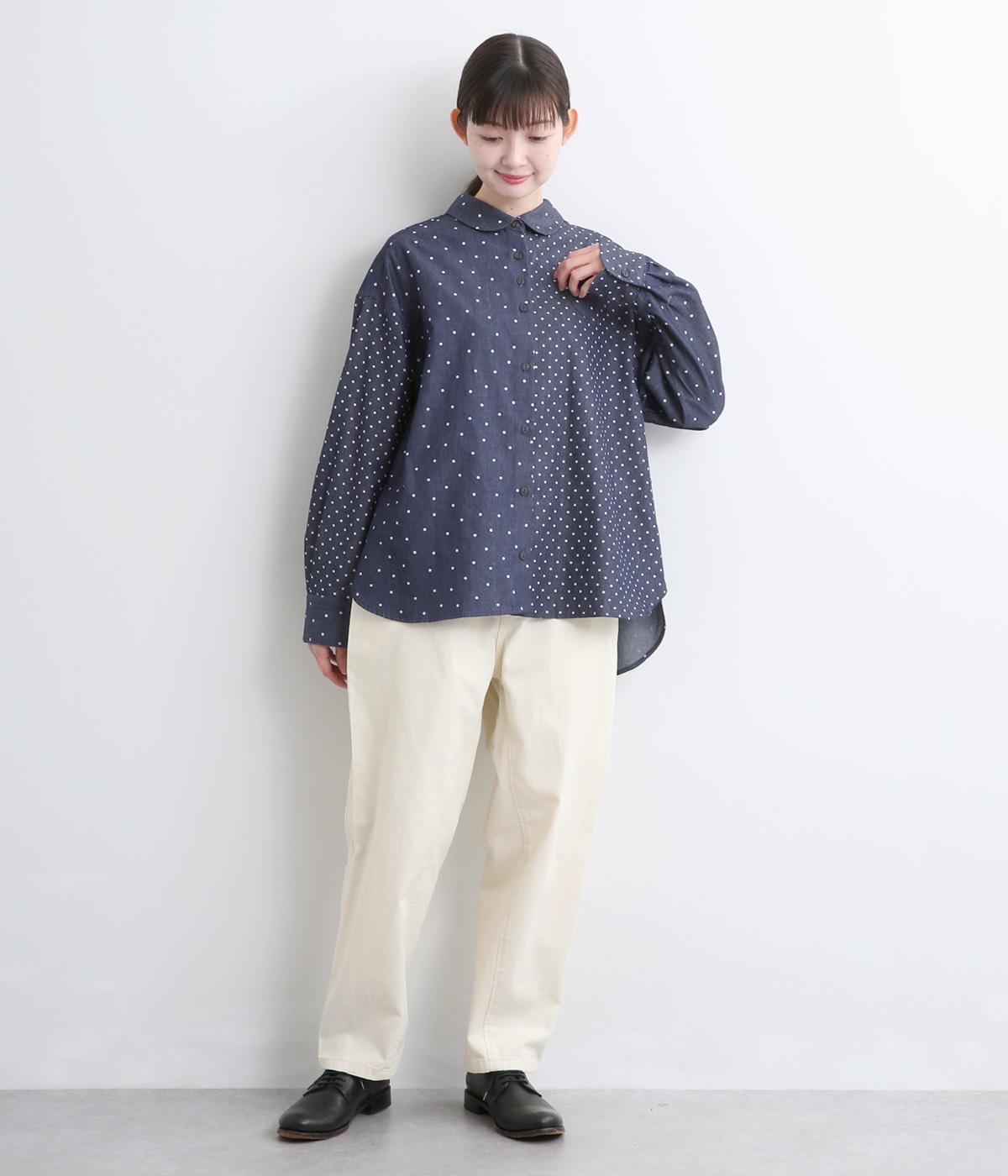 ピッチの異なる2種類のドットで甘すぎないバランスに仕立てました。小さな丸襟や胸ポケットもかわいらしさを添えています。ボタンは上部の間隔を狭くしてアクセントに。開け方も調整でき、上だけ閉めてふんわりと羽織るのもおすすめです。