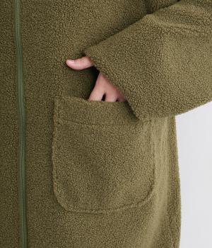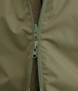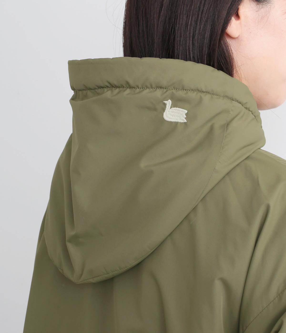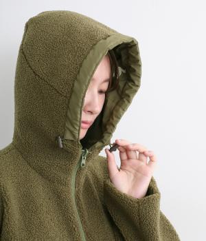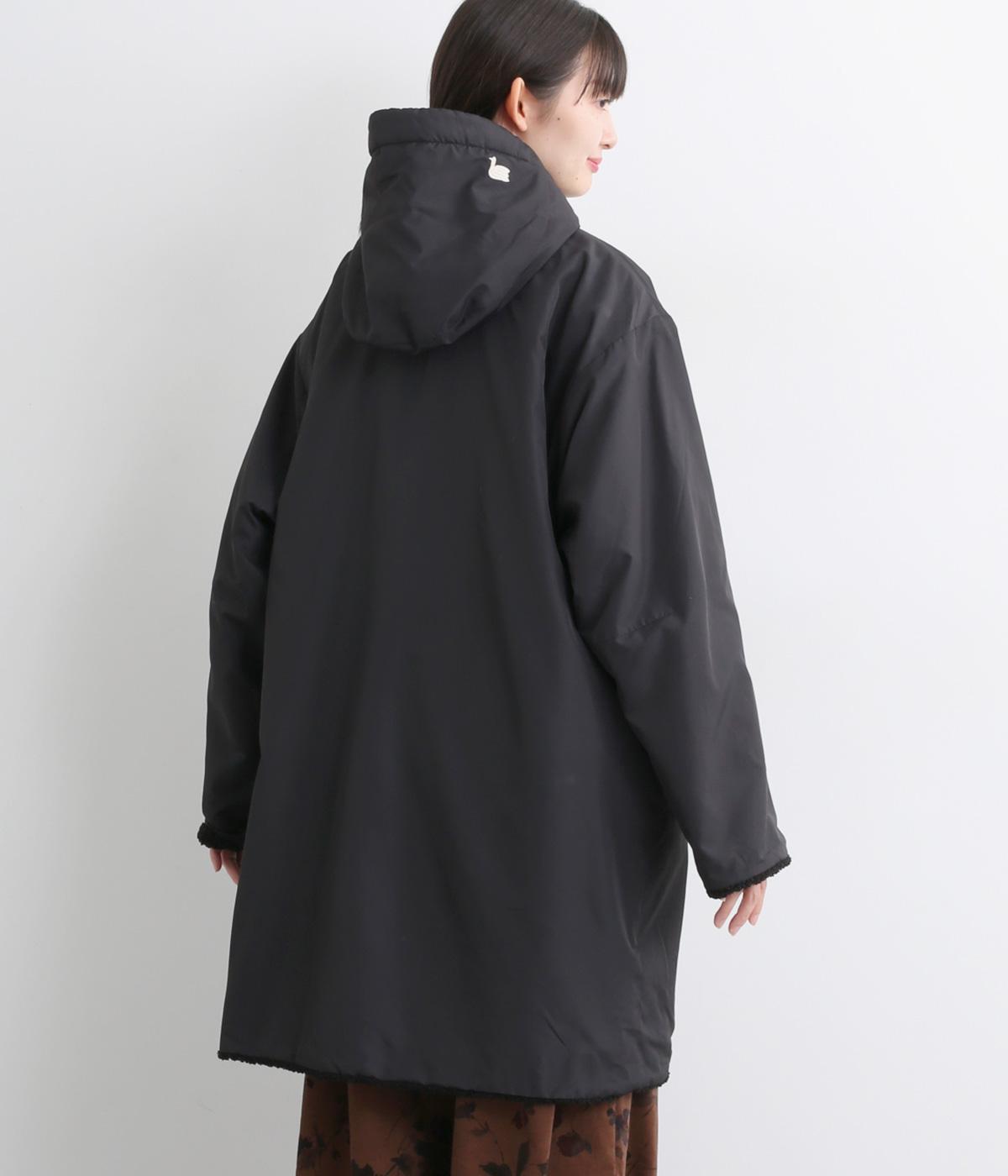 マットな表面感が上品なナイロン面と、もこもことしたぬくもりあるボアフリース面のリバーシブル。ナイロン側にはフードにスワンの刺しゅう入りです。