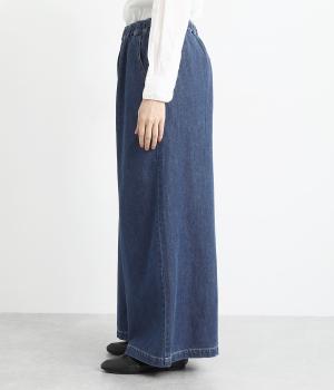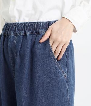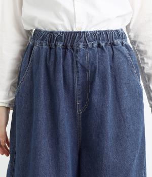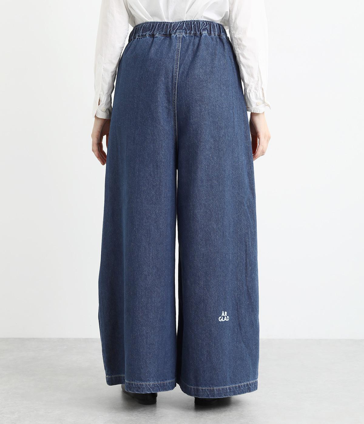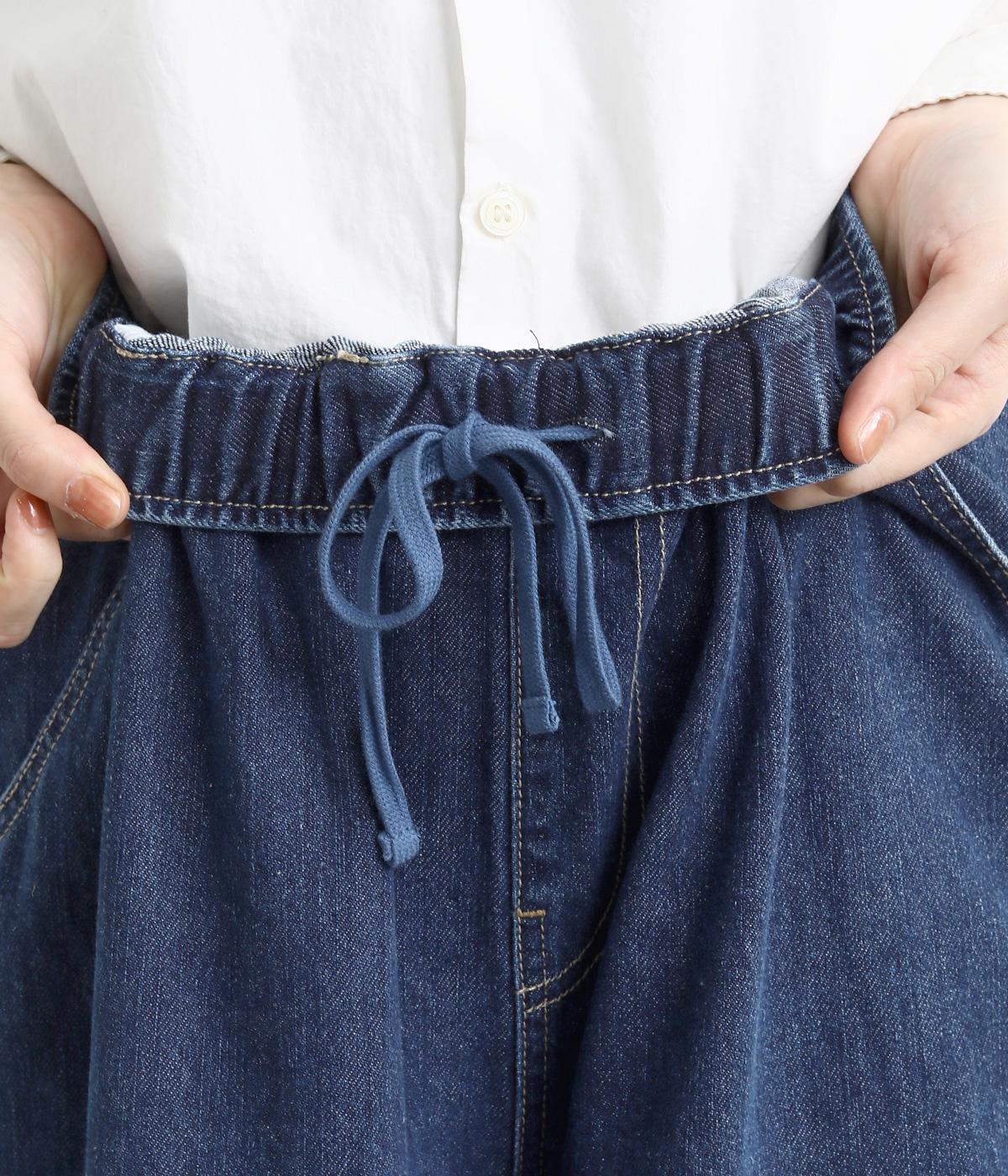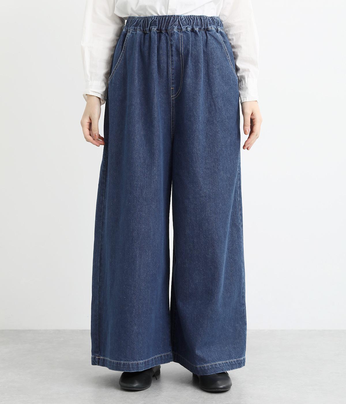 ワイドでボリュームのあるシルエットが特徴。モードな雰囲気漂う、フルレングスのデニムパンツです。右後ろの裾にはロゴプリントをあしらいポイントに。ウエストはゴム仕様ではき心地がよく、内側のヒモを絞ることでフィット感をアレンジできます。
