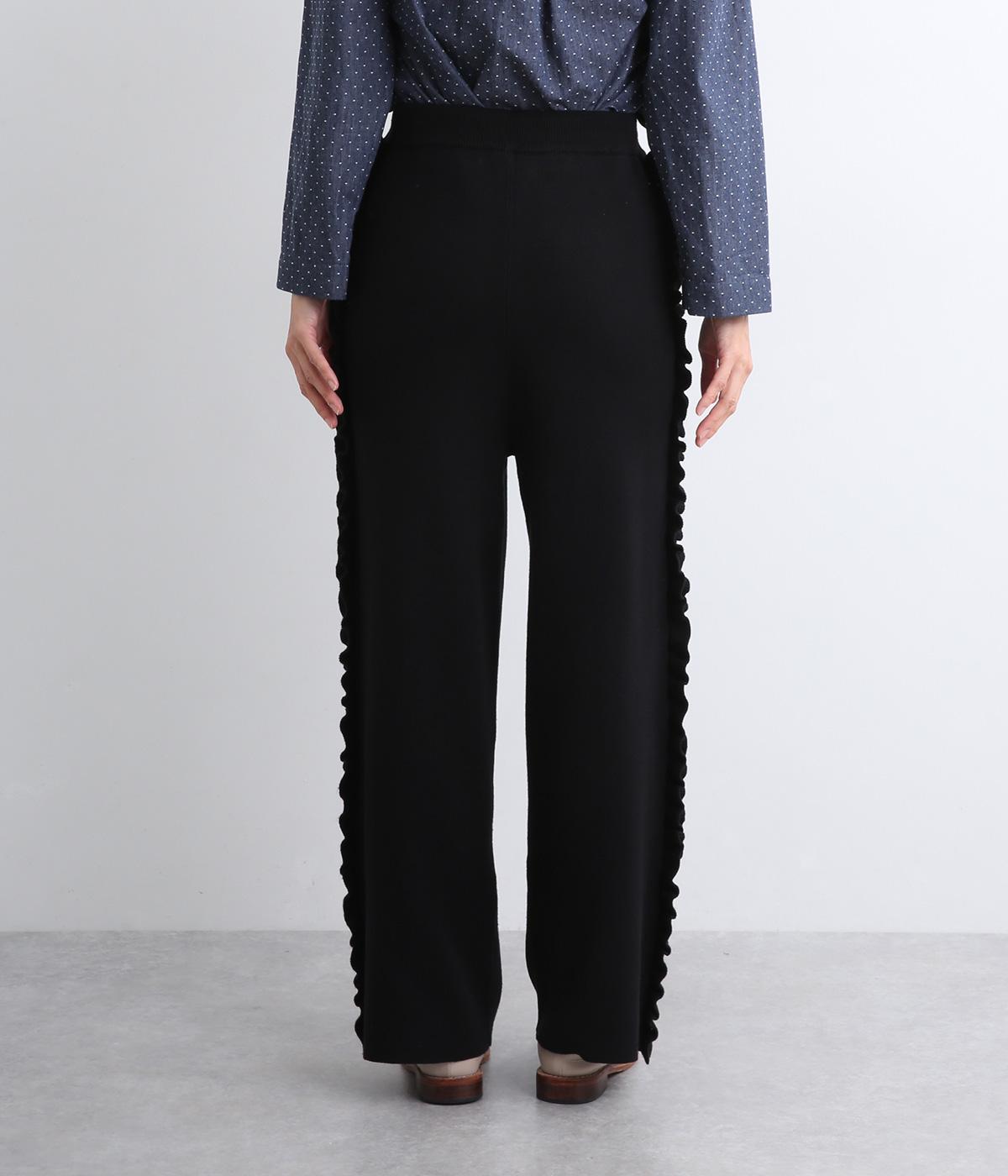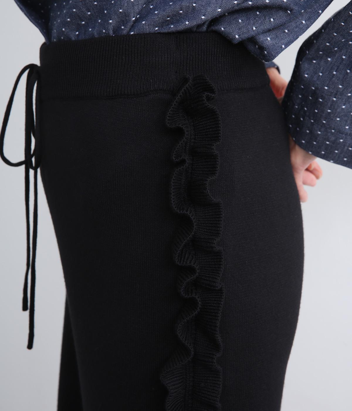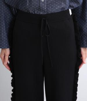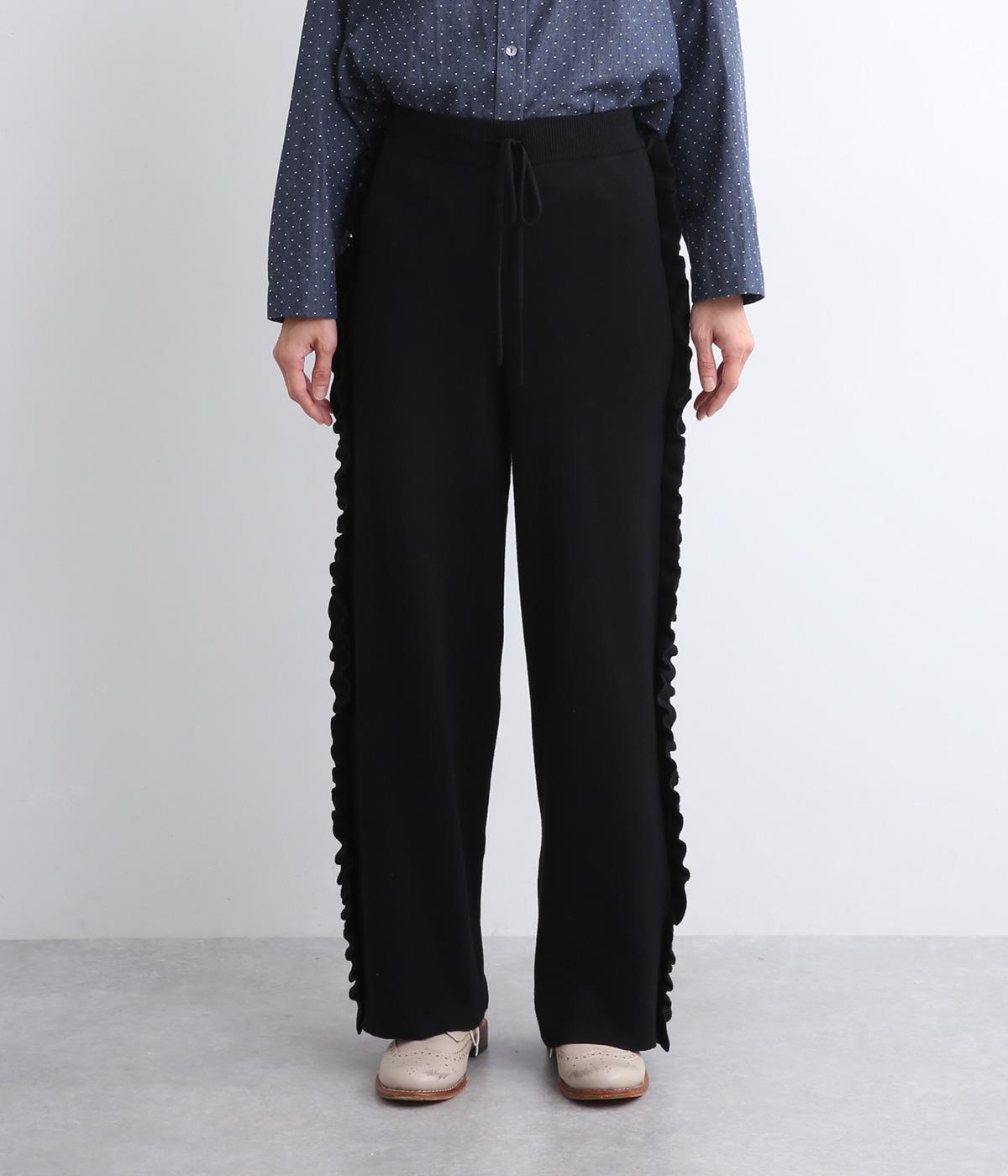 脇についたニットフリルが着こなしのアクセントになるパンツです。すとんと落ちるストレートラインのフルレングス。ウエストはぴったりとフィットする、楽なはき心地のゴム仕立てです。