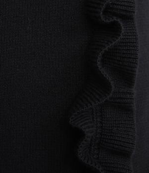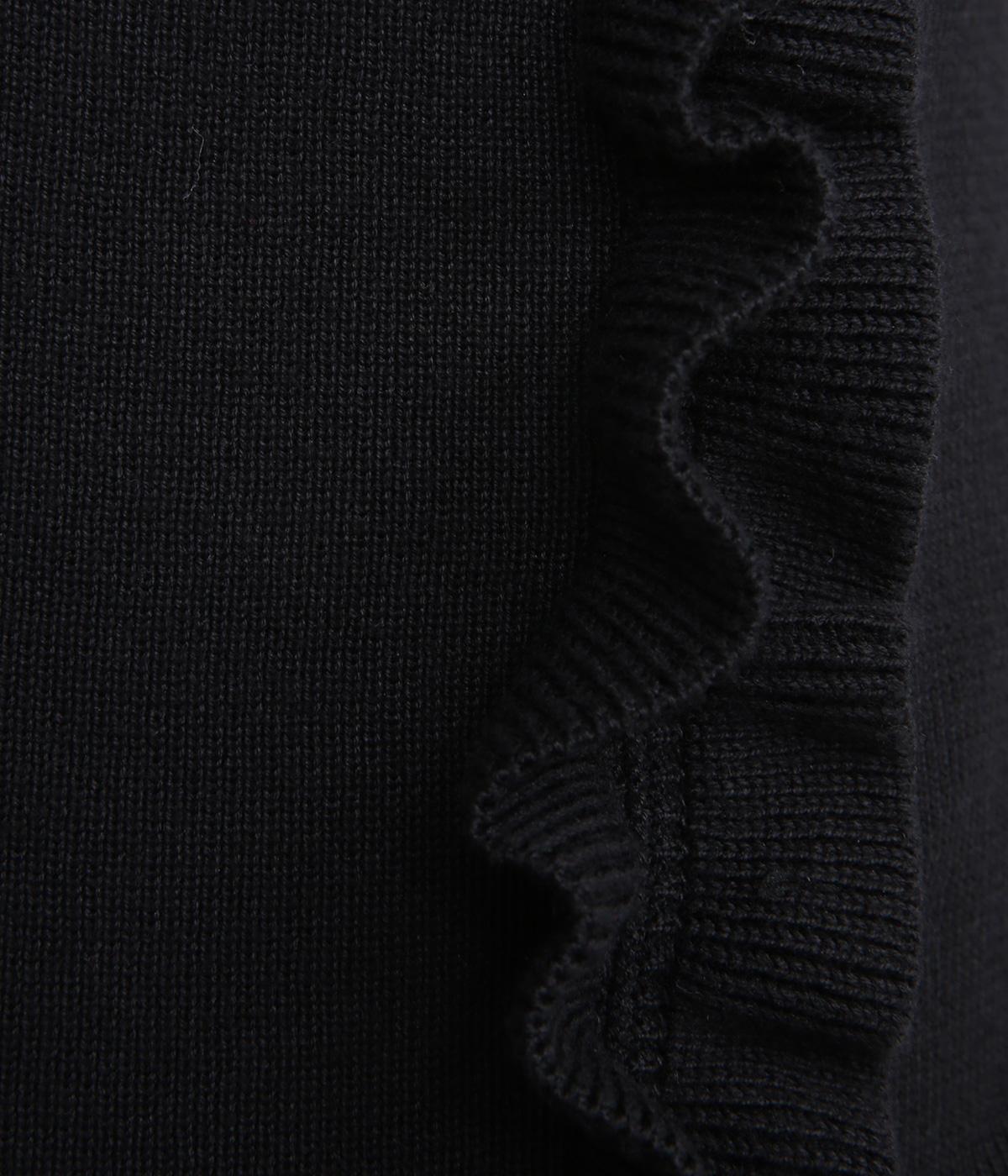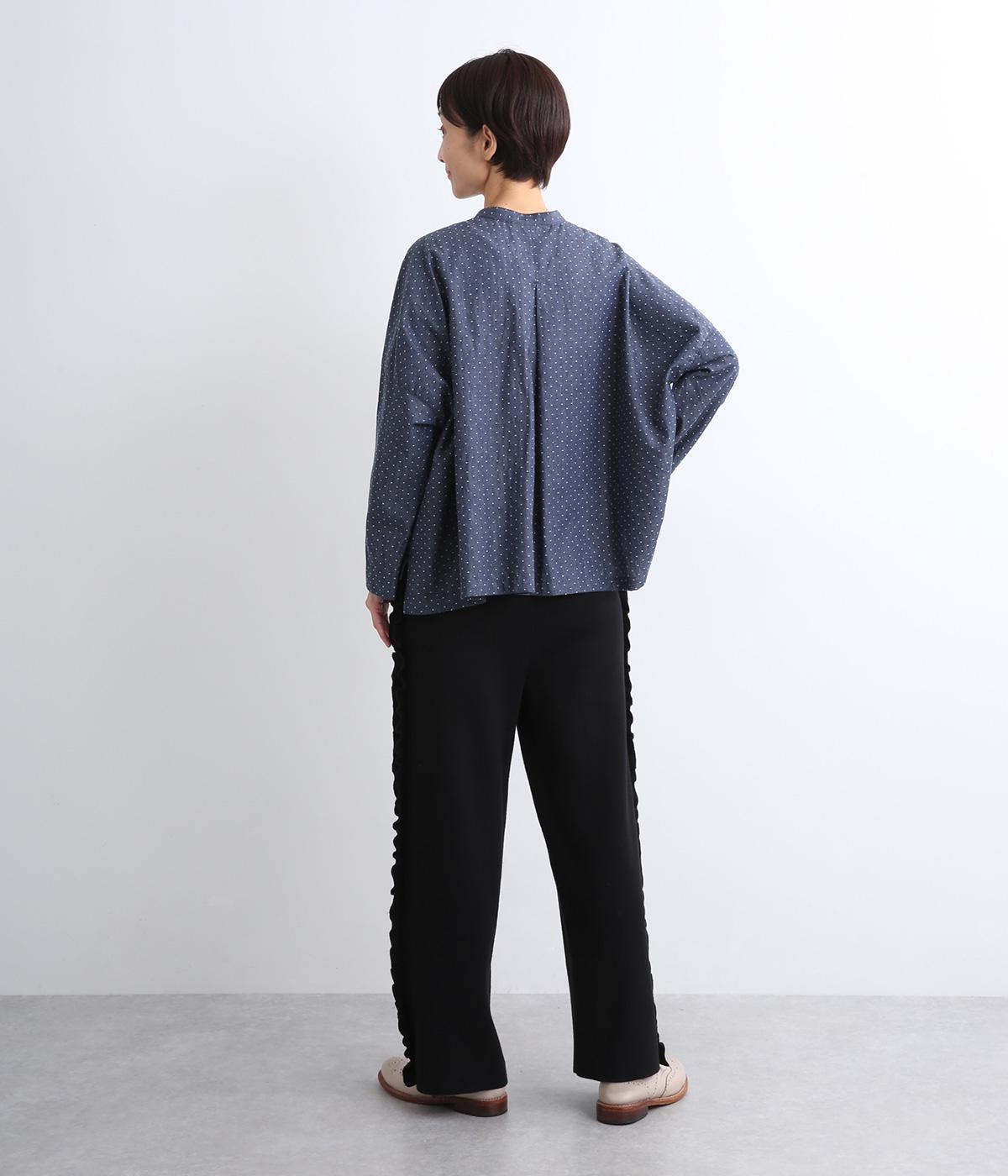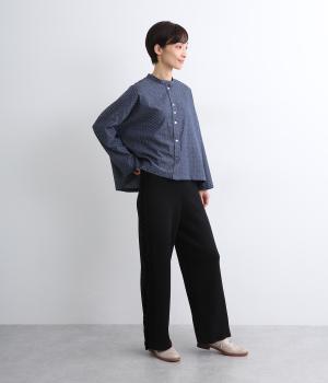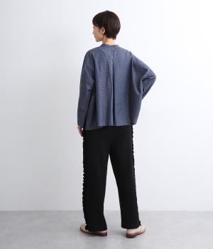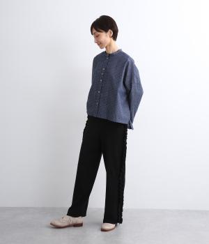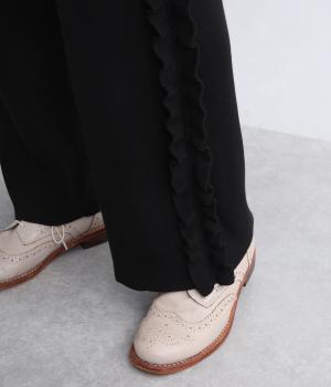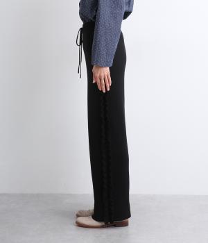脇についたニットフリルが着こなしのアクセントになるパンツです。すとんと落ちるストレートラインのフルレングス。ウエストはぴったりとフィットする、楽なはき心地のゴム仕立てです。