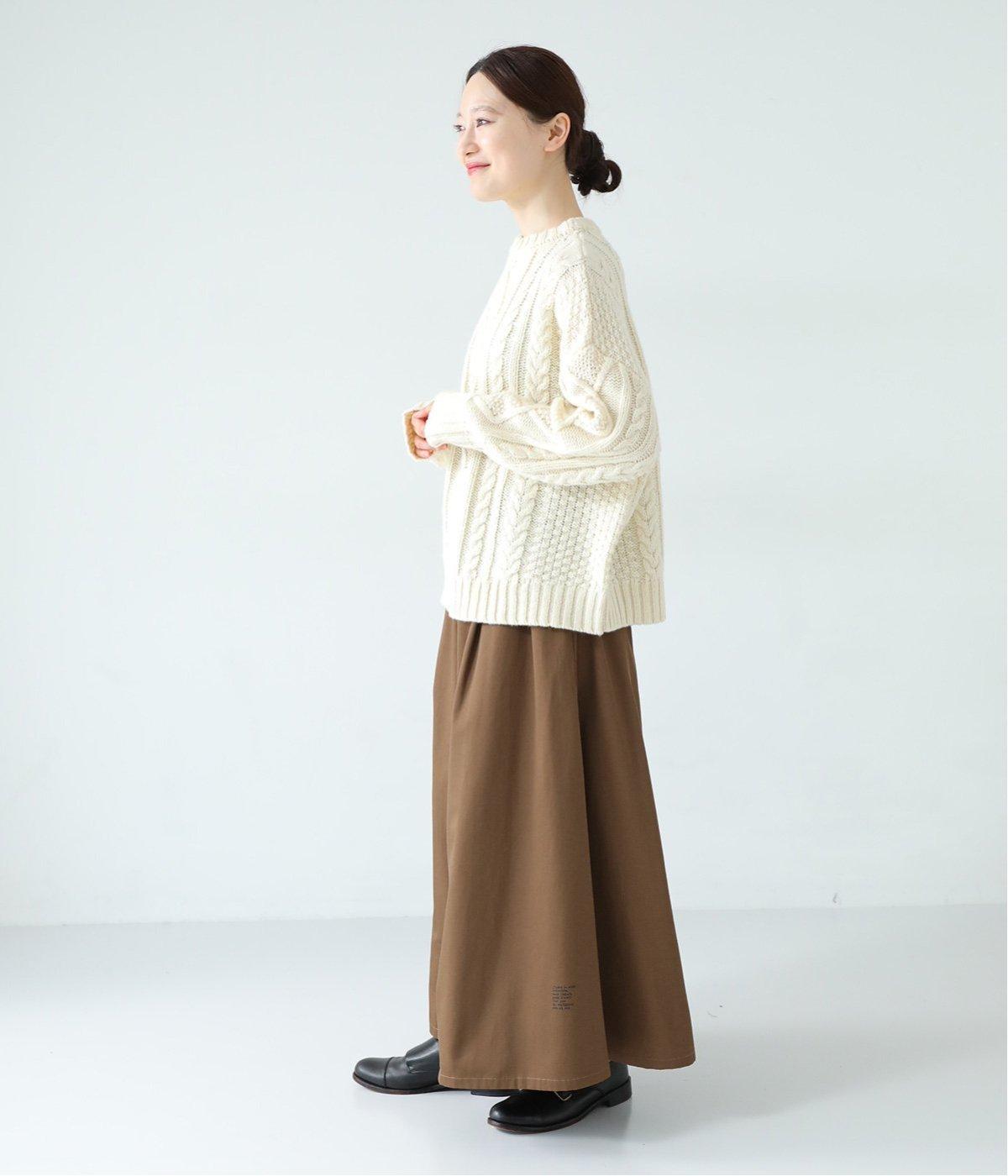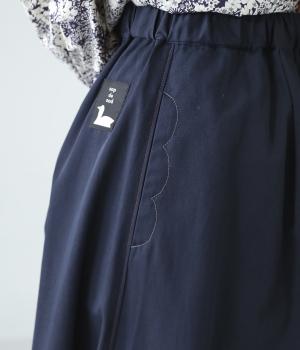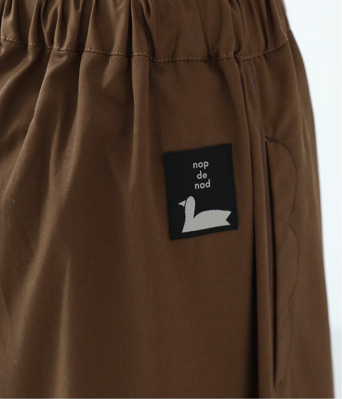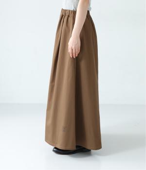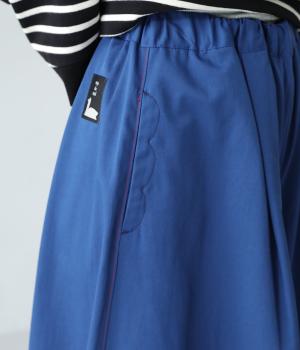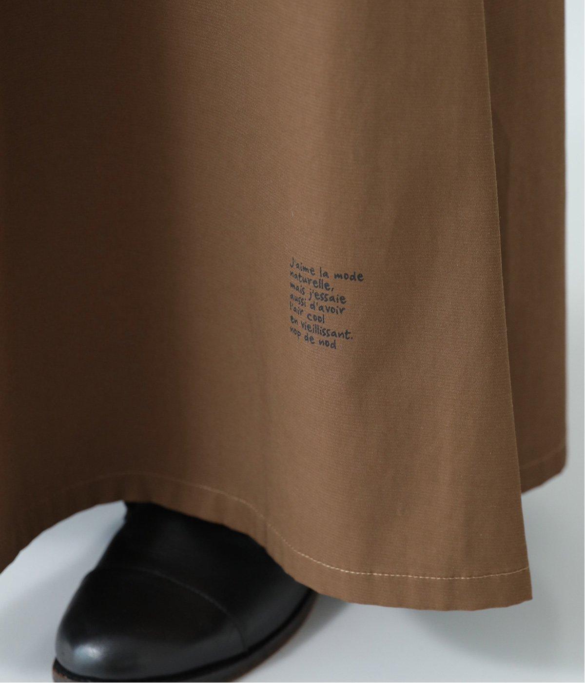 体のラインをカバーしつつ優雅な着こなしを叶えるフレアーシルエットのマキシパンツ。左裾にロゴを、右後ろ裾に文字プリントをあしらってアクセントにしています。さらにポケットのステッチや右後ろのスワンネームなど、細かなこだわりが詰まった一着。総ゴム仕様のウエストには内紐をプラスしています。