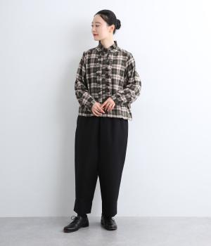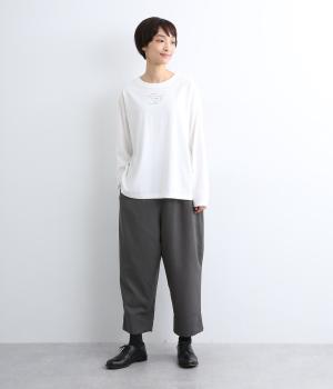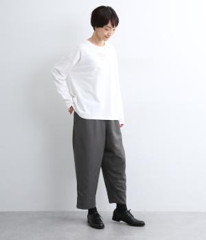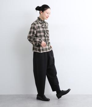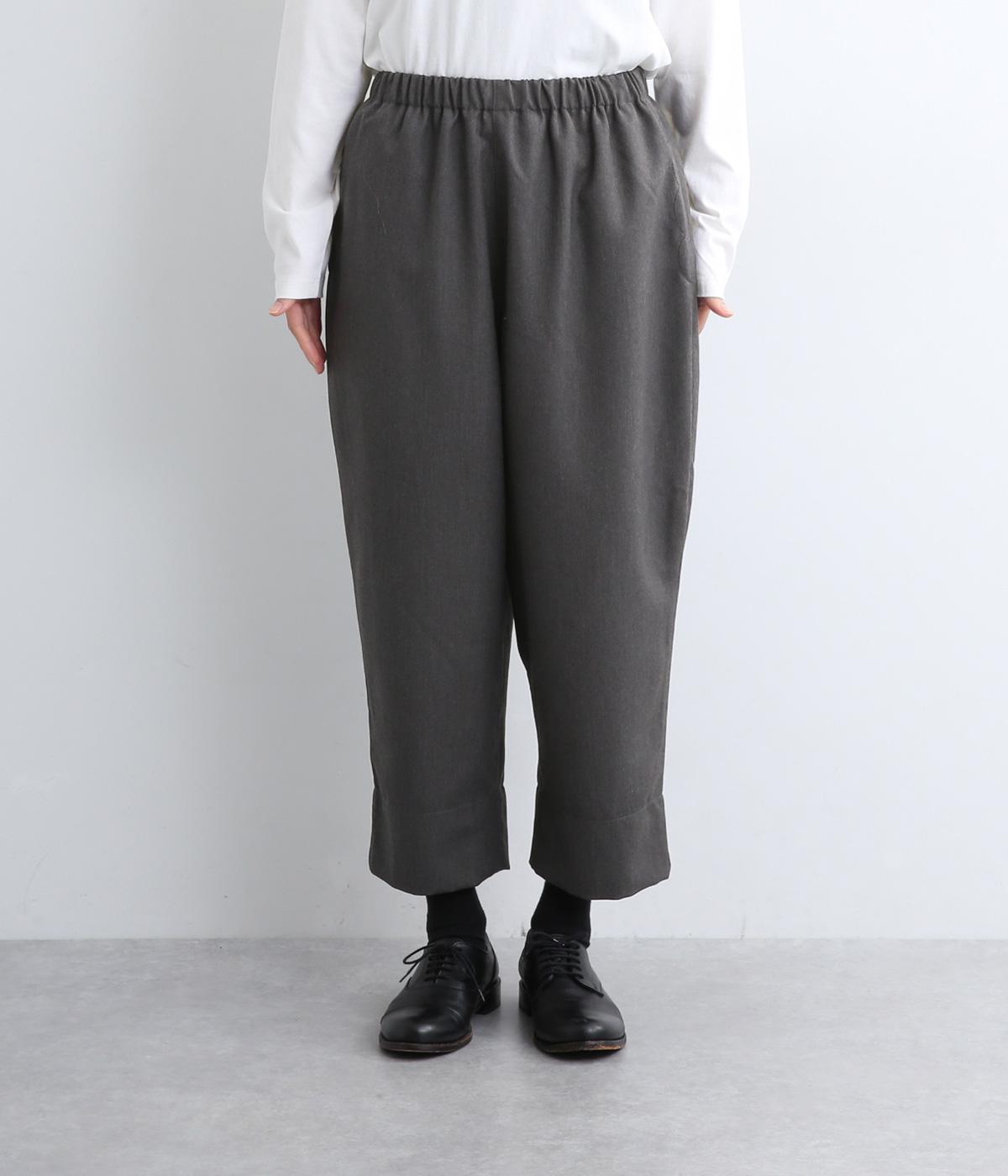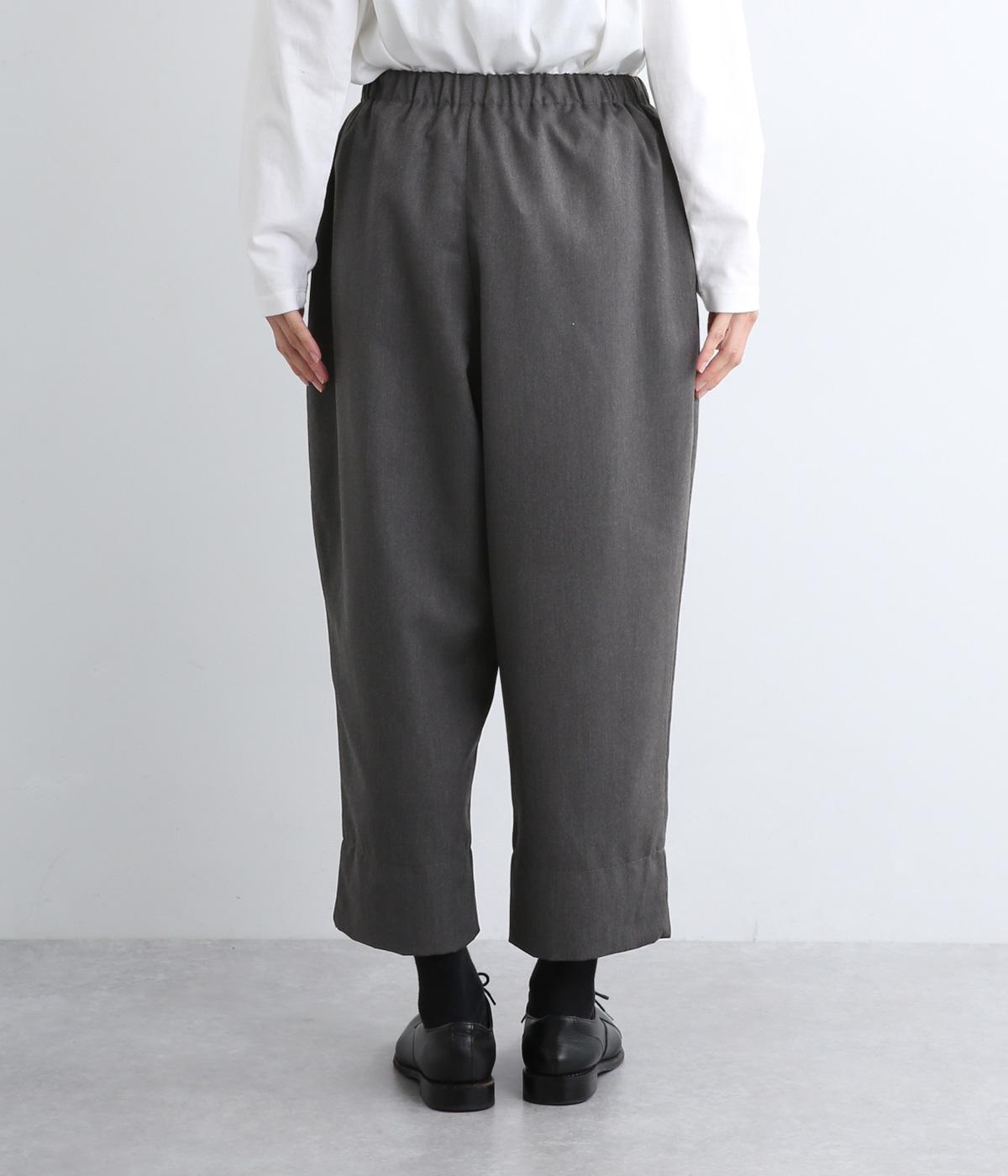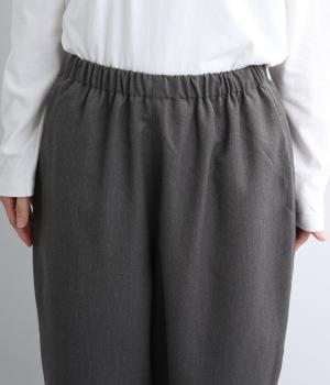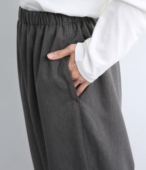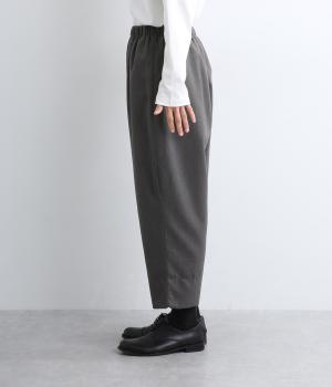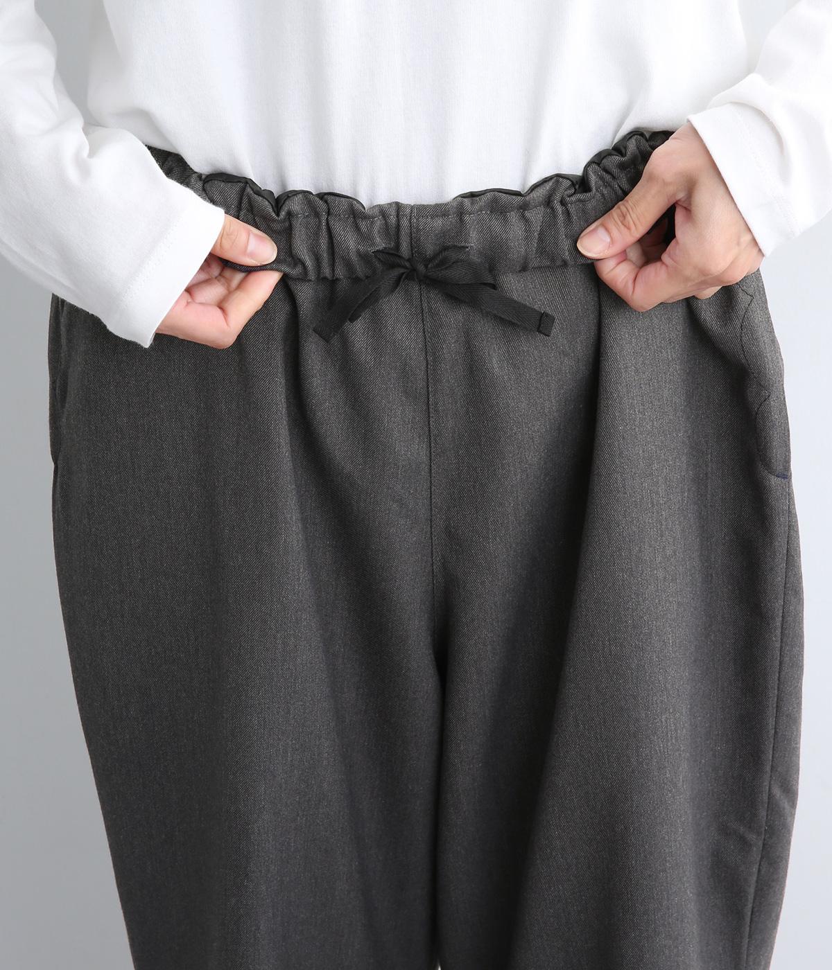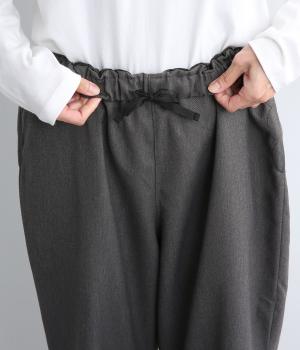 腰まわりから太ももまでゆったりとさせ、裾をきゅっと細くしたテーパードラインが特徴。丈を短めに設定して足元にすっきりとした抜け感をプラスしました。シューズやソックスが映えるので、足元のコーディネートをたのしめるのが◎。ウエストは総ゴム仕様で、フィット感を高める内紐つきです。