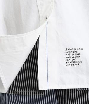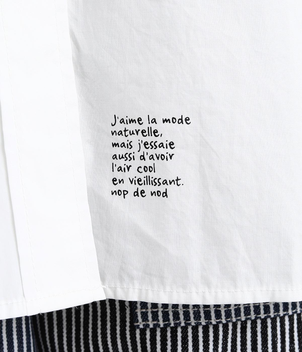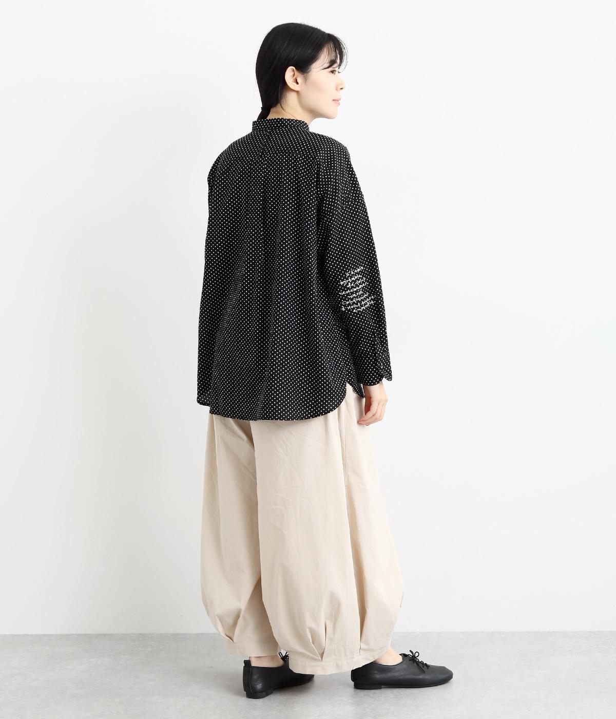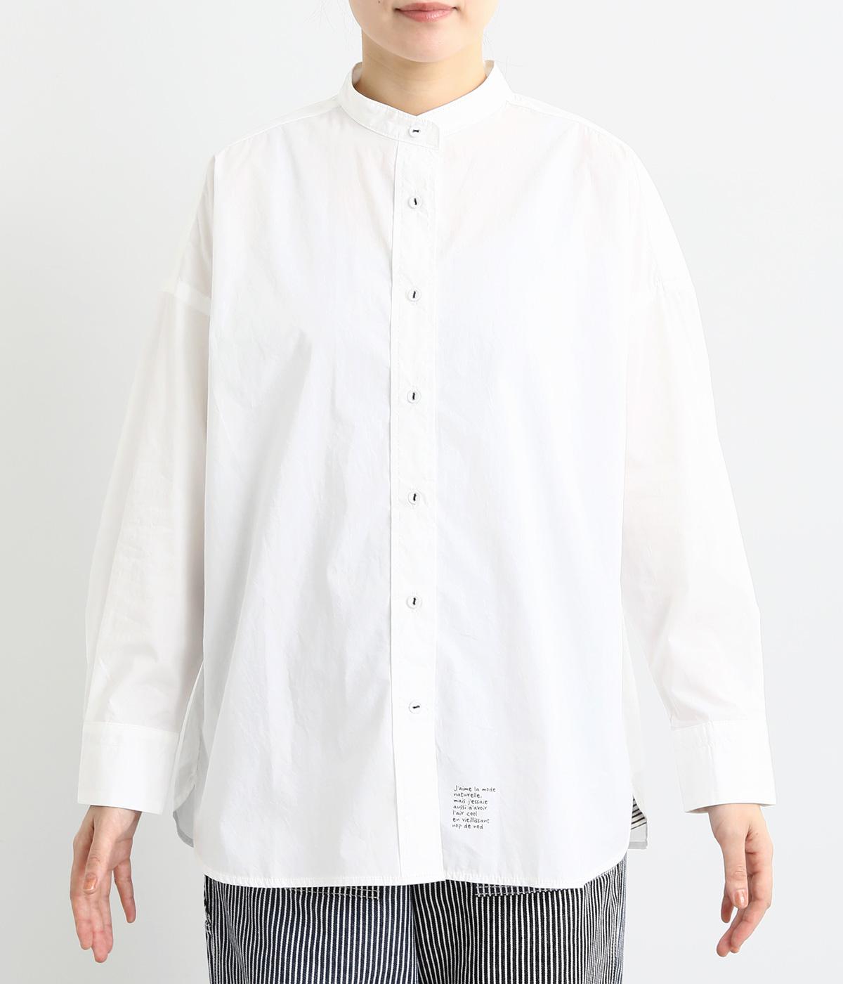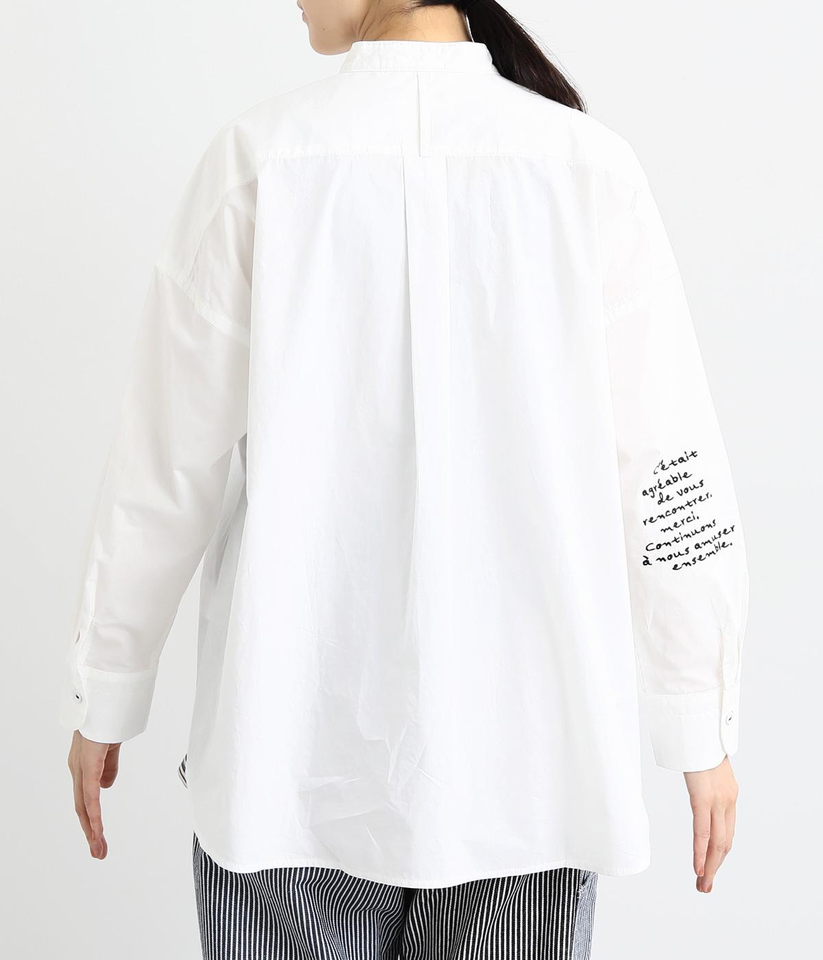 ステッチの効いたバンドカラーと、太めの前立てのトラディショナルなブラウス。右ひじには文字刺しゅうを、前裾にはプリントをあしらいました。ゆったりしつつも大きすぎない絶妙なシルエットも、大人らしく着こなせるポイント。