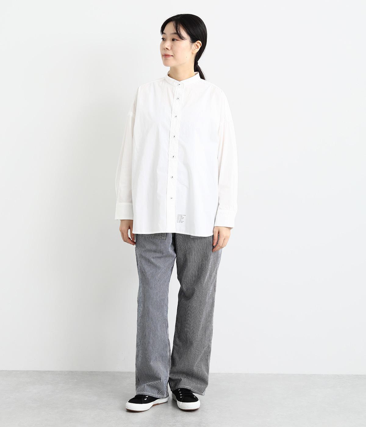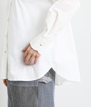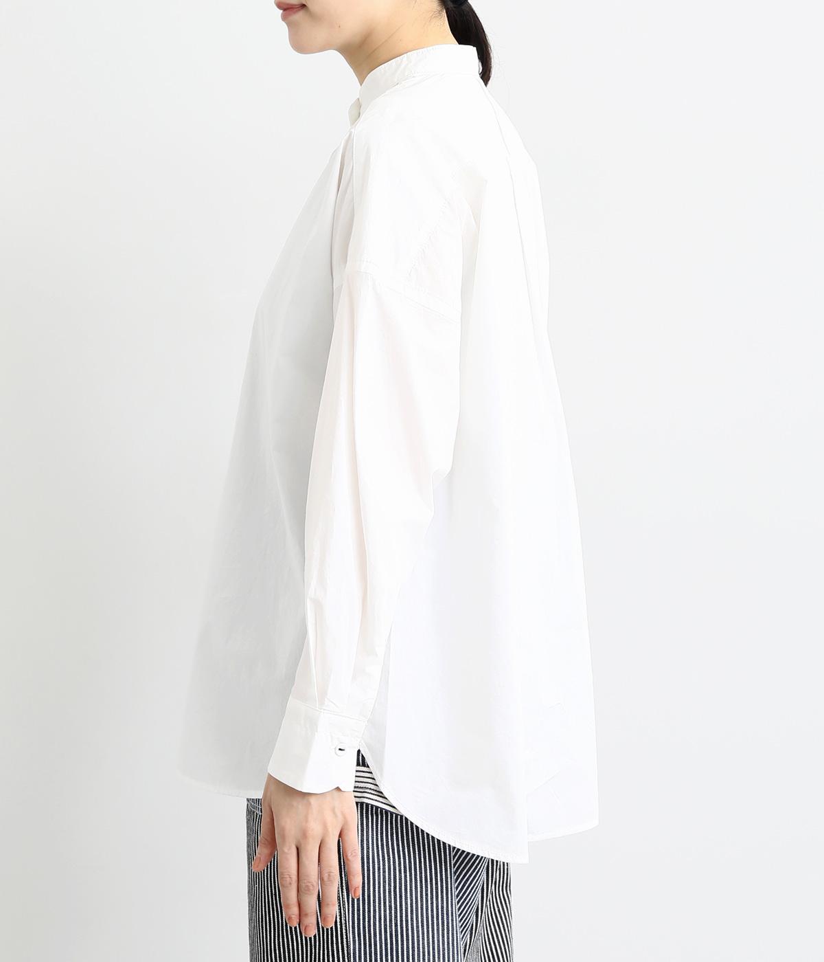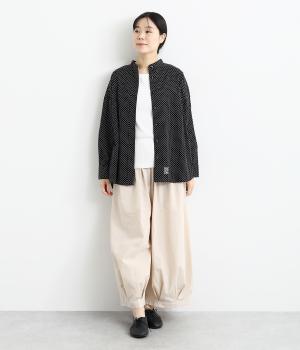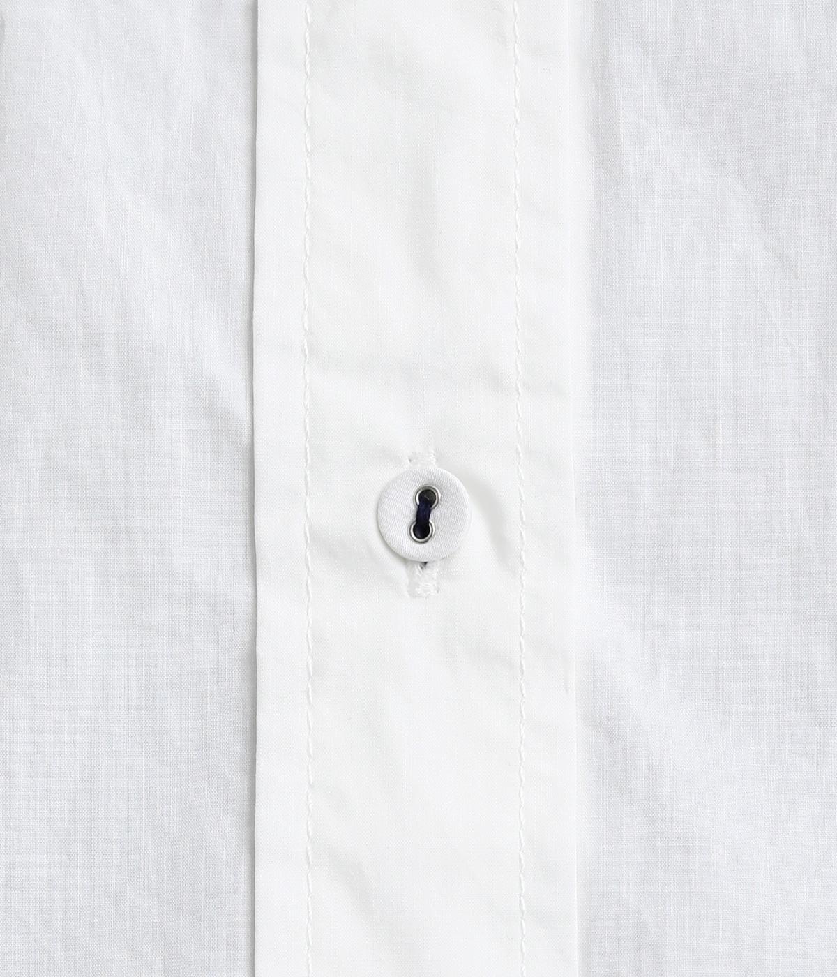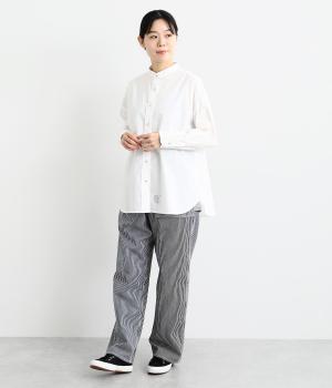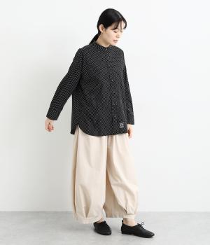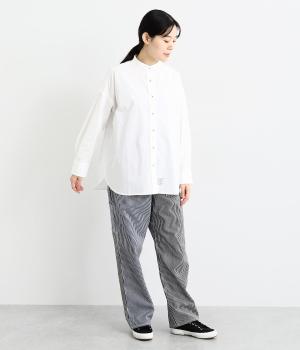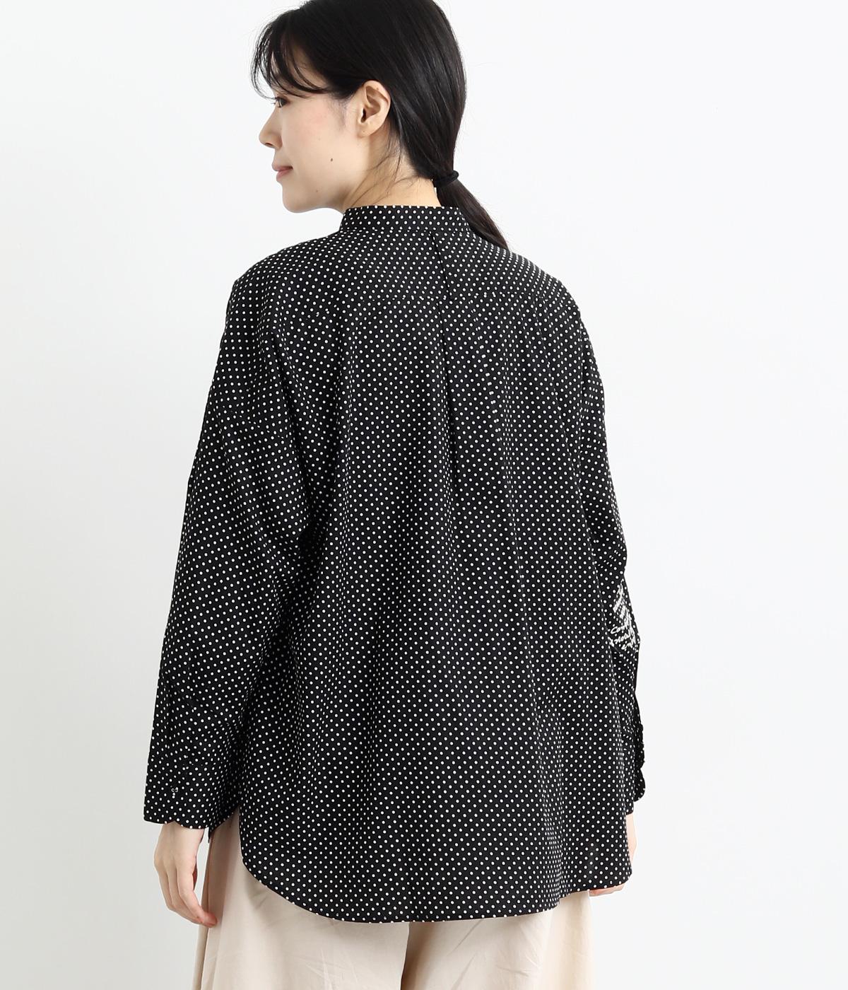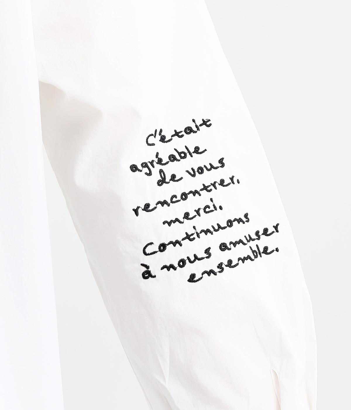 ステッチの効いたバンドカラーと、太めの前立てのトラディショナルなブラウス。右ひじには文字刺しゅうを、前裾にはプリントをあしらいました。ゆったりしつつも大きすぎない絶妙なシルエットも、大人らしく着こなせるポイント。