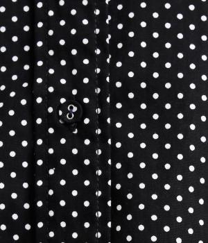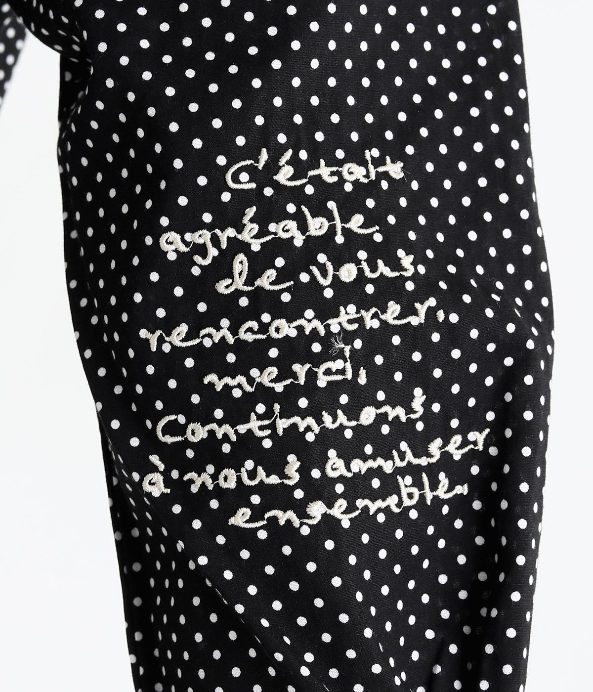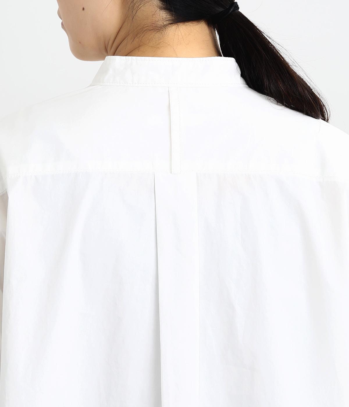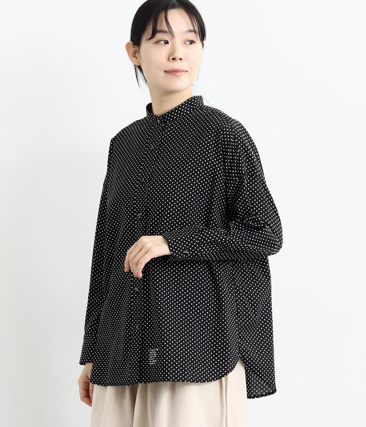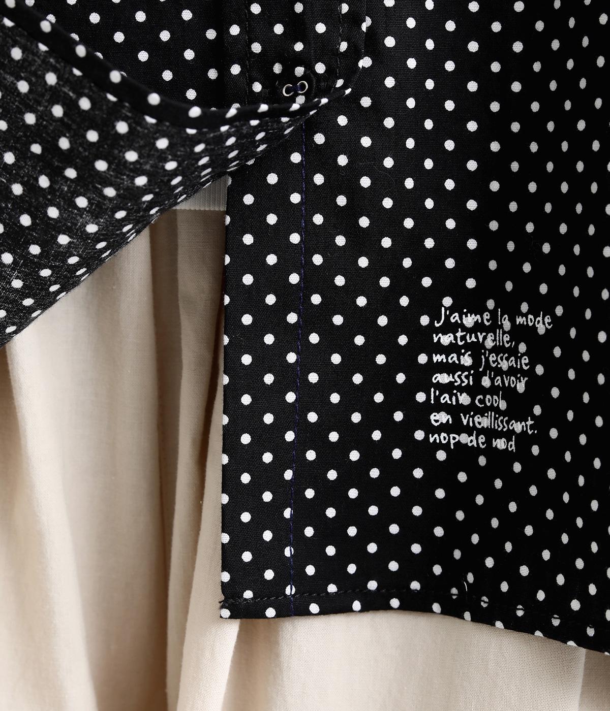ステッチの効いたバンドカラーと、太めの前立てのトラディショナルなブラウス。右ひじには文字刺しゅうを、前裾にはプリントをあしらいました。ゆったりしつつも大きすぎない絶妙なシルエットも、大人らしく着こなせるポイント。