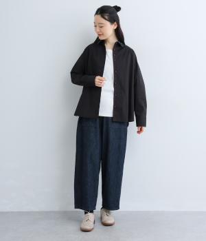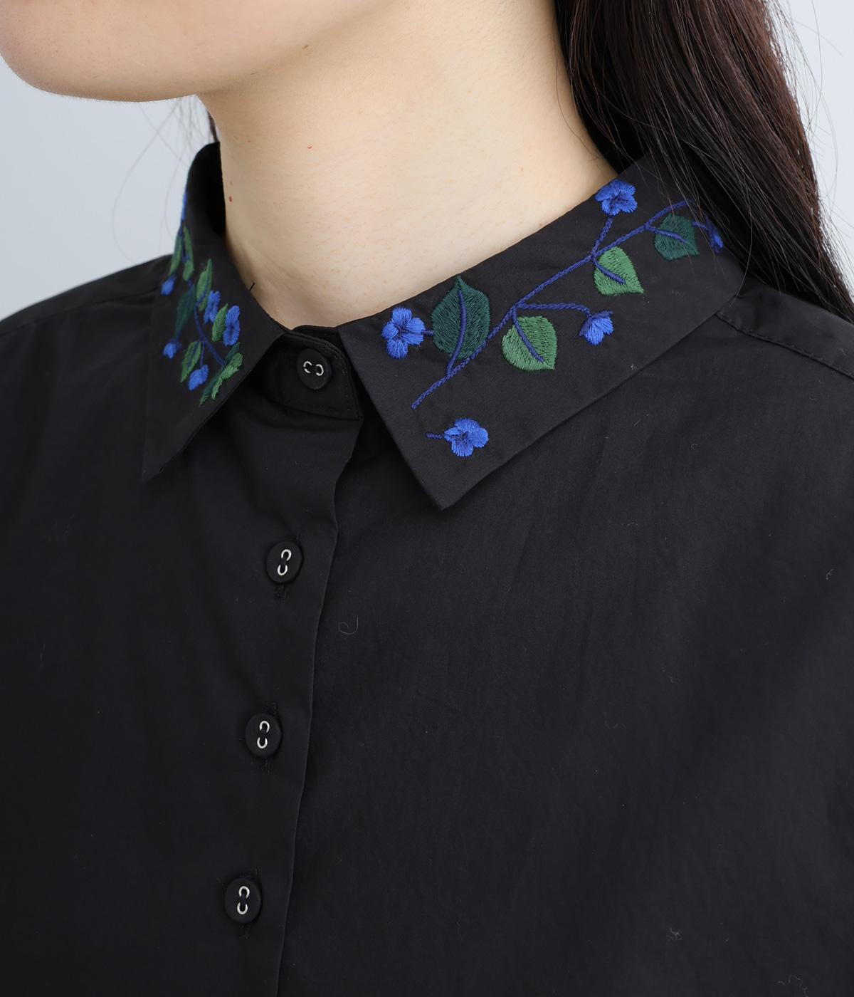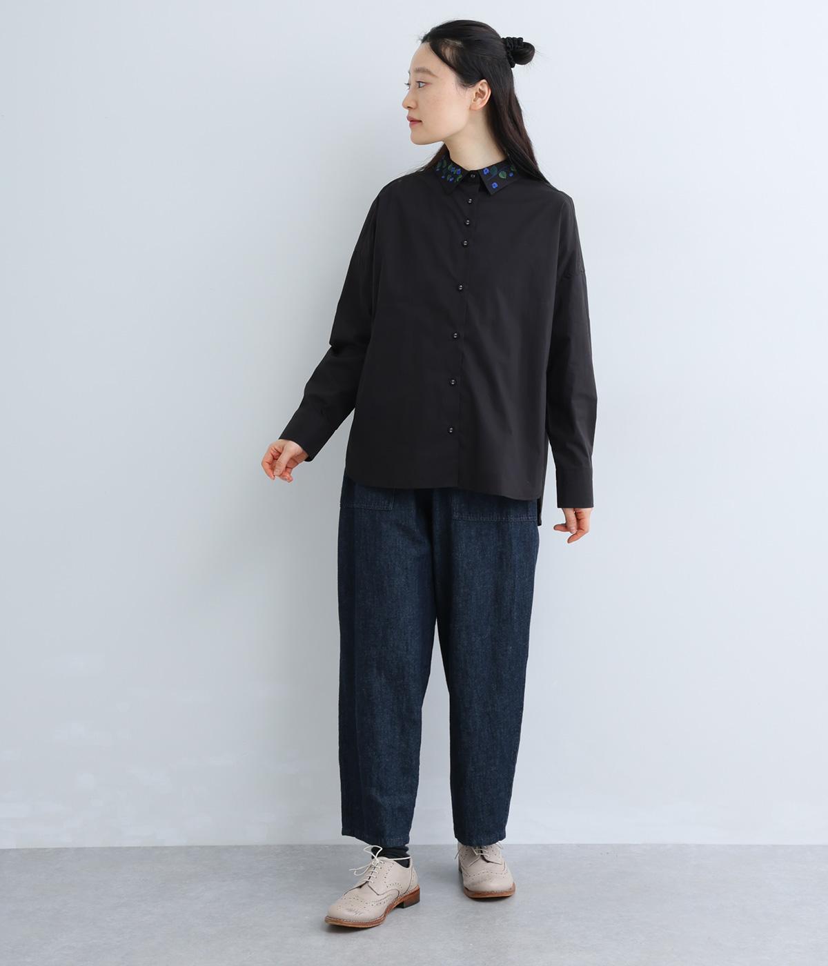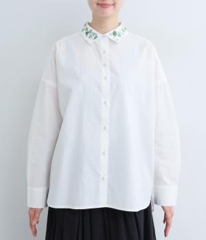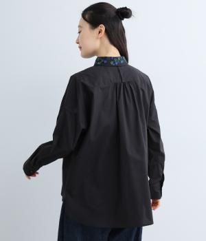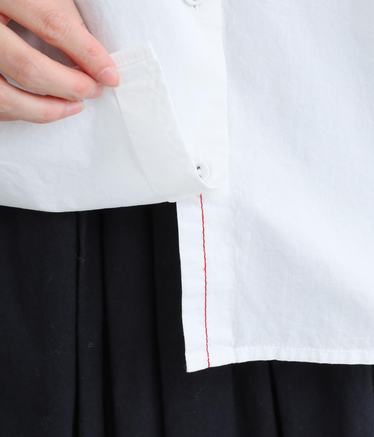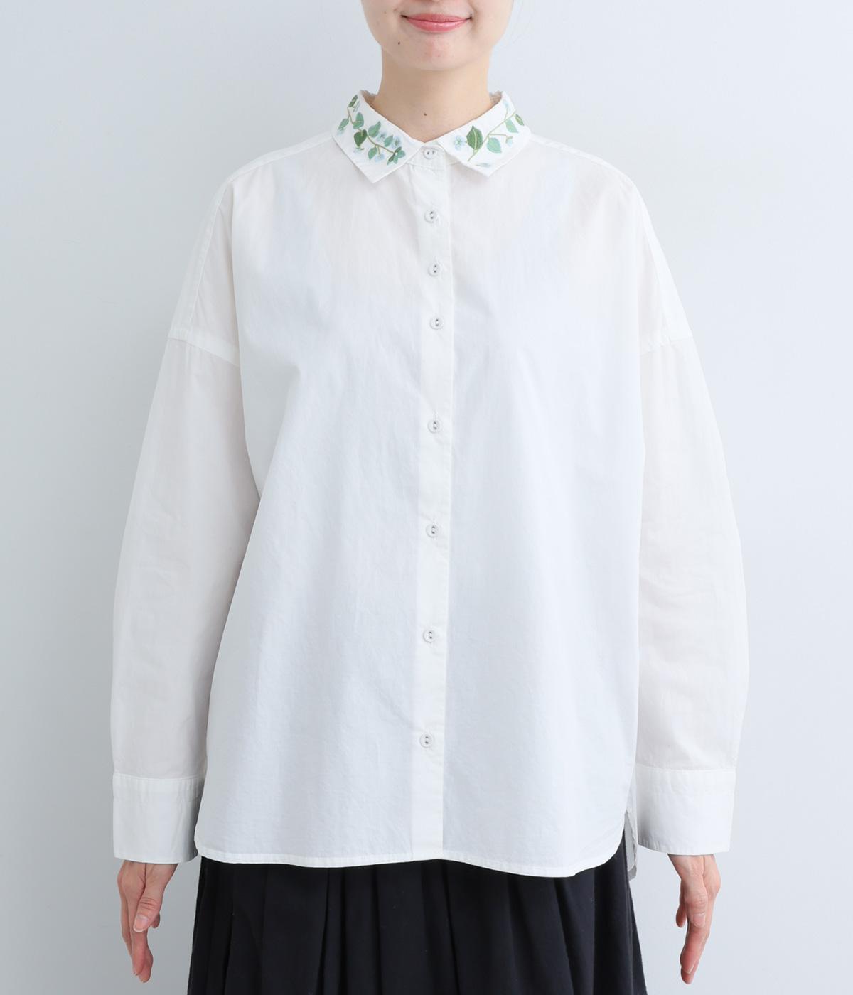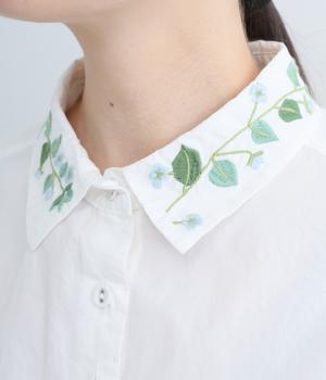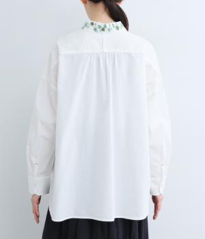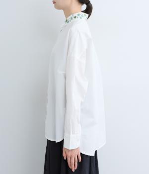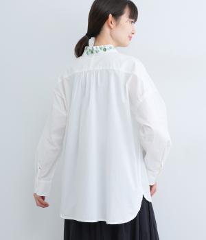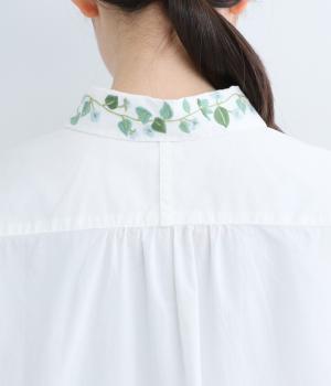 襟の草花刺しゅうが上品さを引き立て、前後差をつけた裾がこなれ感を演出します。前立ての裏にほどこした配色ステッチがさりげないアクセントに。デイリーのスタイリングになじむシンプルな佇まいながら、さりげない個性が光る一枚です。