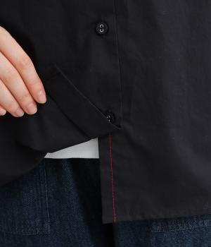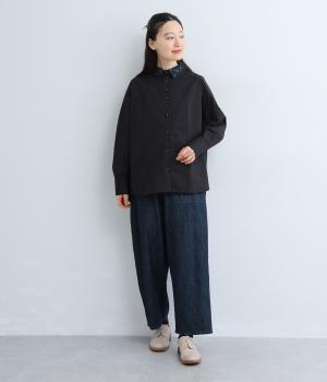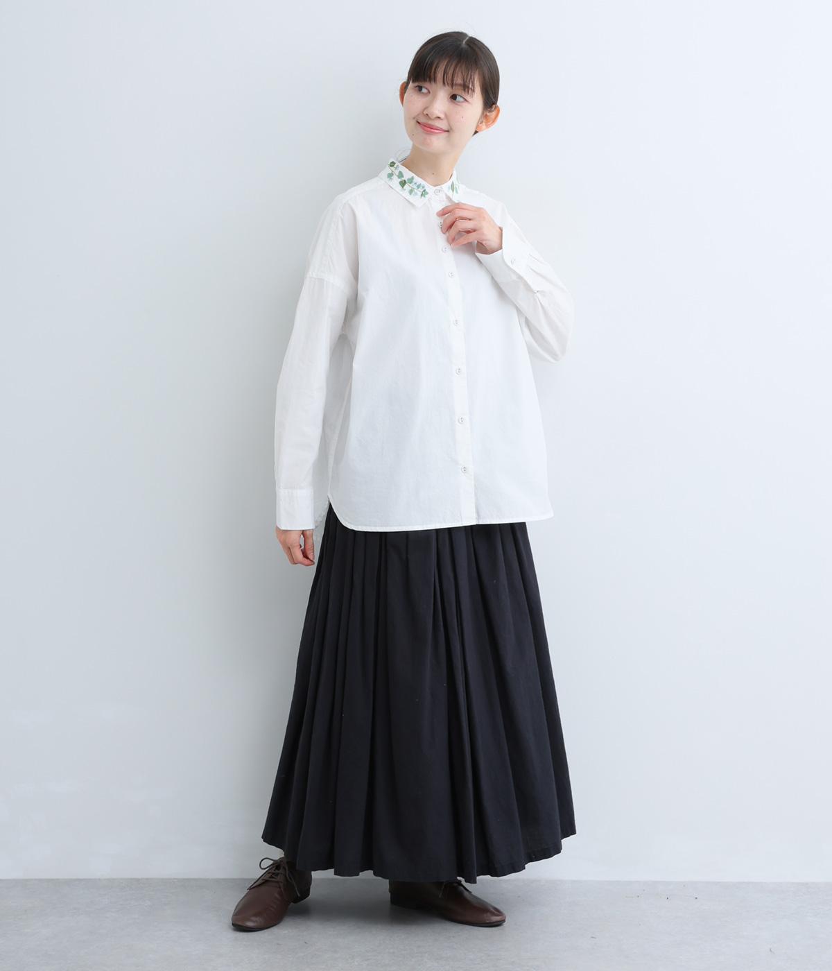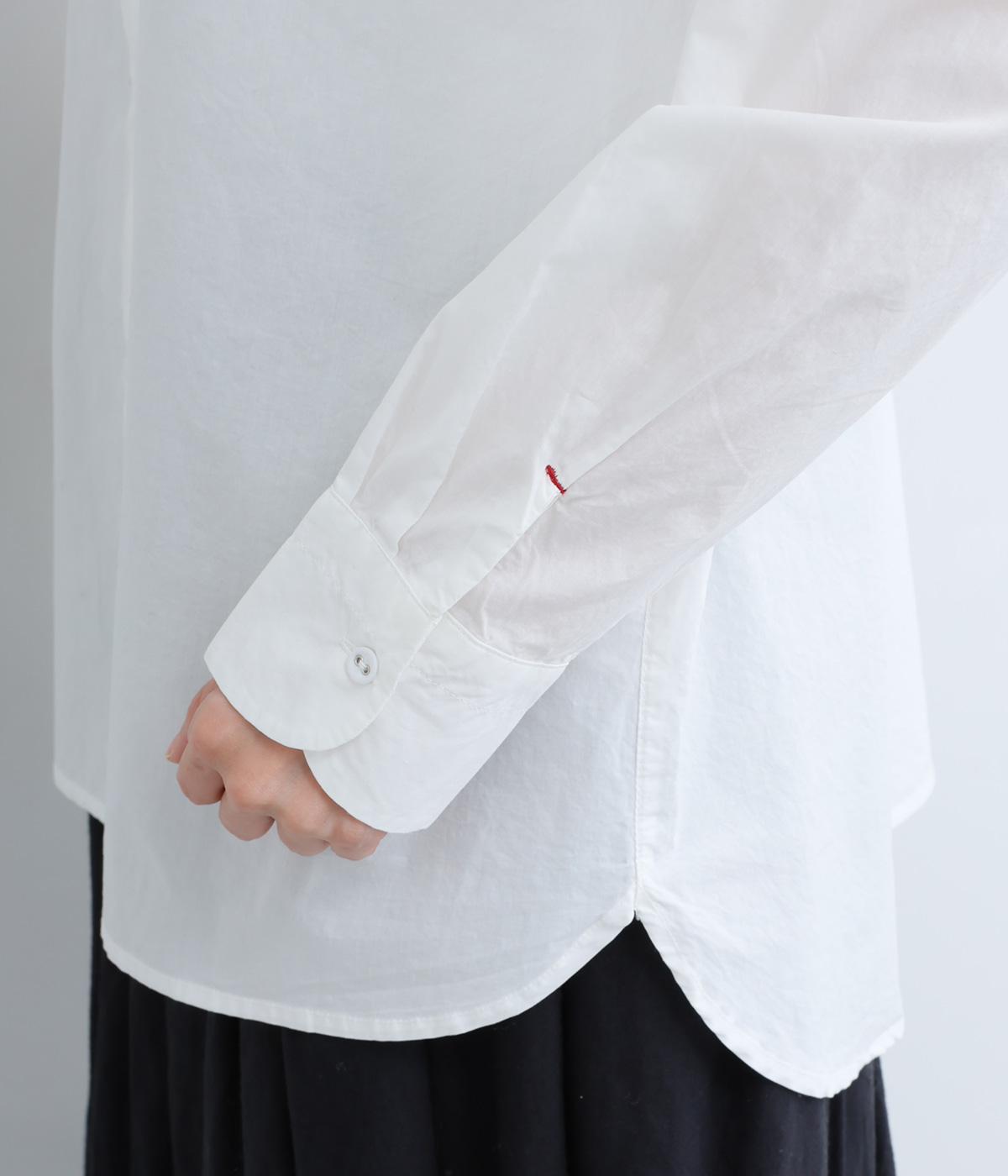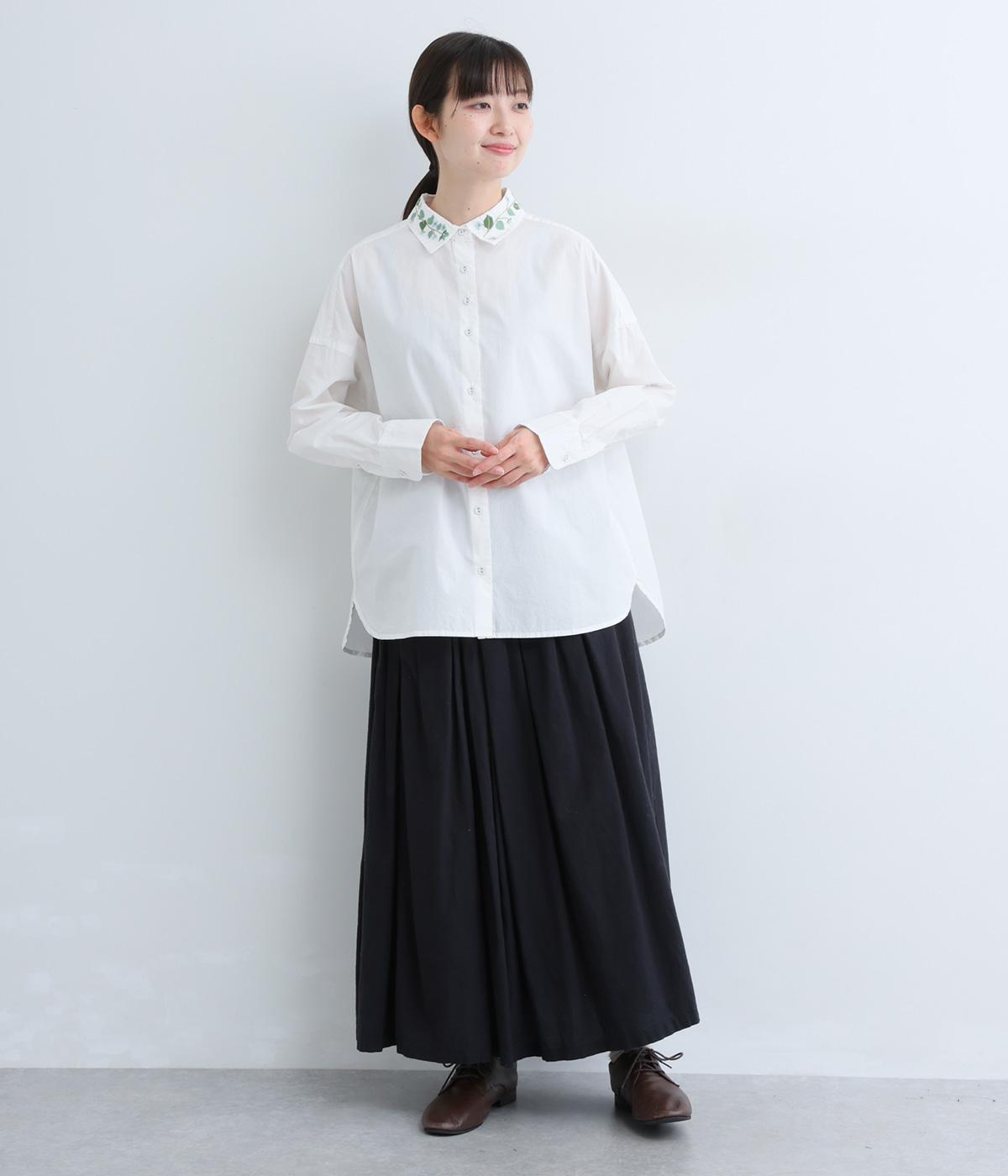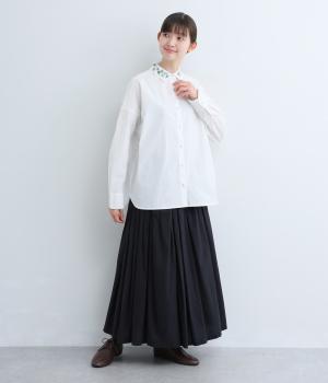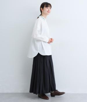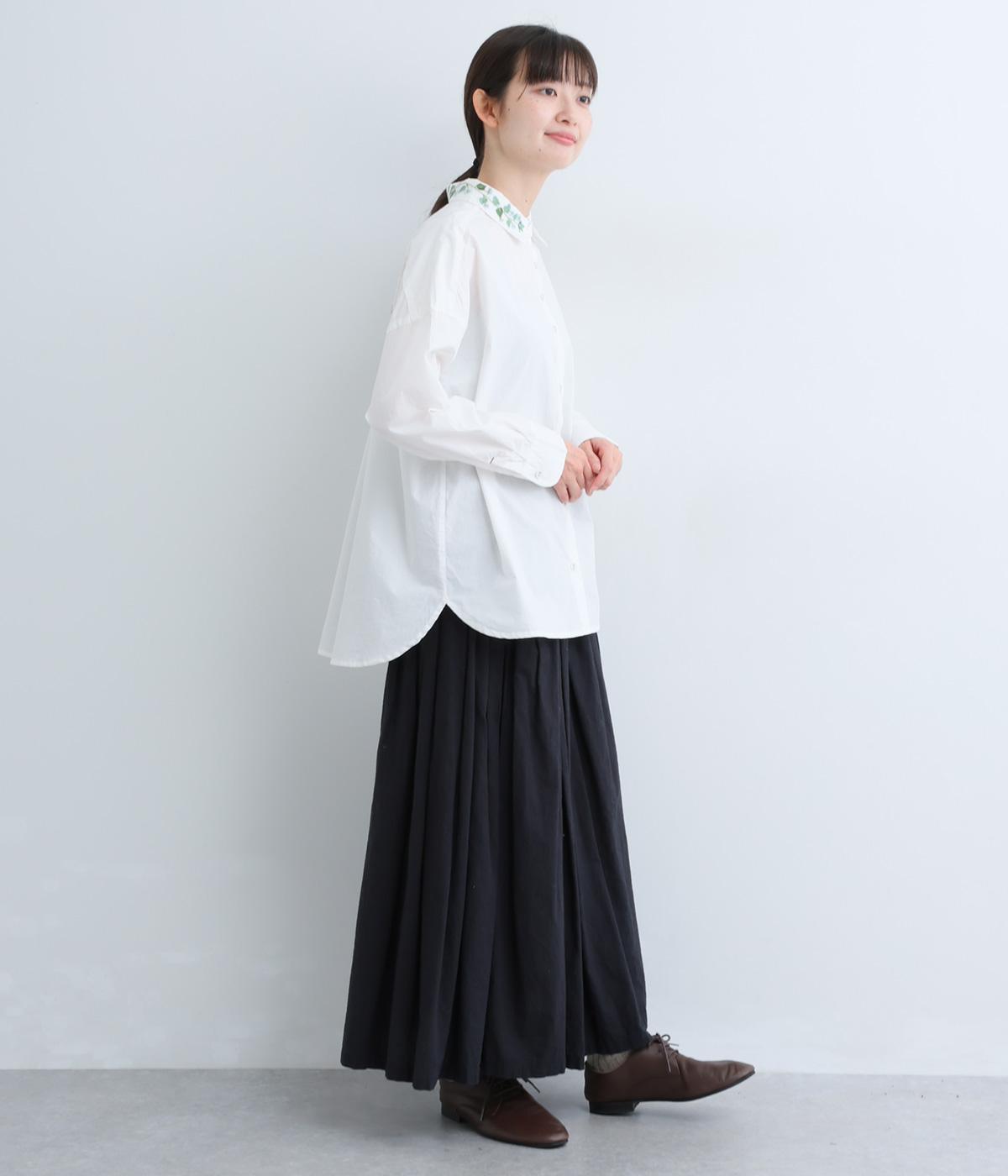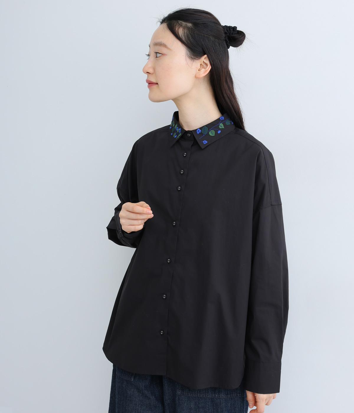 襟の草花刺しゅうが上品さを引き立て、前後差をつけた裾がこなれ感を演出します。前立ての裏にほどこした配色ステッチがさりげないアクセントに。デイリーのスタイリングになじむシンプルな佇まいながら、さりげない個性が光る一枚です。