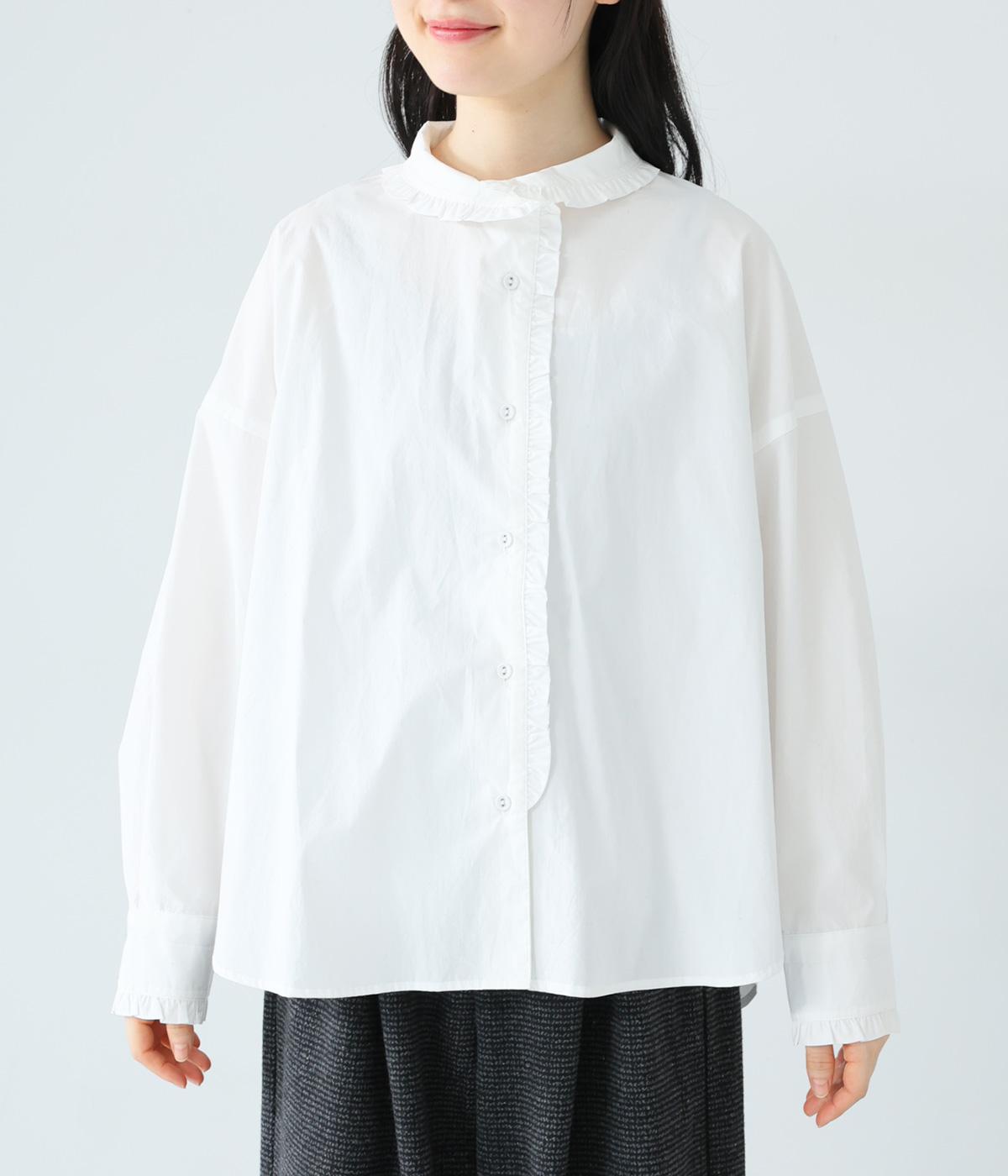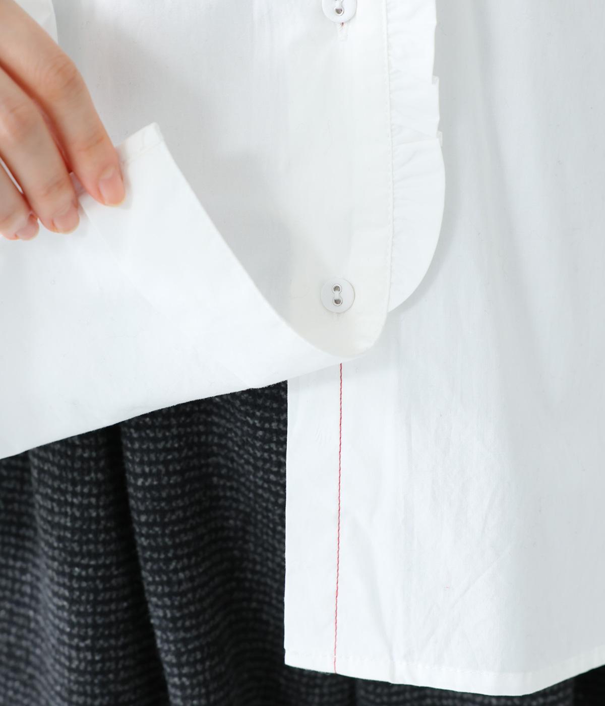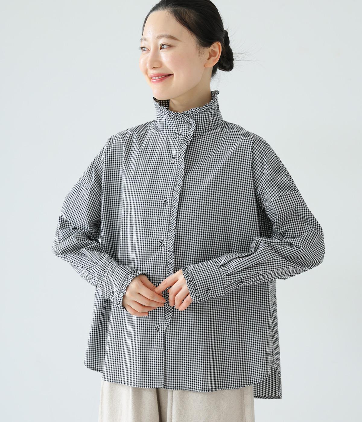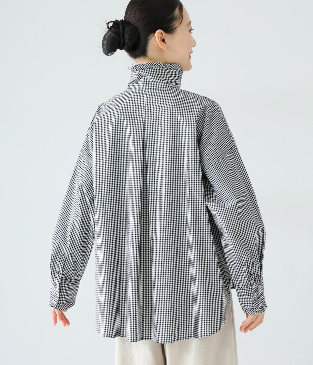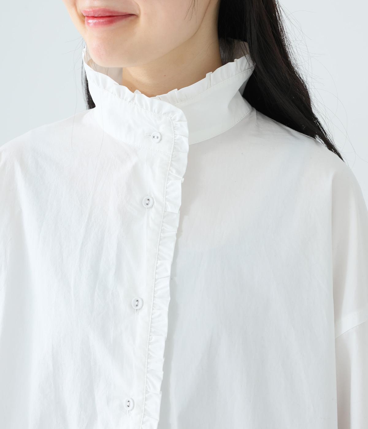 コーディネートに大人の甘さをプラスする、クラシカルなハイネックフリルシャツ。襟はパタンと折り返しても着用できる2way仕様です。下前立ての配色や共布のくるみボタンなど、ディテールへのこだわりが詰まった一枚。