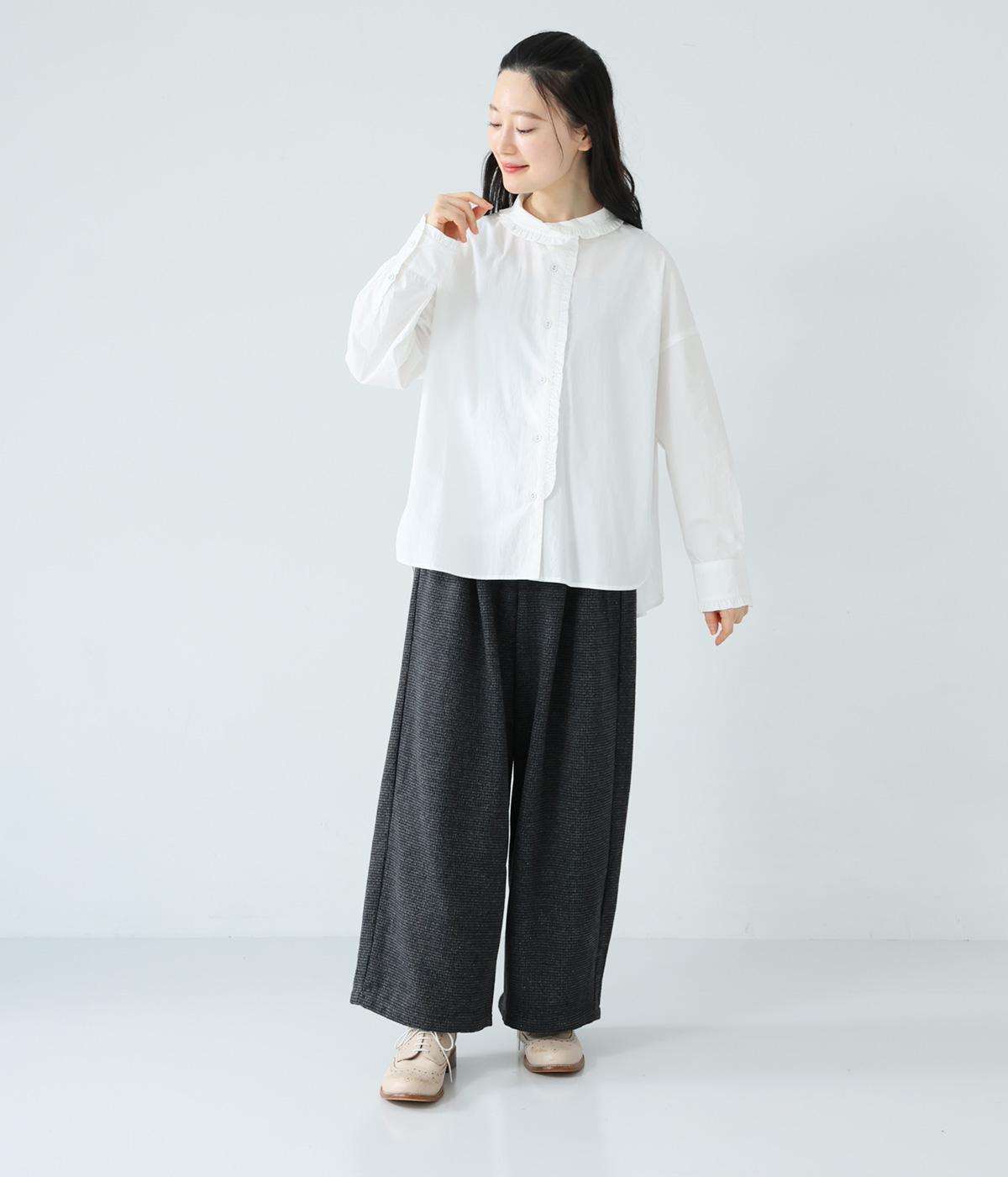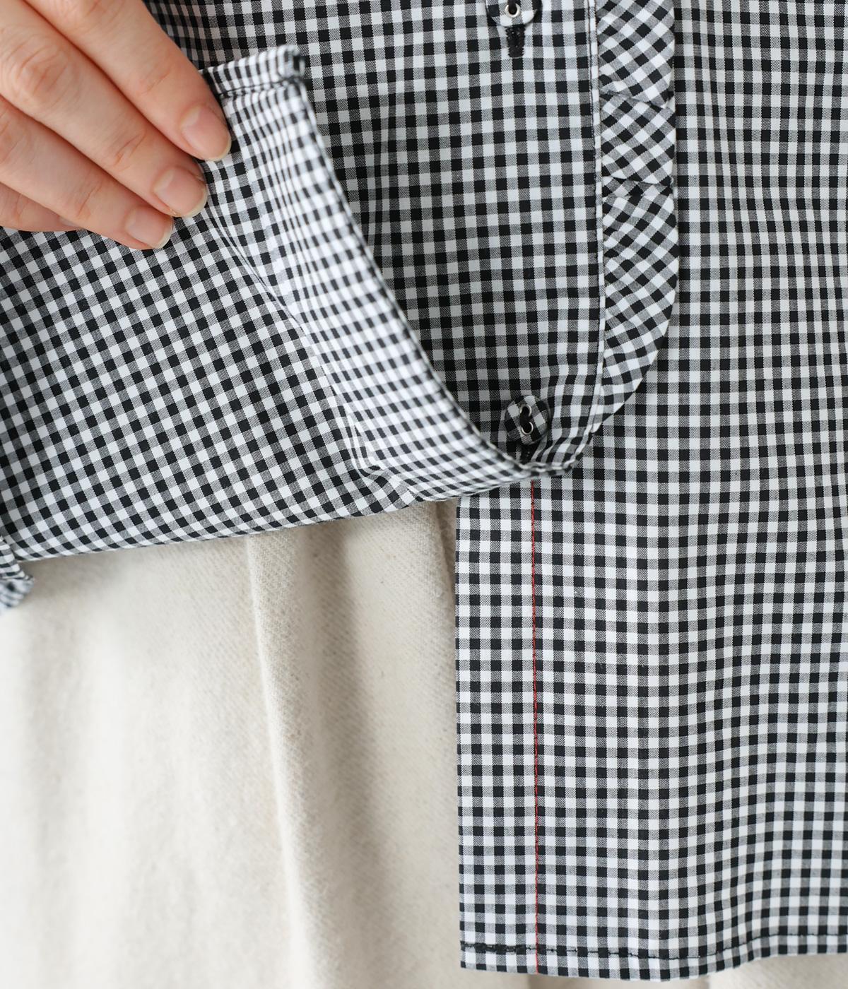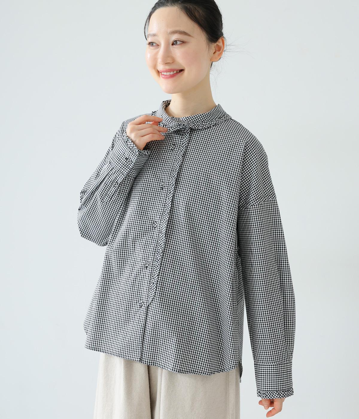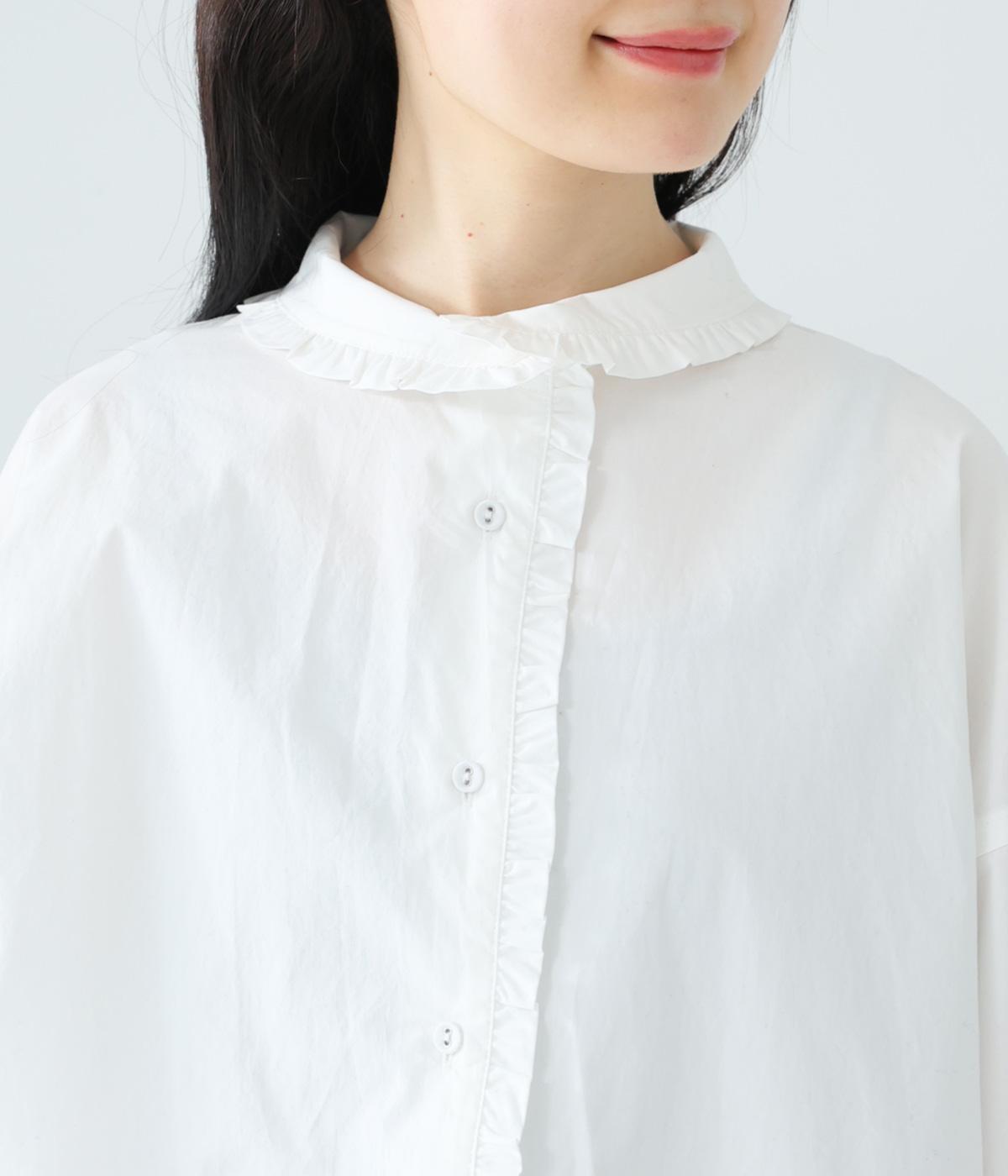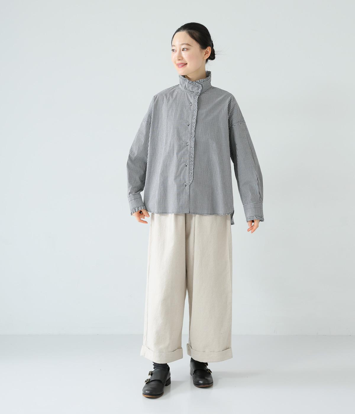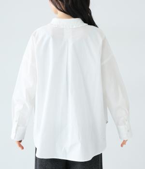 コーディネートに大人の甘さをプラスする、クラシカルなハイネックフリルシャツ。襟はパタンと折り返しても着用できる2way仕様です。下前立ての配色や共布のくるみボタンなど、ディテールへのこだわりが詰まった一枚。