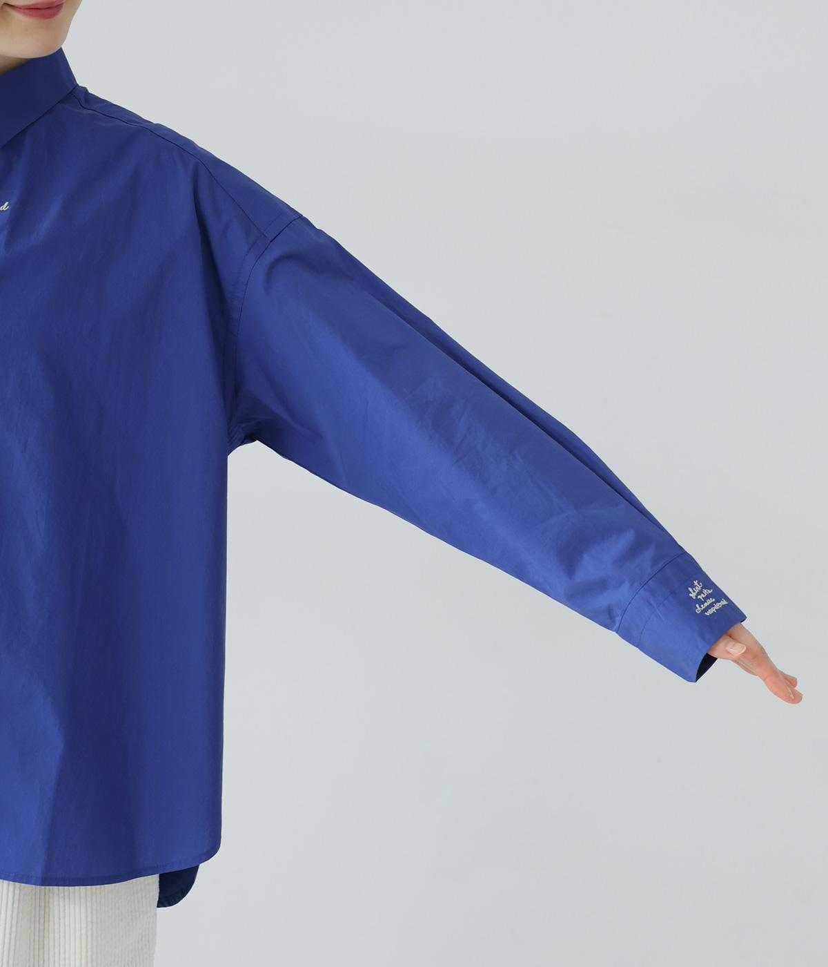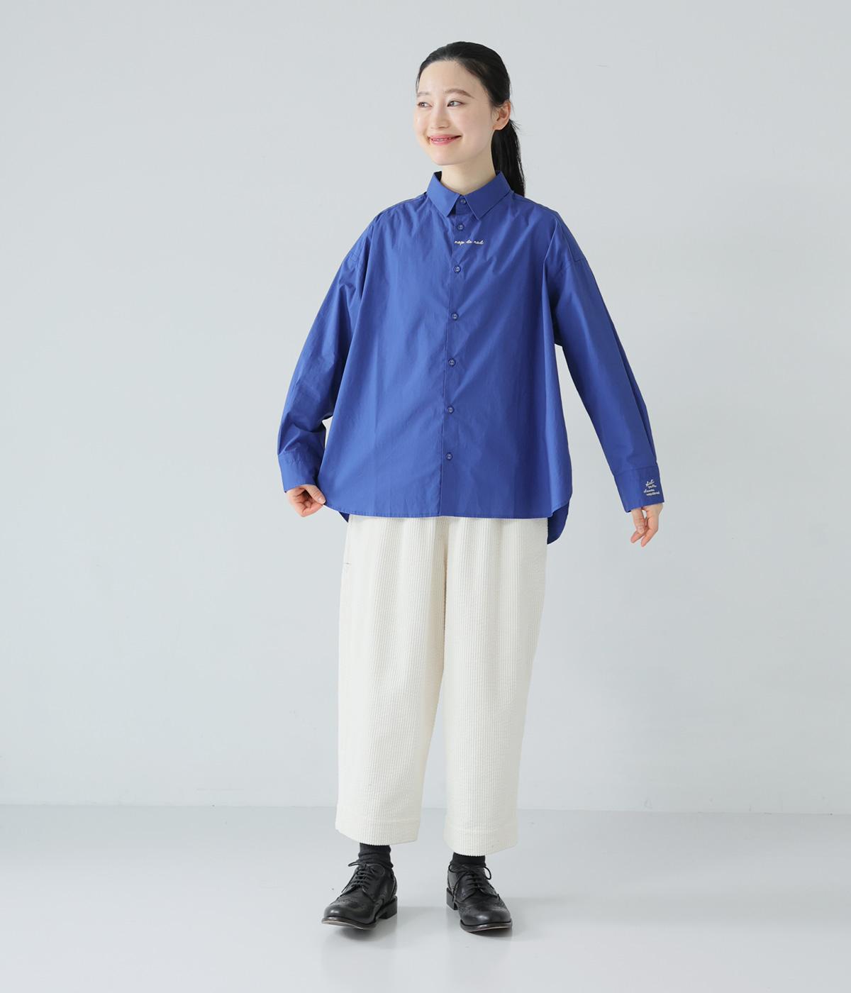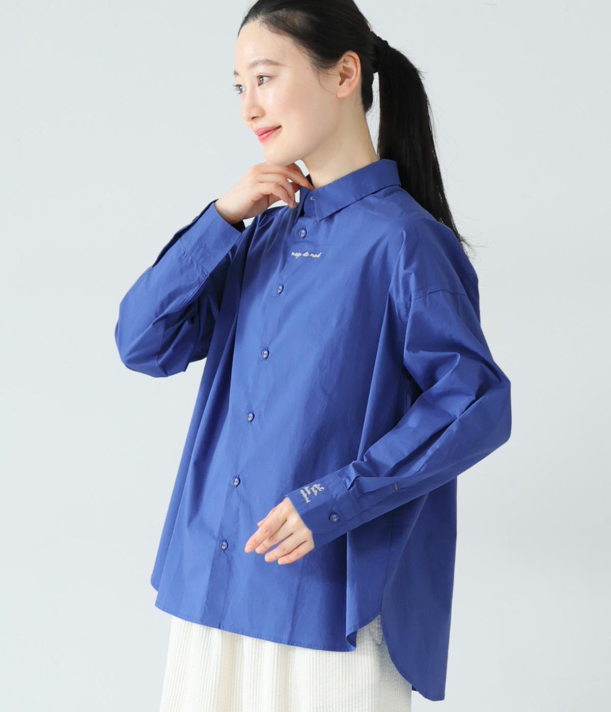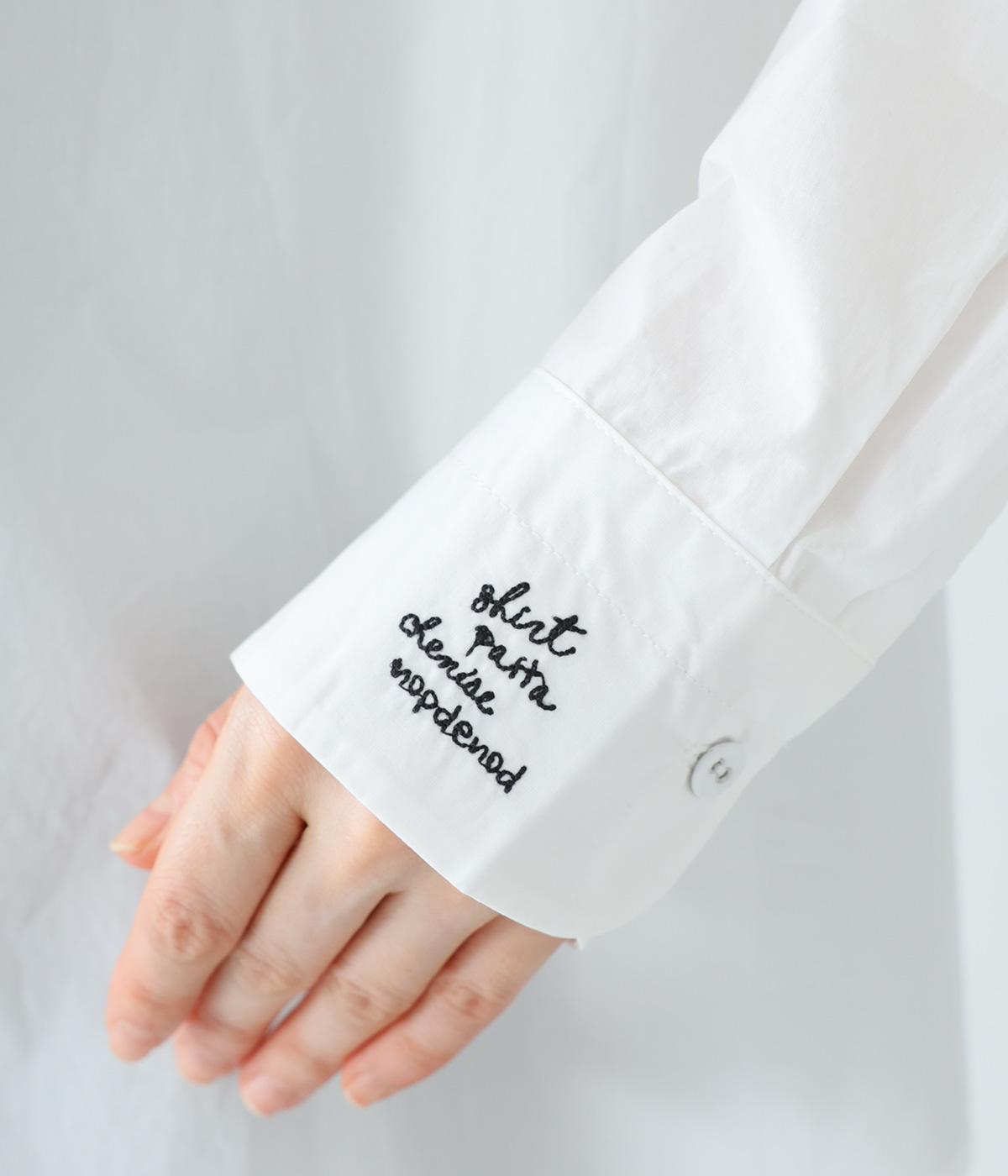 フロントと袖口にさりげなく刺しゅうが施されたシャツです。共布のくるみボタンや下前立ての配色ステッチなど、細部へのこだわりもたっぷり。後ろが長めになった前後差のある着丈で、バランスよく着こなすことができます。