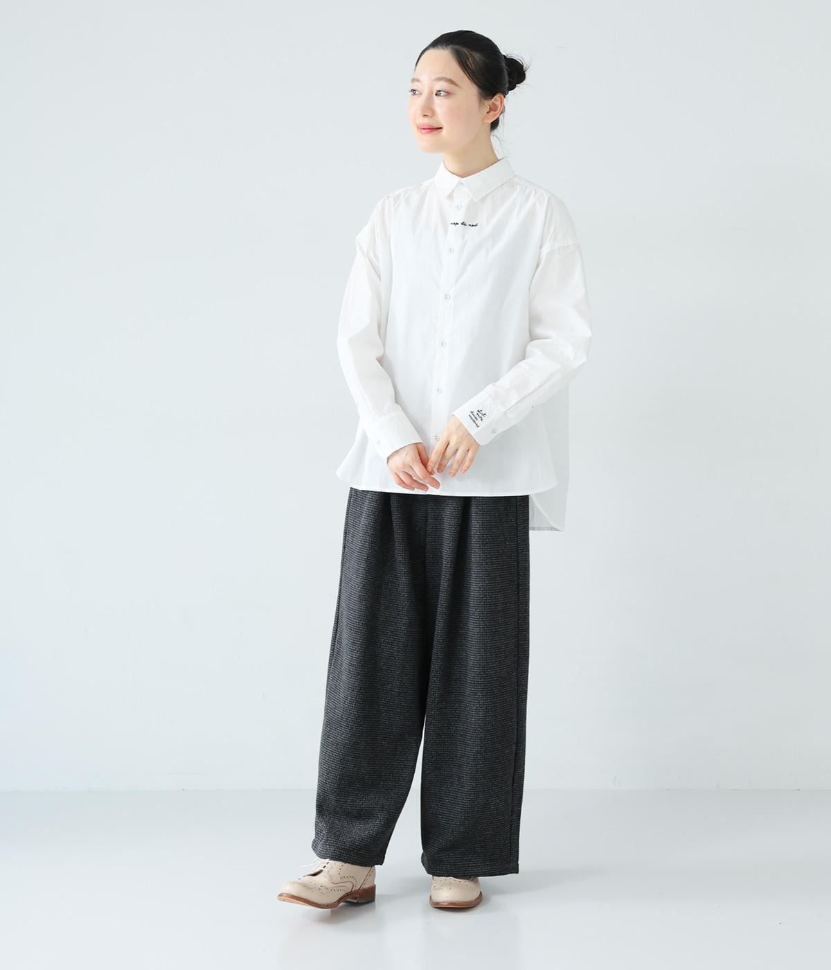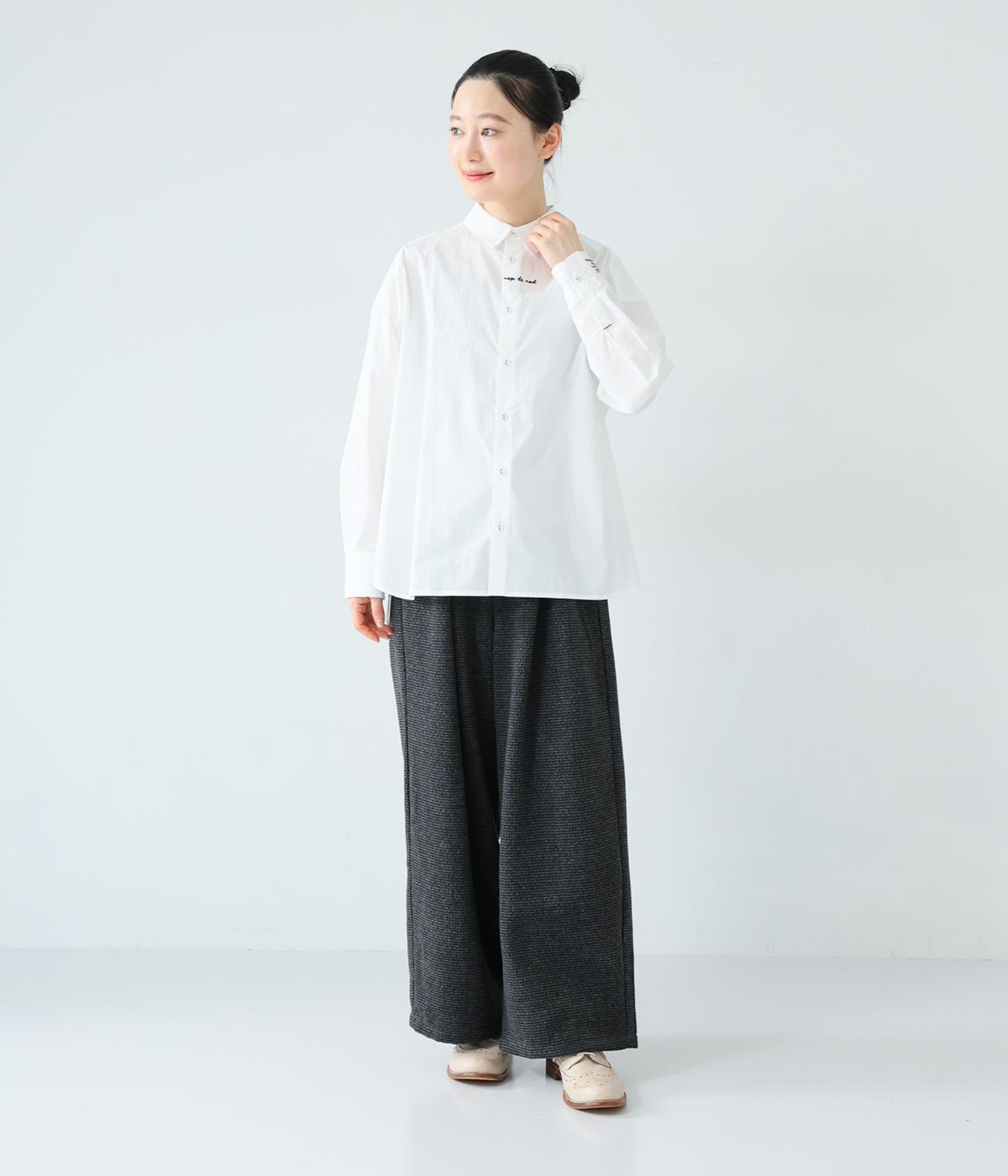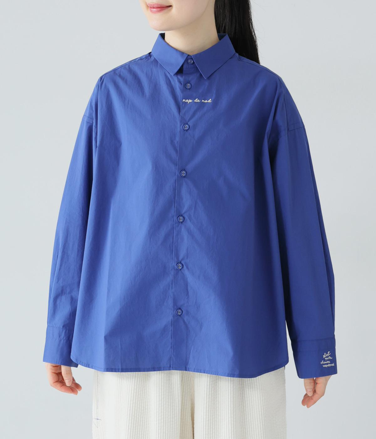 フロントと袖口にさりげなく刺しゅうが施されたシャツです。共布のくるみボタンや下前立ての配色ステッチなど、細部へのこだわりもたっぷり。後ろが長めになった前後差のある着丈で、バランスよく着こなすことができます。