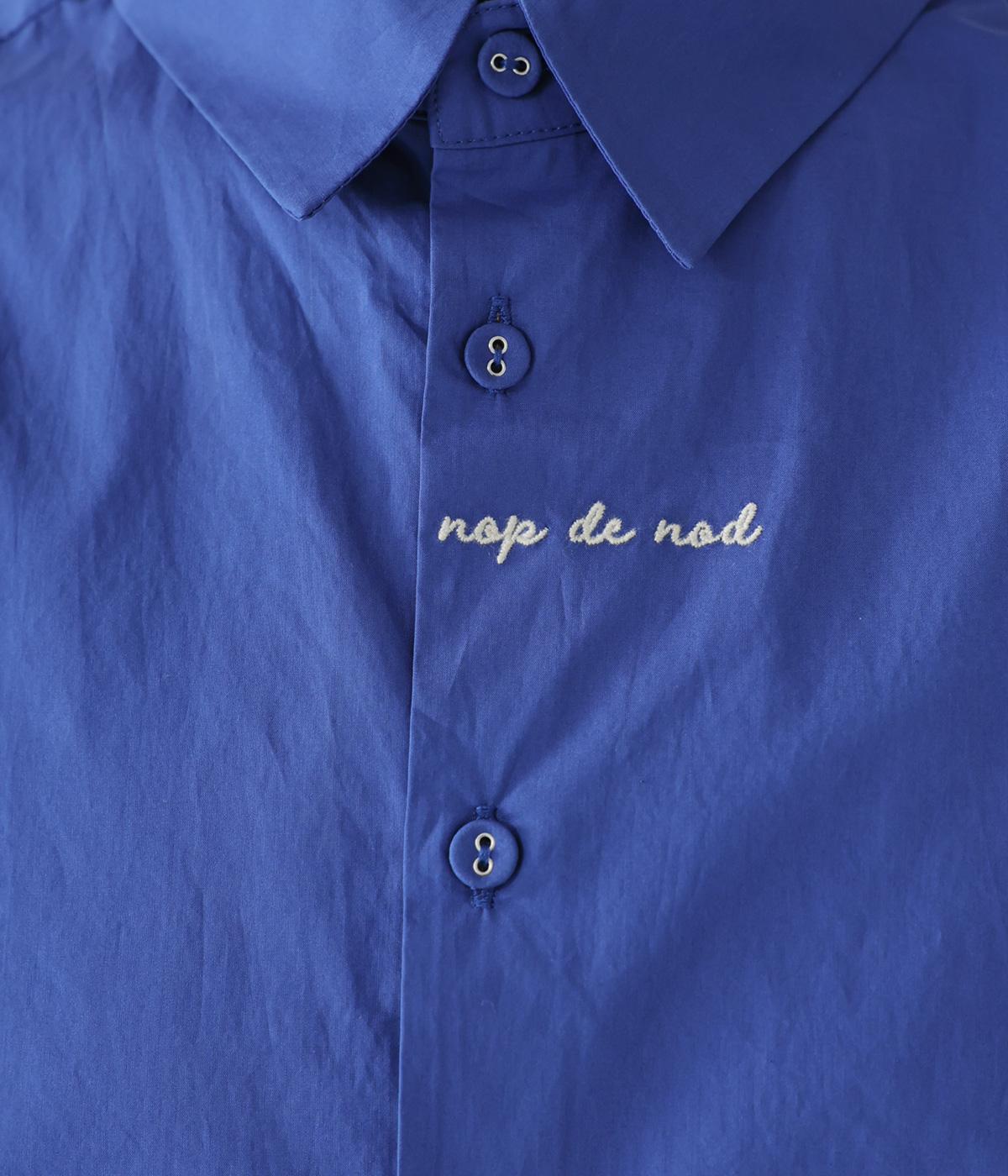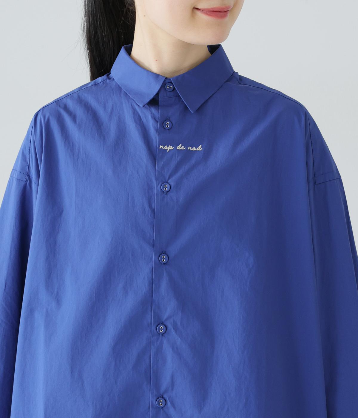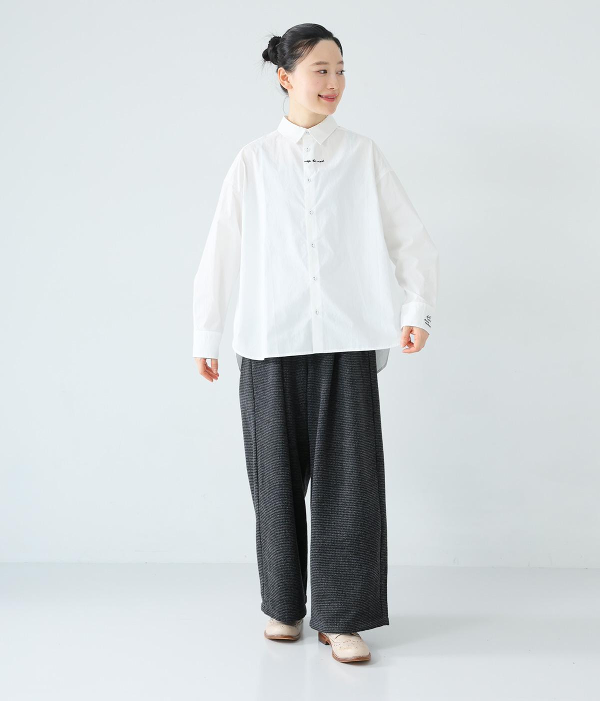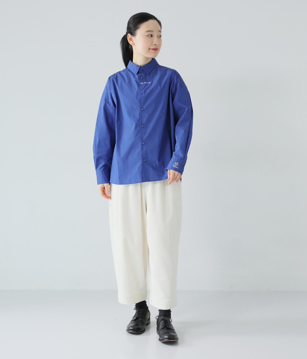 フロントと袖口にさりげなく刺しゅうが施されたシャツです。共布のくるみボタンや下前立ての配色ステッチなど、細部へのこだわりもたっぷり。後ろが長めになった前後差のある着丈で、バランスよく着こなすことができます。