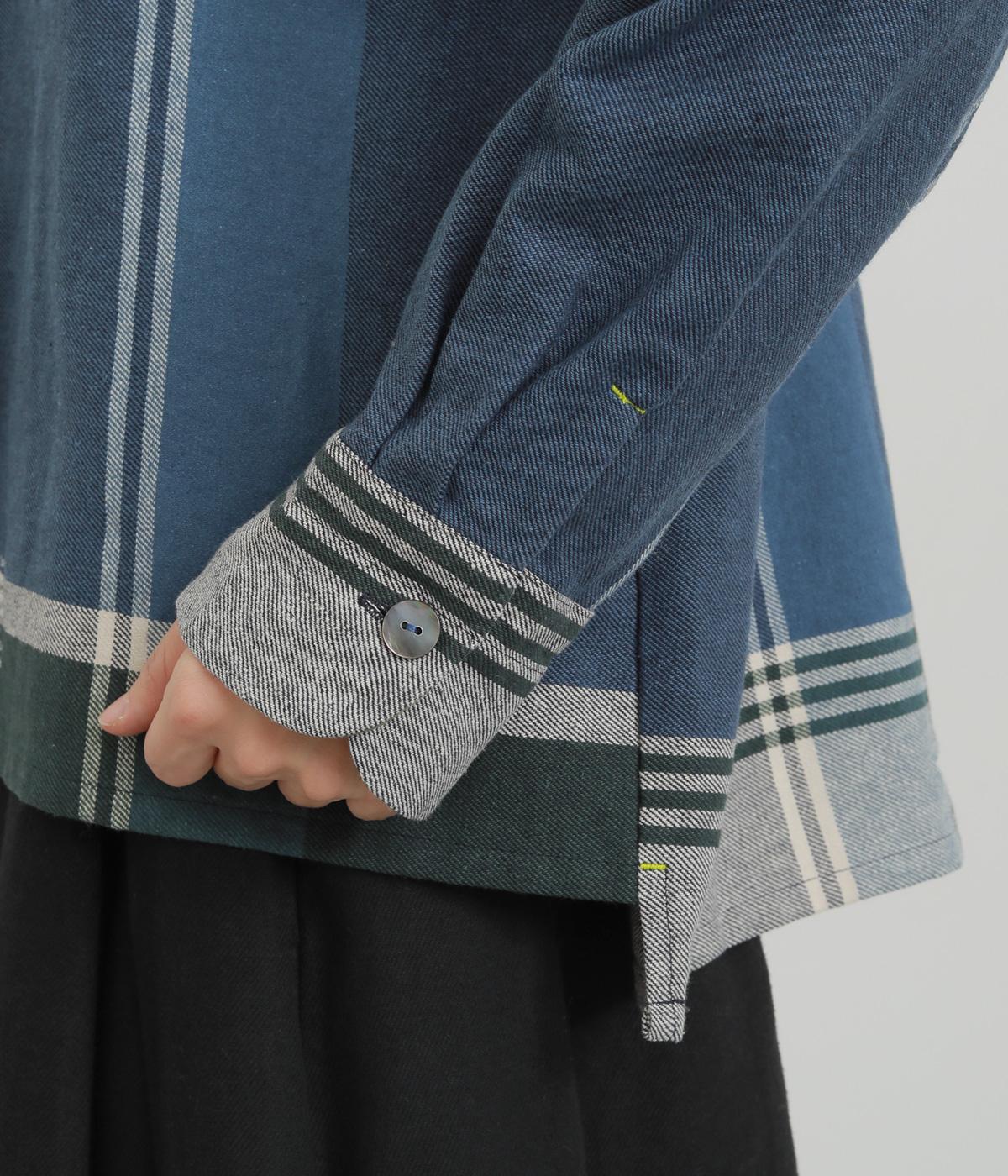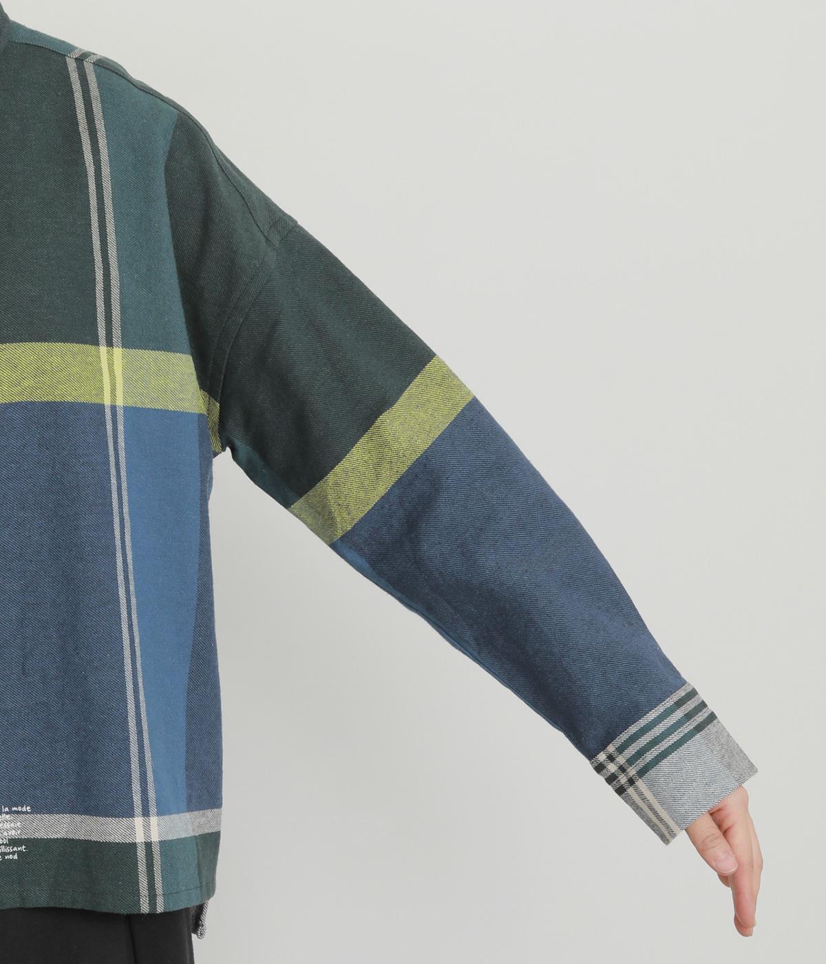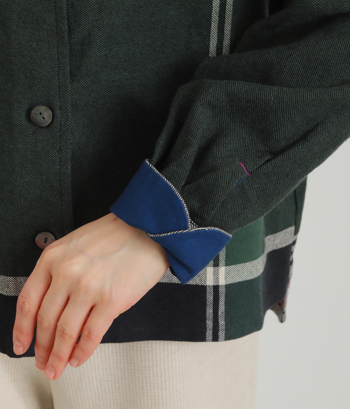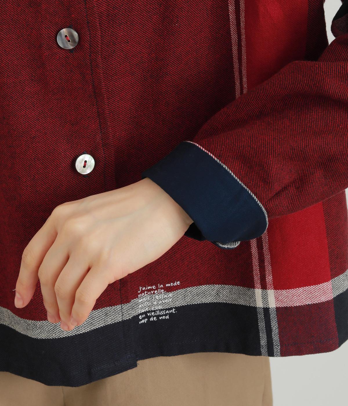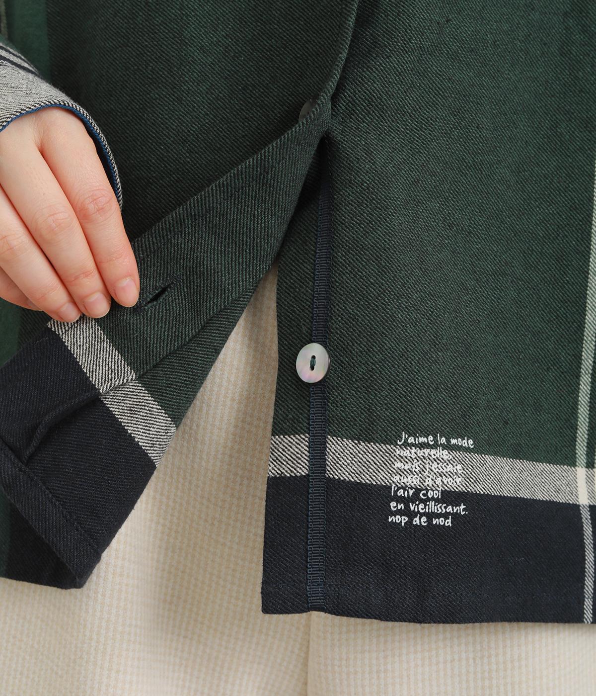 配色をきかせたパネルチェック柄が、暗くなりがちな季節のスタイリングに鮮やかさを投入。メンズライクなボックス型にスタンダードな襟つきでカジュアル気分を盛り上げます。前後差をつけた裾や前立て付近のメッセージプリントが◎。