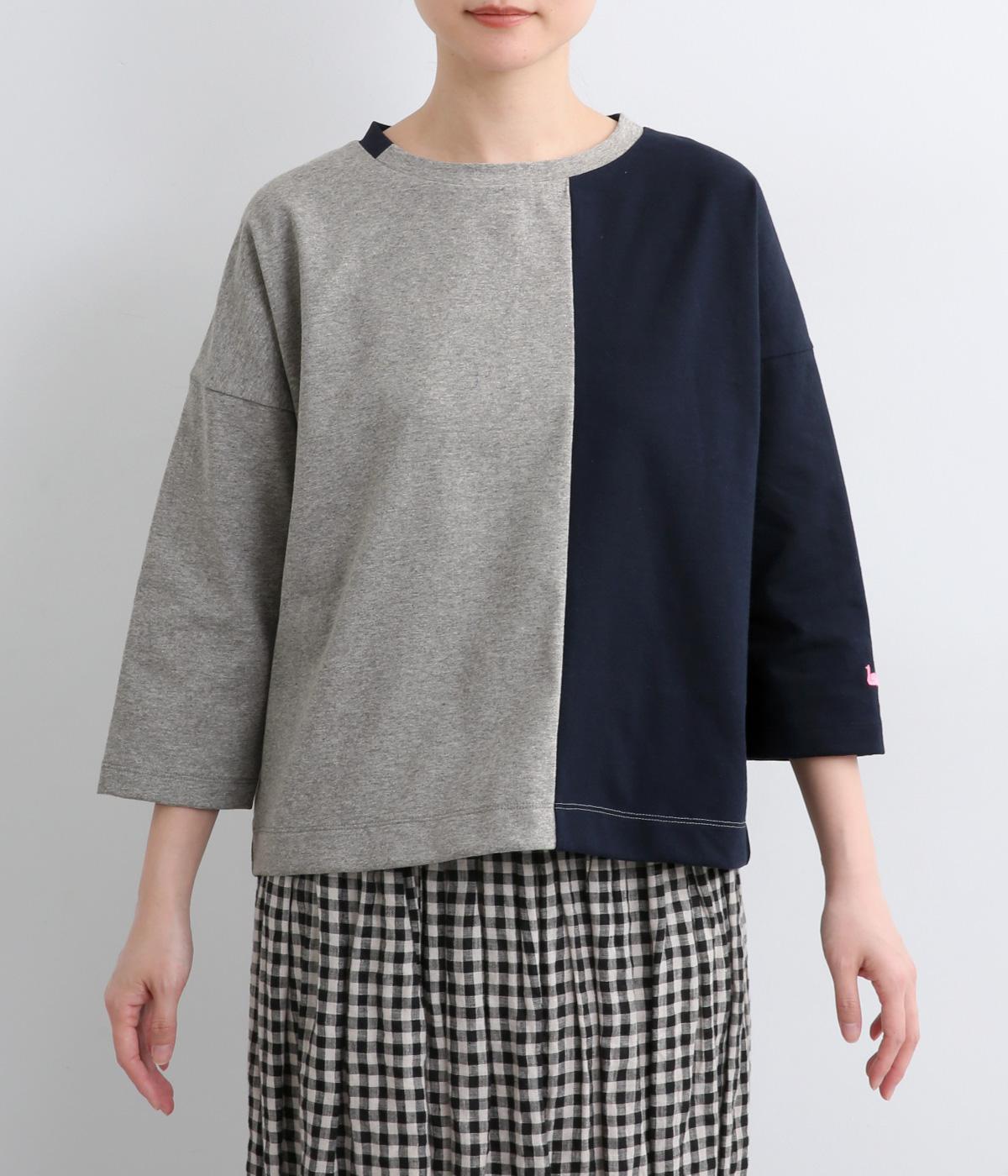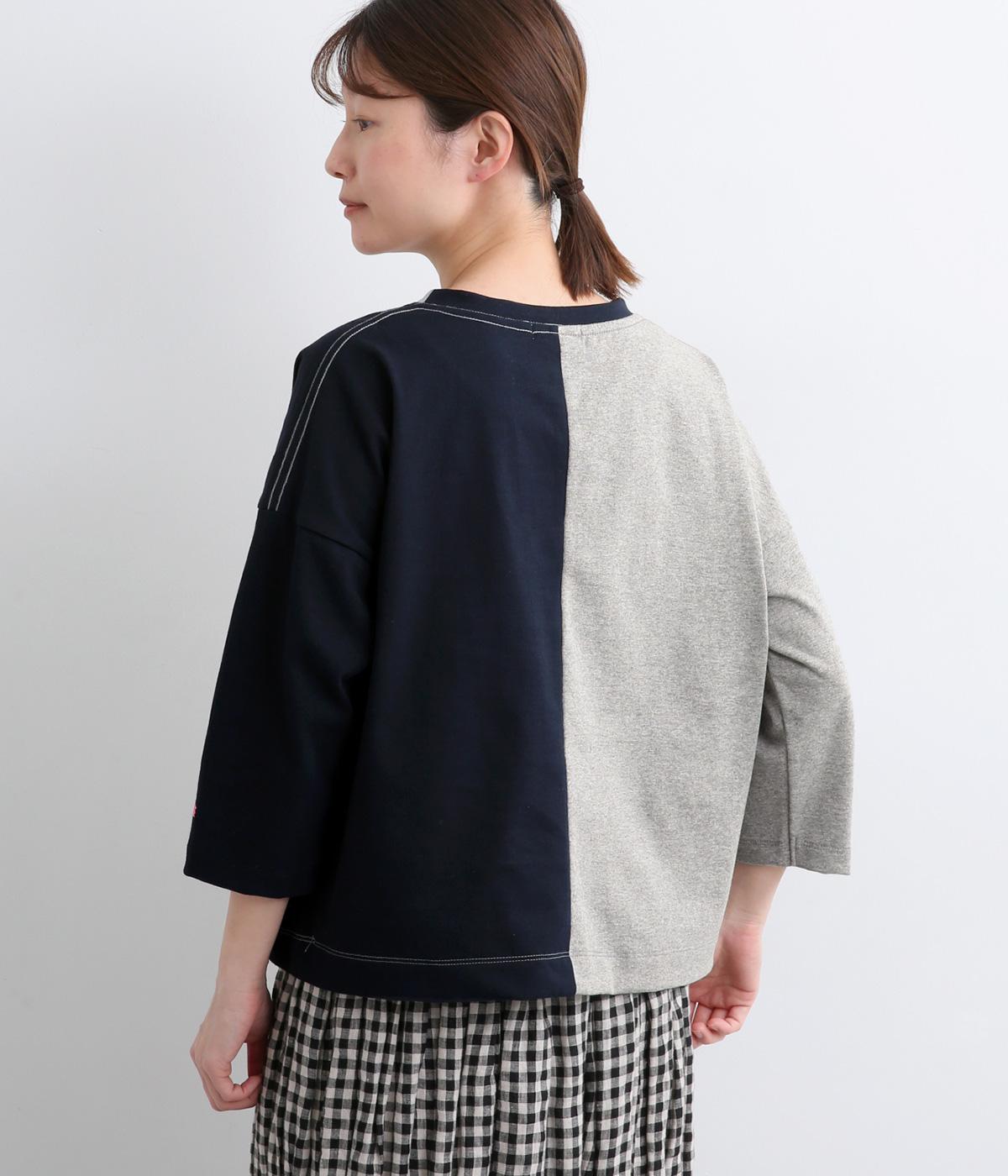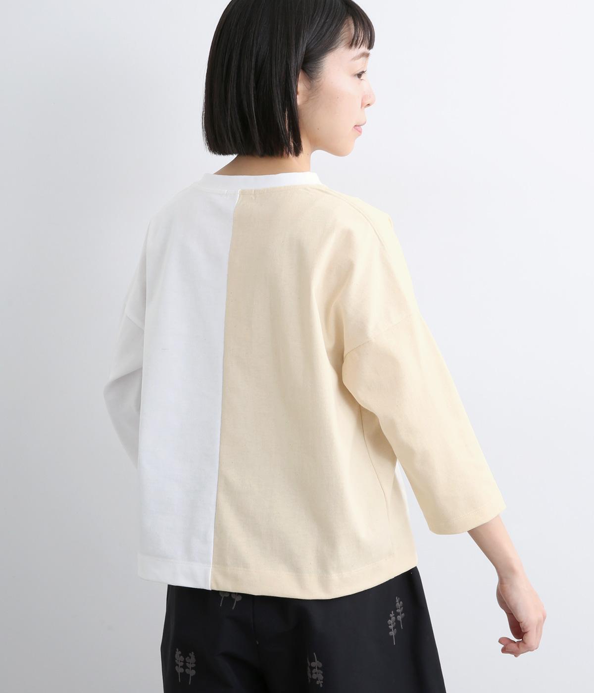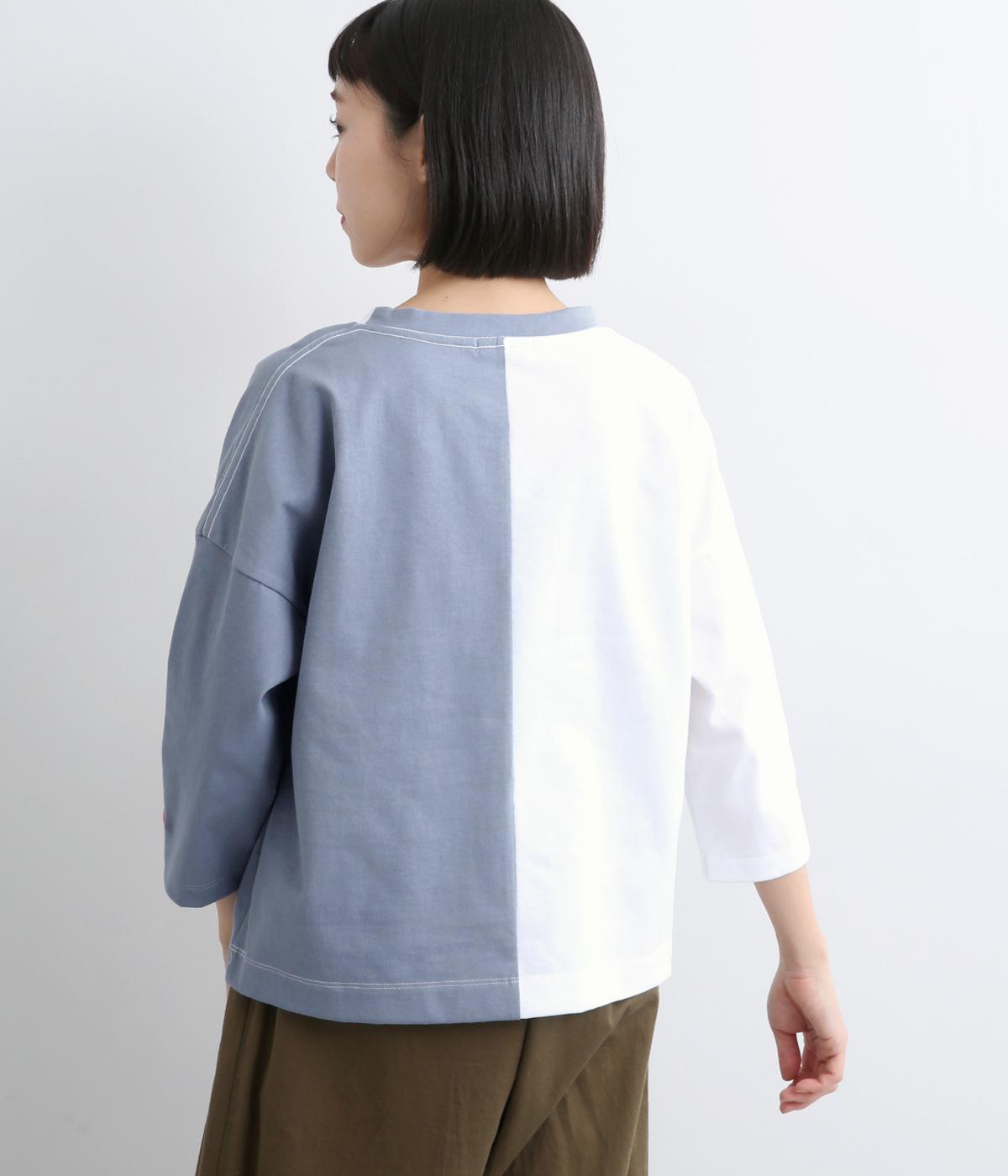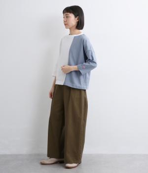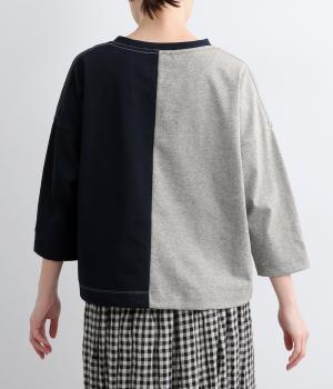 左右で色を切り替えた、縦割りバイカラーが特徴の七分袖トップスです。国産生地の上質な風合いと、洗練された配色が調和し、一枚で着てもサマになります。ゆとりのある身幅に対し、やや細めの袖ですっきりとした印象に。左袖のスワン刺しゅうが、シンプルさのなかにやさしいアクセントをプラスします。