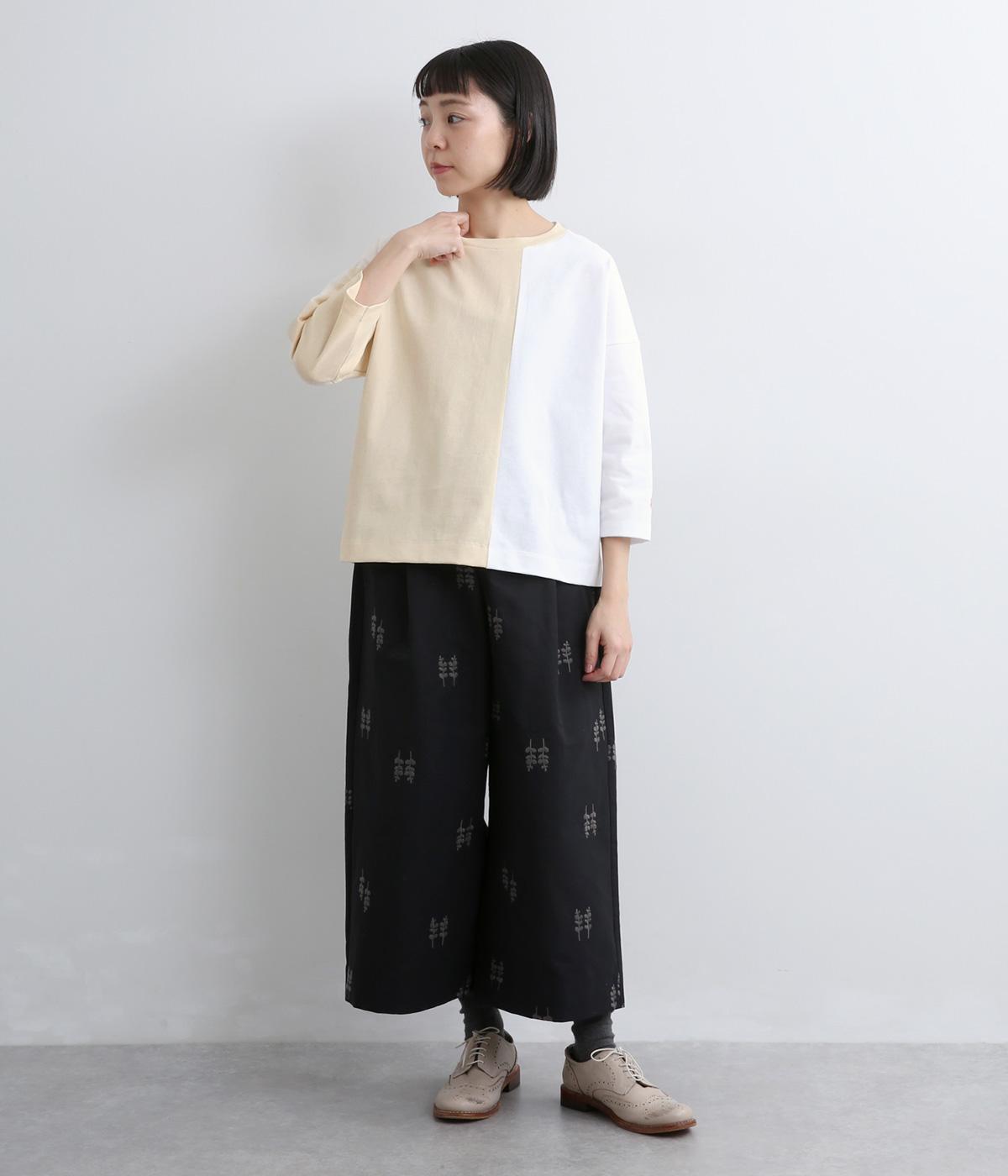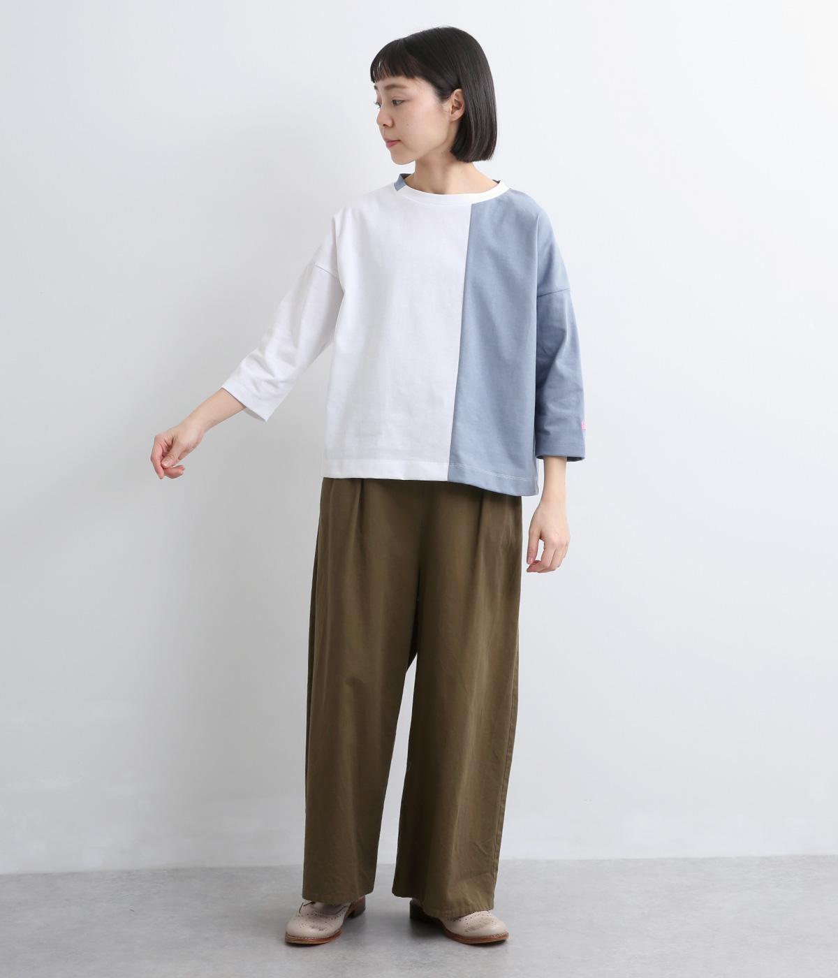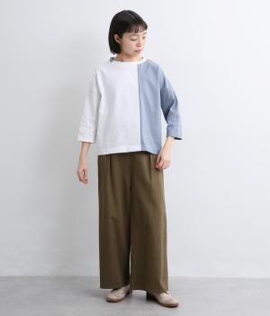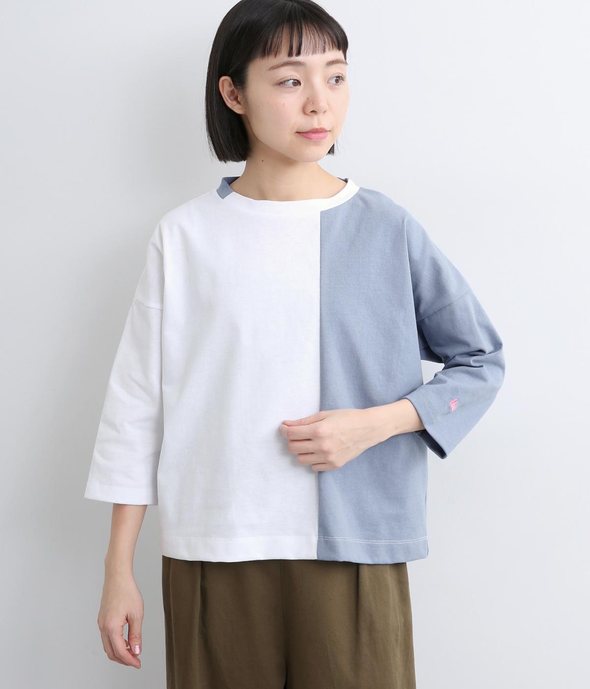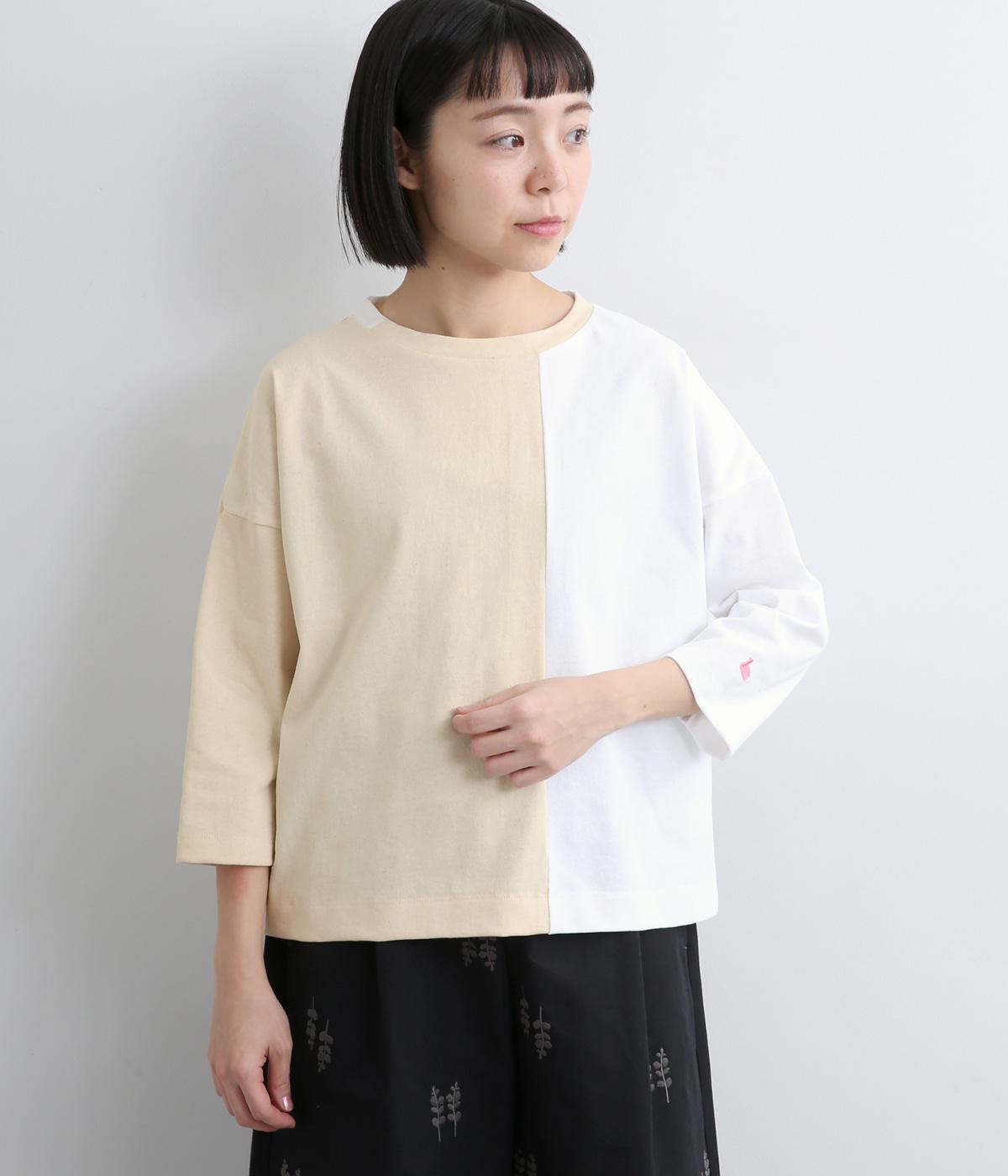 左右で色を切り替えた、縦割りバイカラーが特徴の七分袖トップスです。国産生地の上質な風合いと、洗練された配色が調和し、一枚で着てもサマになります。ゆとりのある身幅に対し、やや細めの袖ですっきりとした印象に。左袖のスワン刺しゅうが、シンプルさのなかにやさしいアクセントをプラスします。