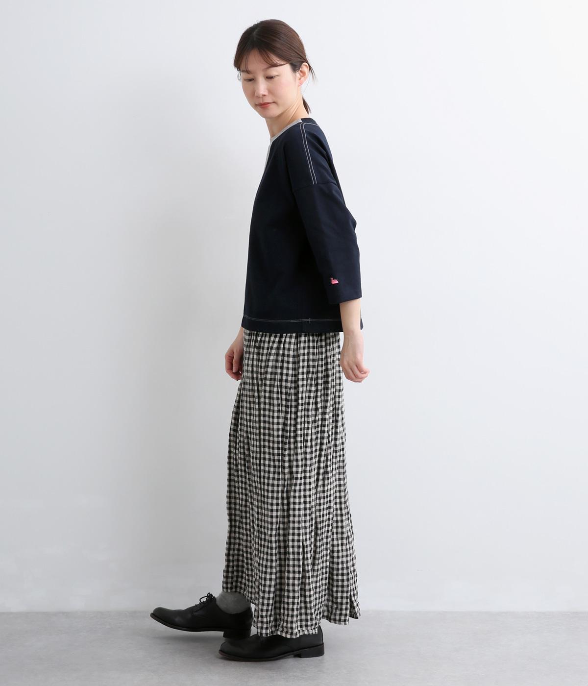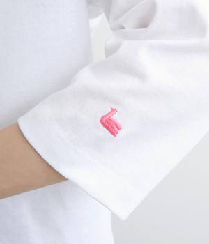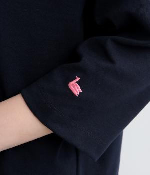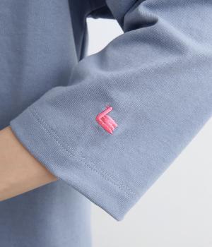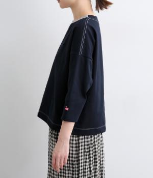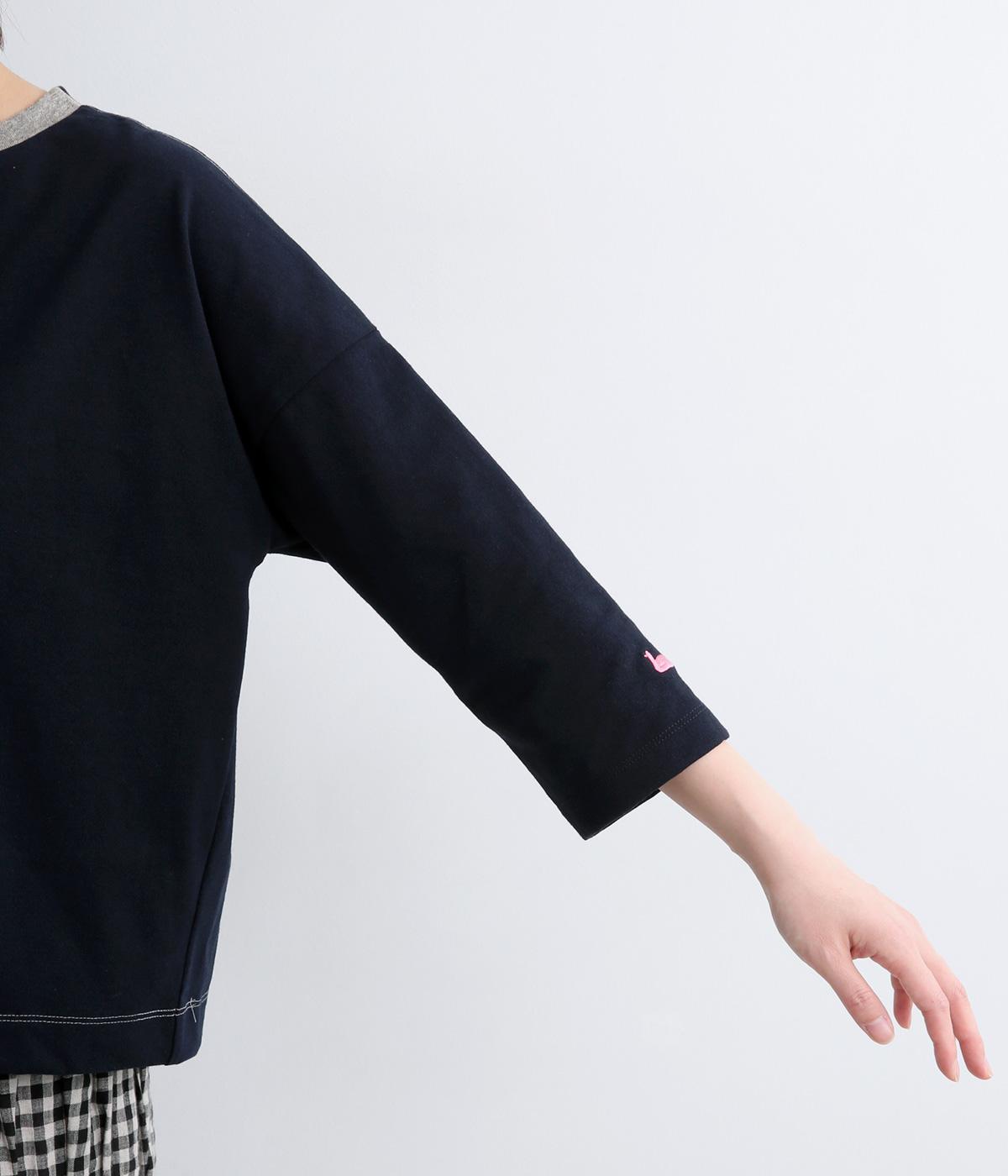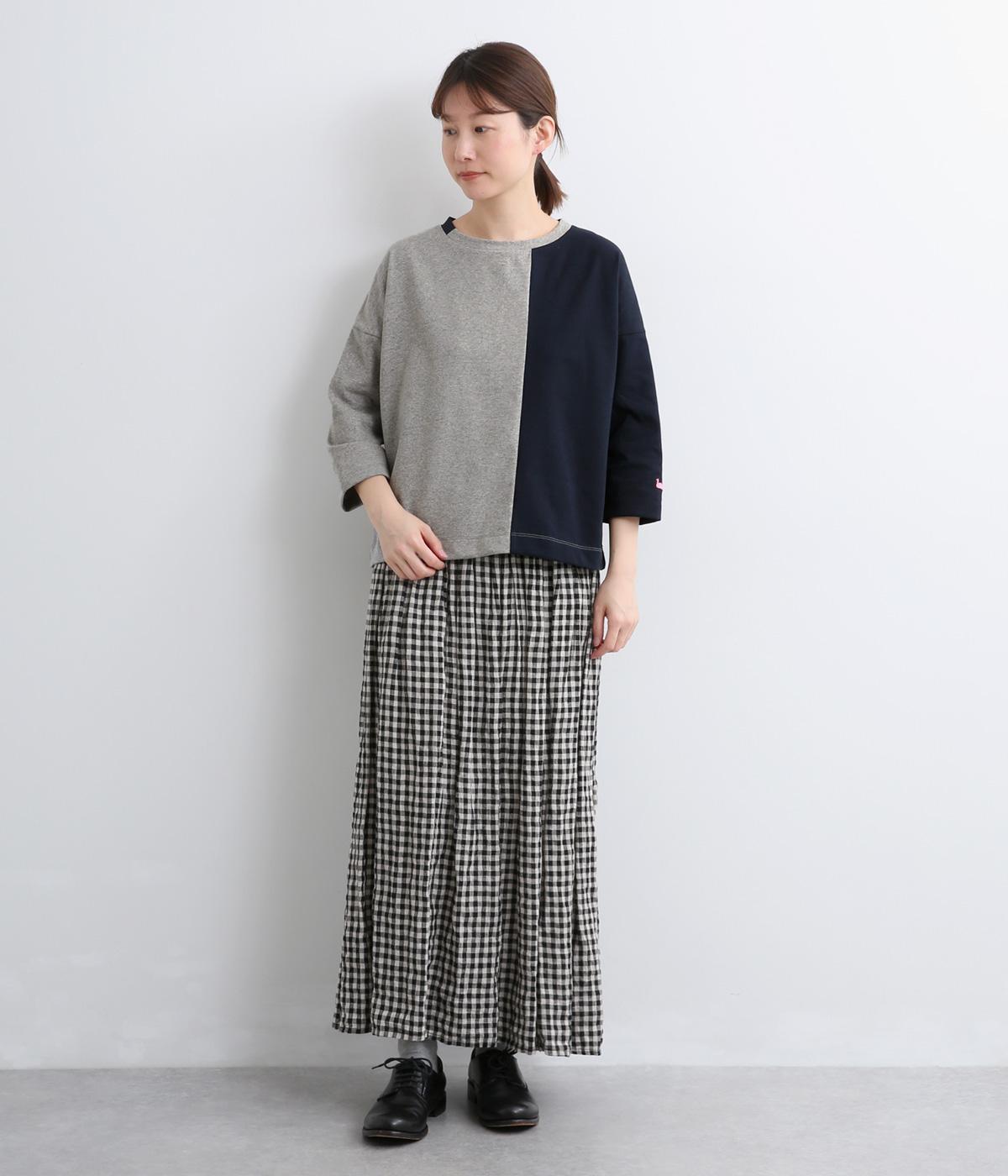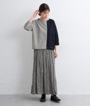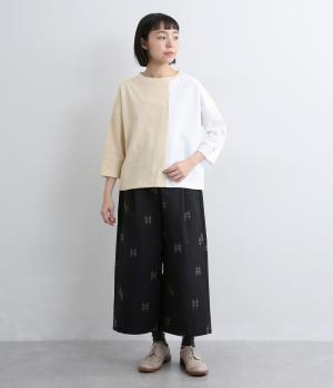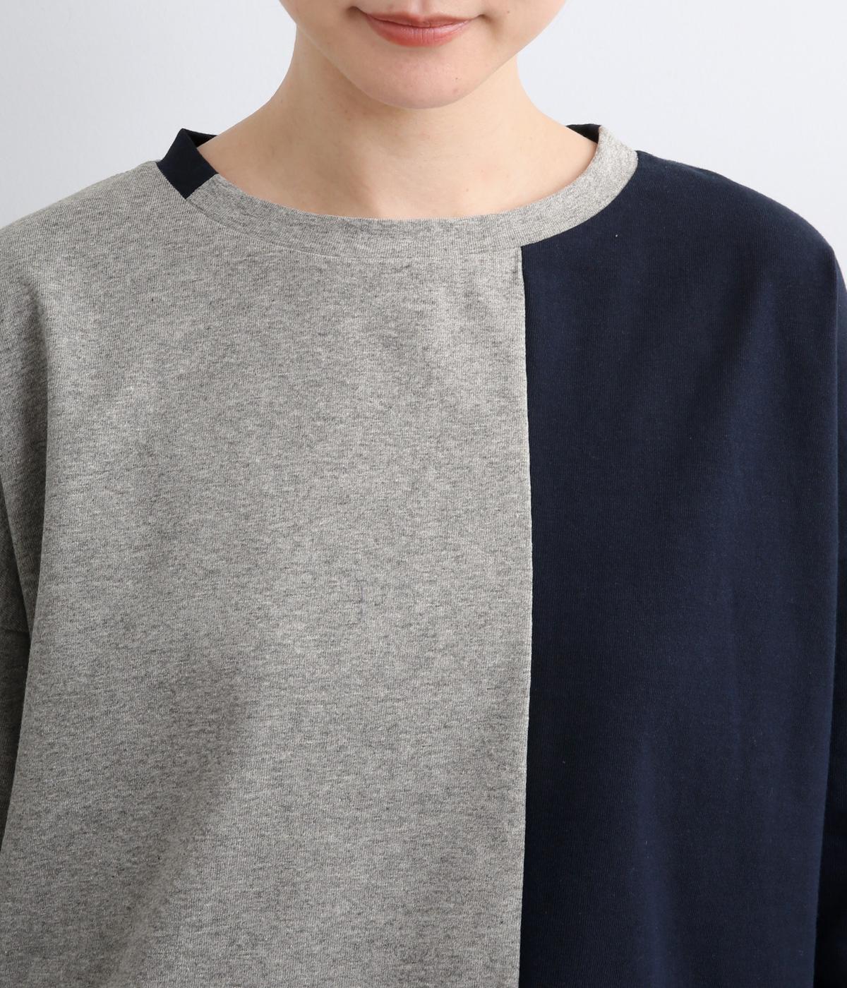 左右で色を切り替えた、縦割りバイカラーが特徴の七分袖トップスです。国産生地の上質な風合いと、洗練された配色が調和し、一枚で着てもサマになります。ゆとりのある身幅に対し、やや細めの袖ですっきりとした印象に。左袖のスワン刺しゅうが、シンプルさのなかにやさしいアクセントをプラスします。