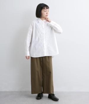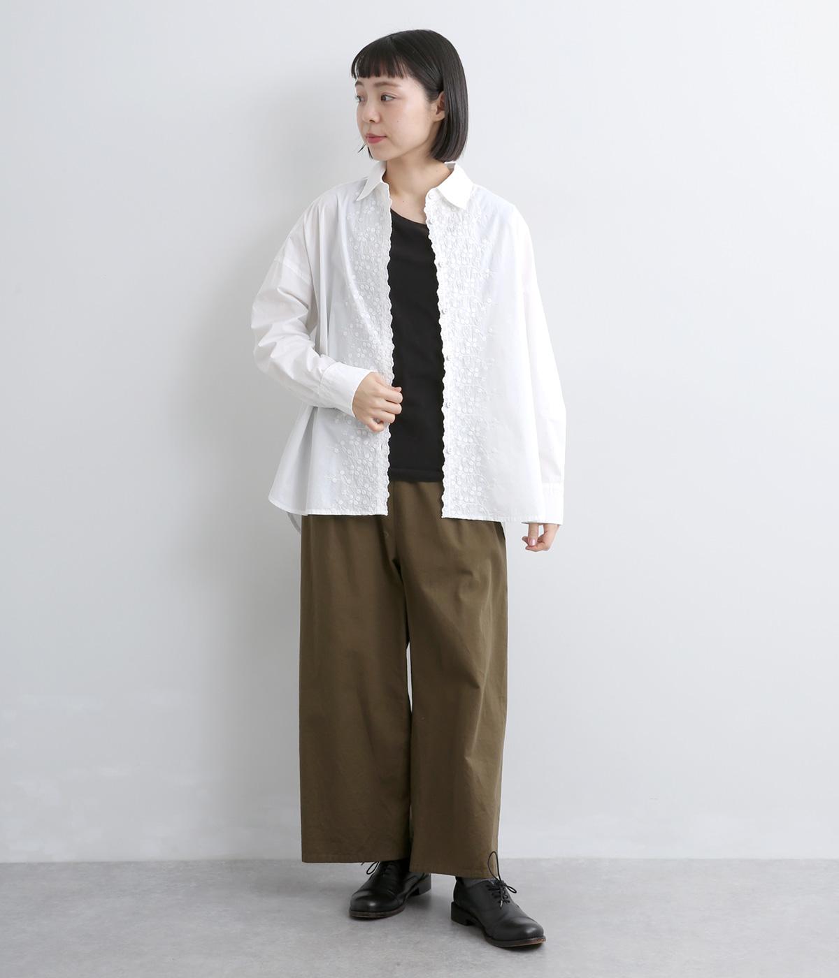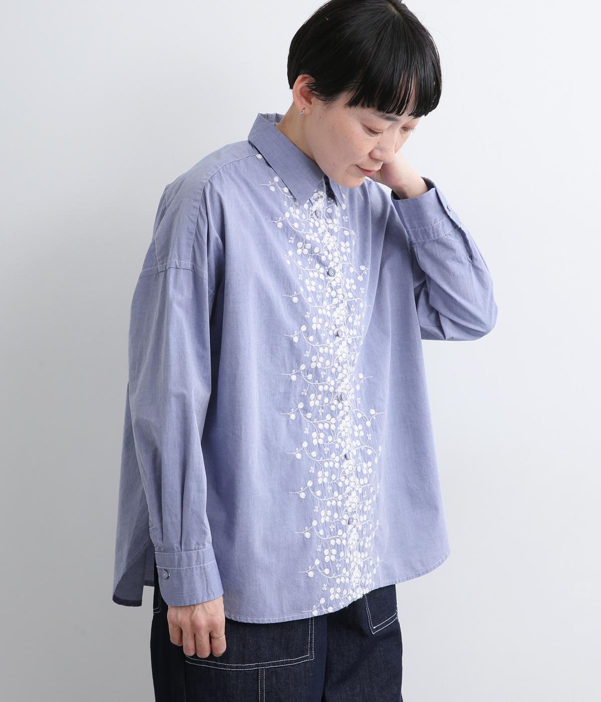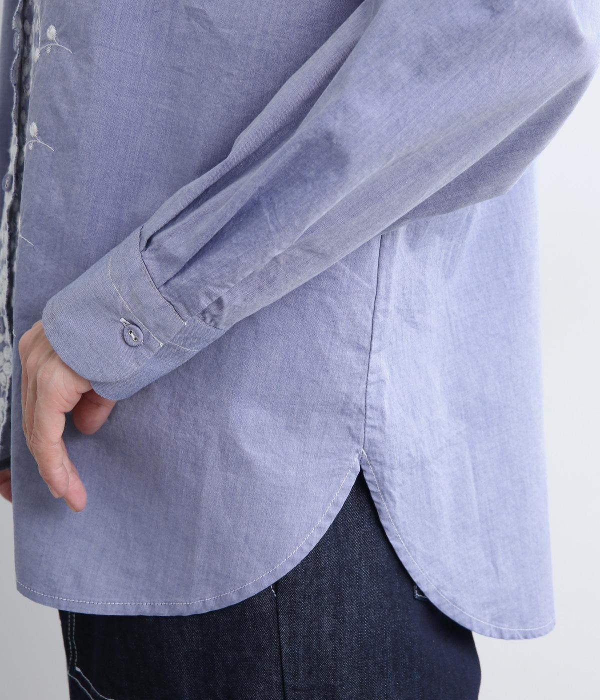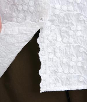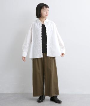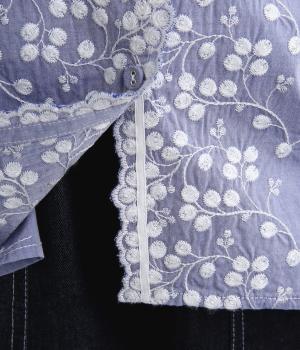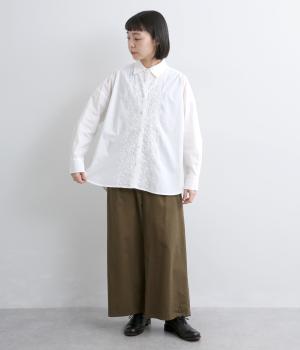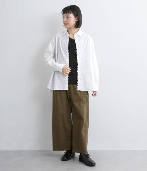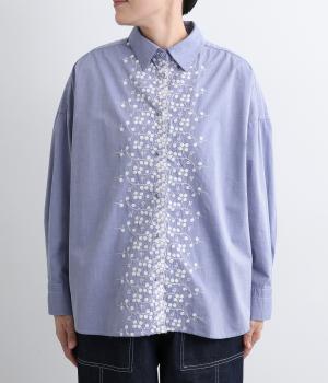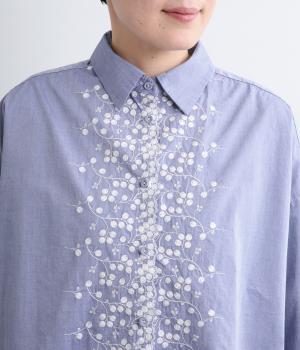 フロントに施したスカラップ刺しゅうが印象的な、オーバーサイズのシャツです。小さなバラを思わせる刺しゅうが、メンズライクなシルエットにやさしい表情を添えています。くるみボタンや、前をあけると見える配色ステッチなど、細部にもこだわりました。前後差のある丈感で、羽織りとしてもバランスよく着用できます。