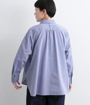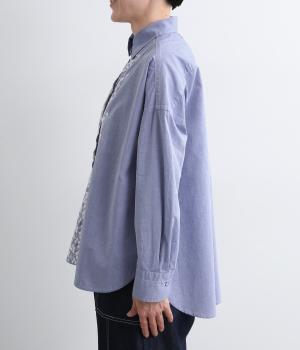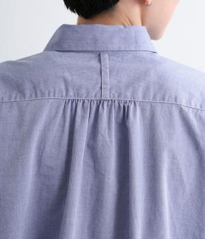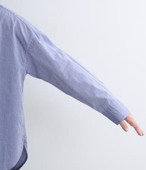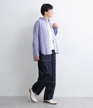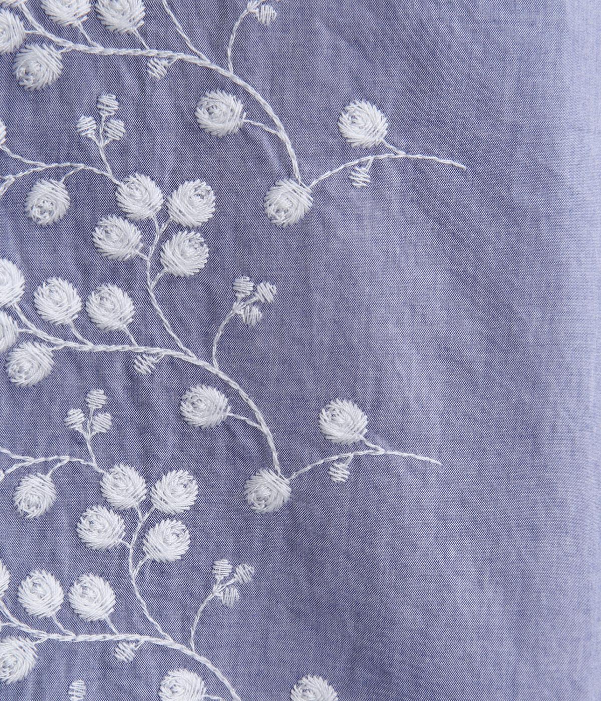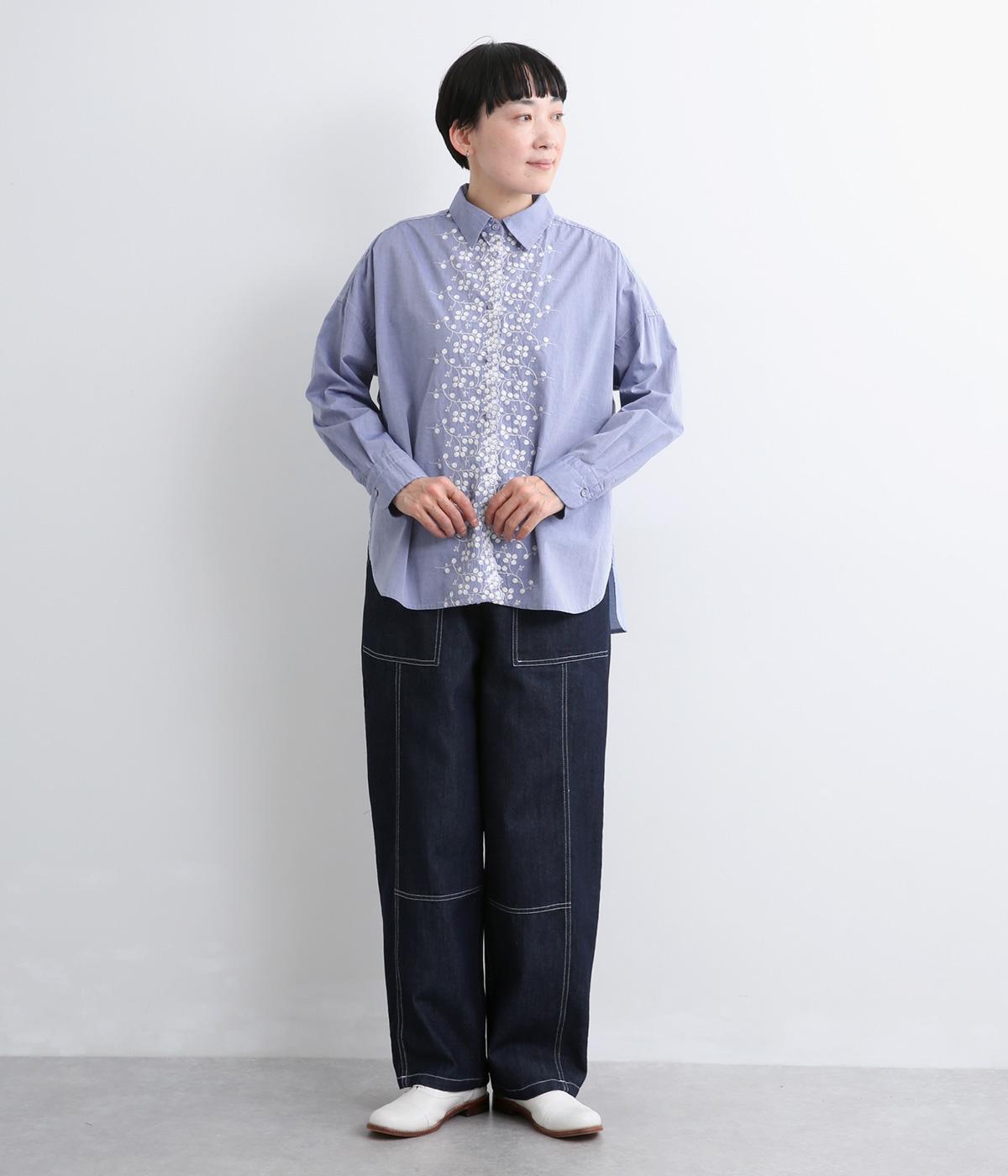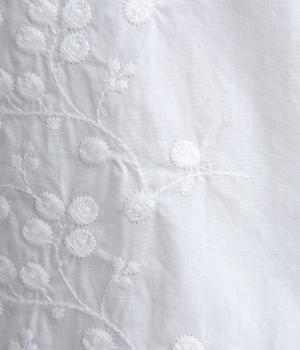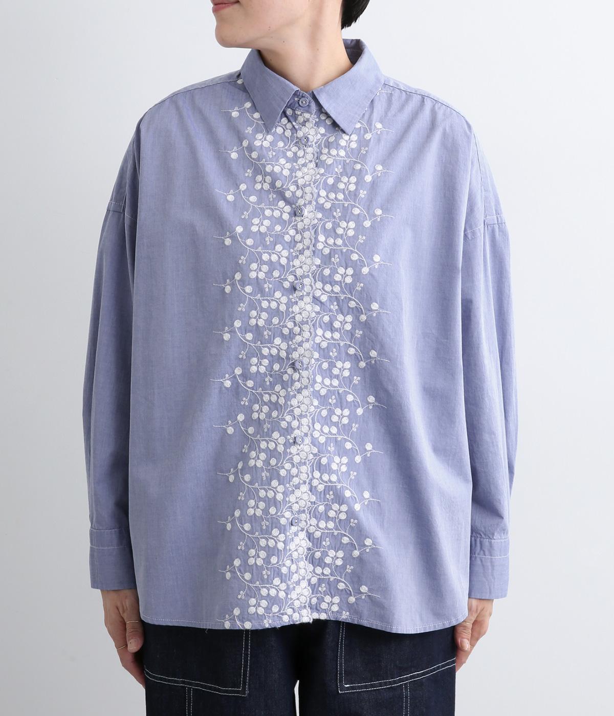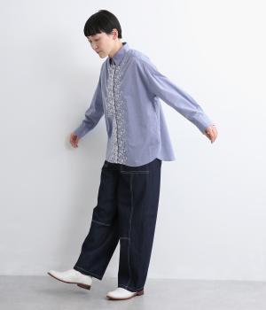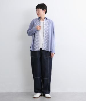 フロントに施したスカラップ刺しゅうが印象的な、オーバーサイズのシャツです。小さなバラを思わせる刺しゅうが、メンズライクなシルエットにやさしい表情を添えています。くるみボタンや、前をあけると見える配色ステッチなど、細部にもこだわりました。前後差のある丈感で、羽織りとしてもバランスよく着用できます。