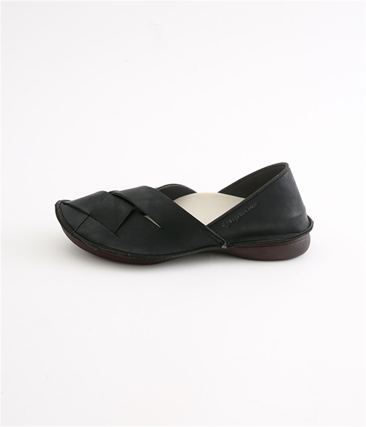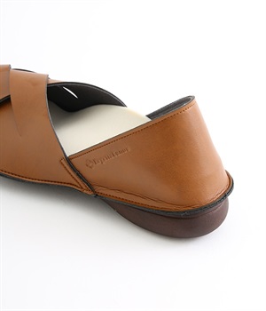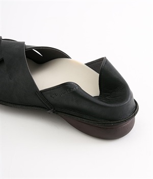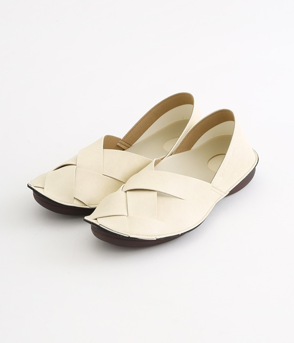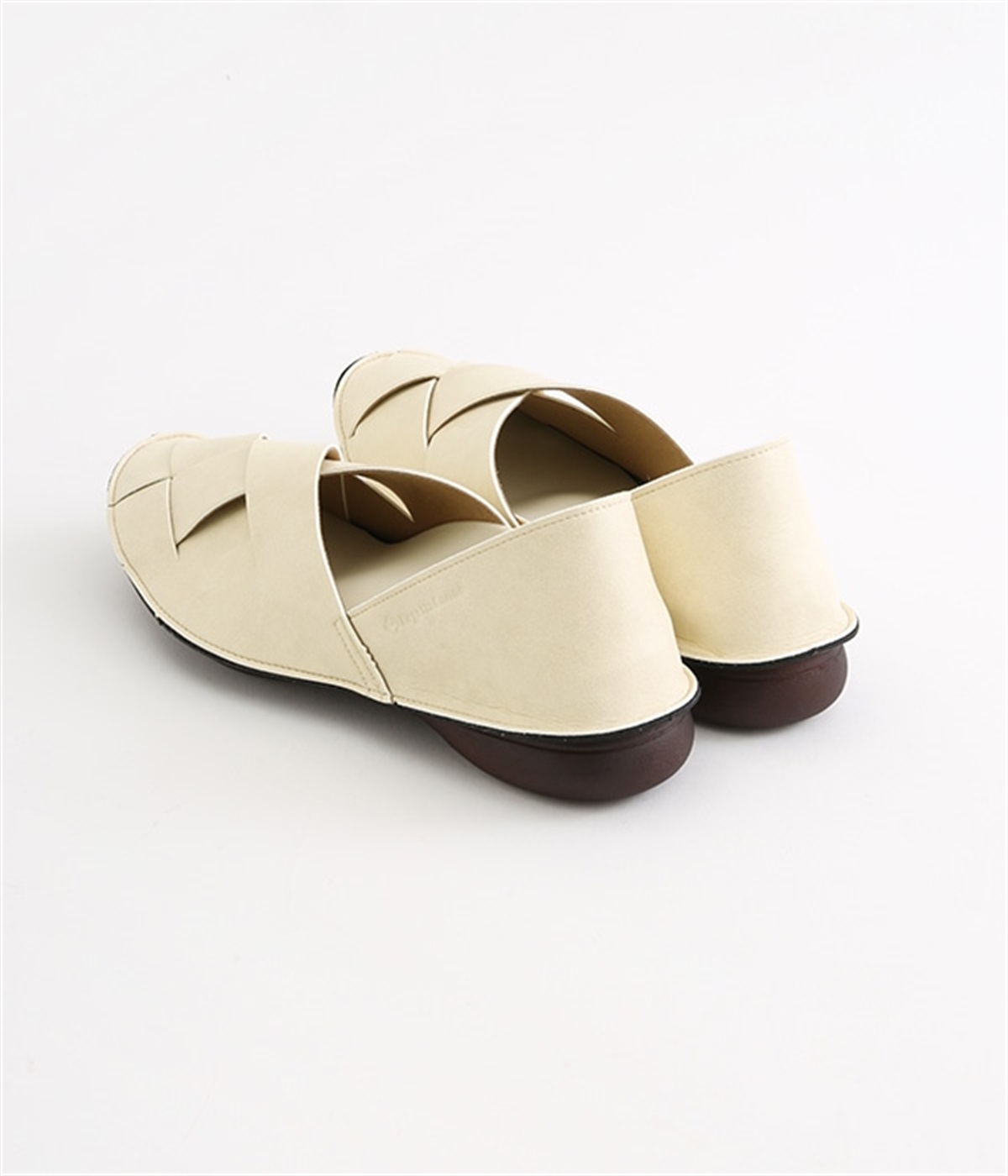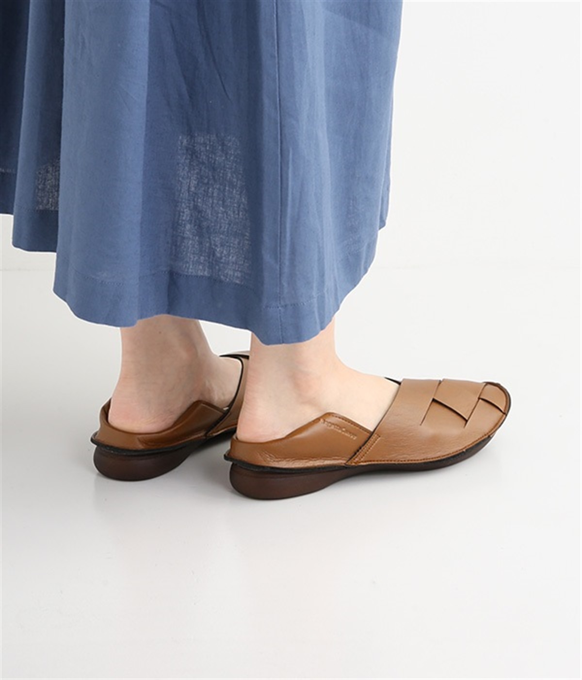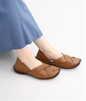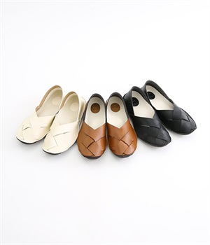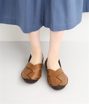 編み込みタイプの品のいいバブーシュです。メッシュ編みが足先にナチュラルなアクセントをプラス。土踏まずがふくらんだインソールなのでフィット感もよく。柔らかく包み込むようなはき心地です。かかとが踏める2WAY仕様のため足入れがしやすく、素足ではいたり靴下と合わせたり、コーディネートにあわせてはき方を変えられます。合成革ならではの扱いやすさと軽さもうれしいポイントです。