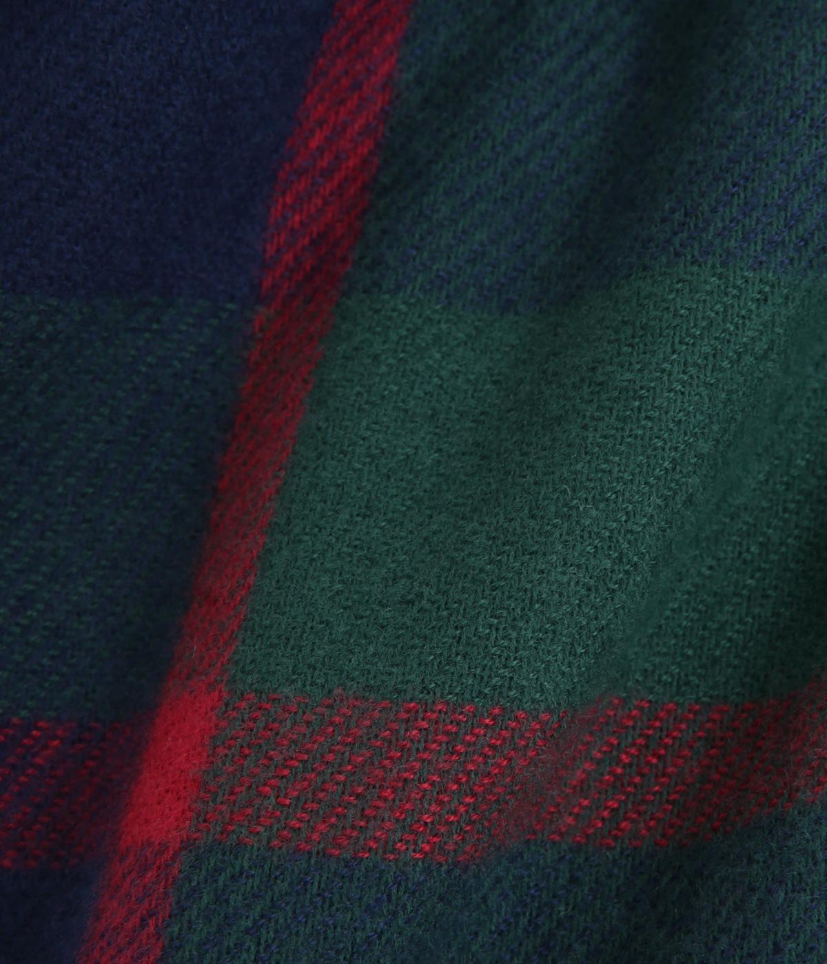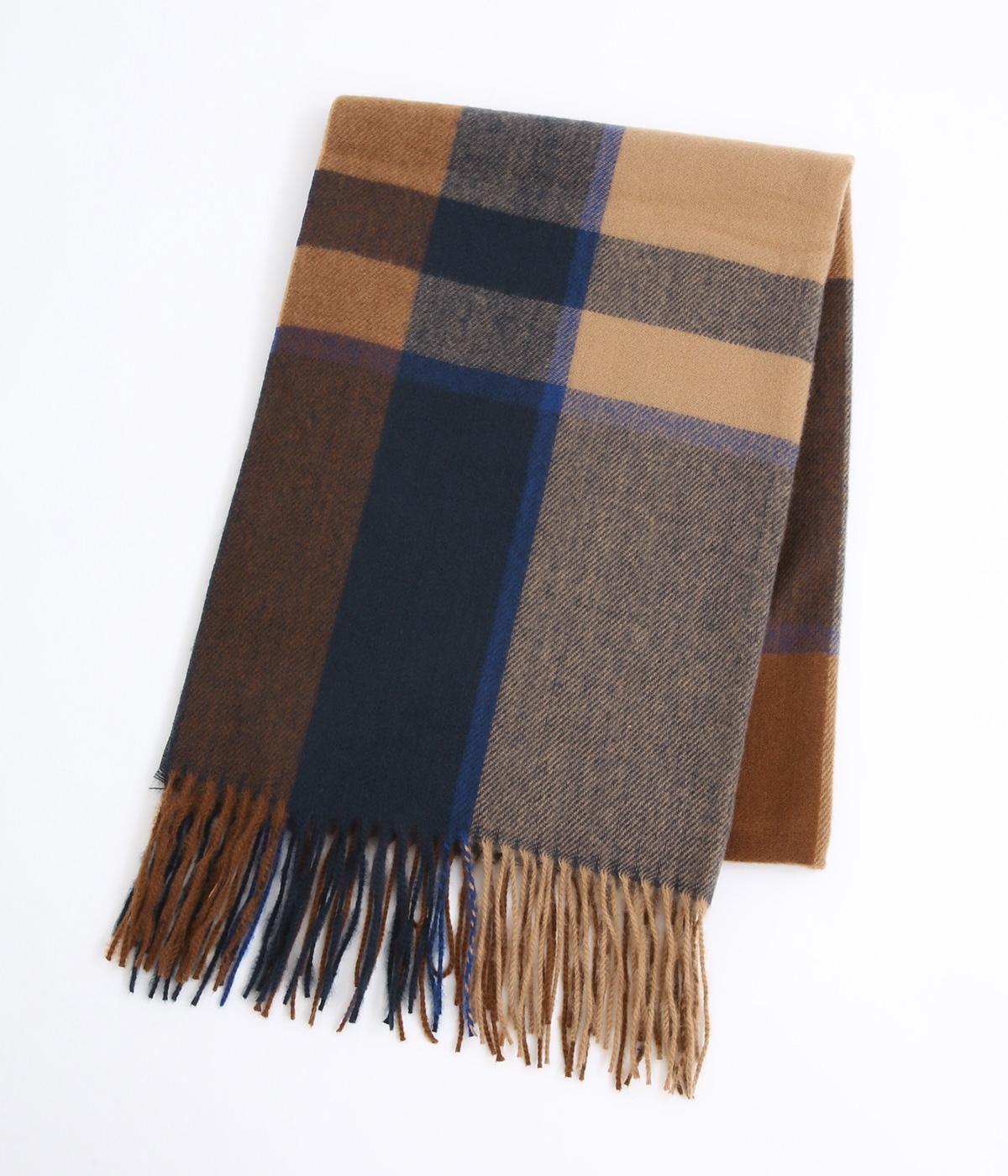 ビターな配色が大人スタイルにしっくりなじむ、チェック柄ストール。大判の長方形タイプに両端のフリンジがきいたデザインで、首に巻くとほどよいボリューム感が出ます。肩やひざに掛けたり、冷え対策にも重宝する一枚。