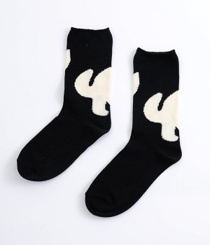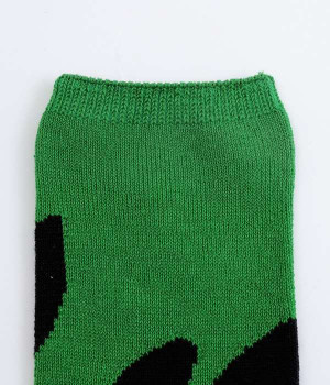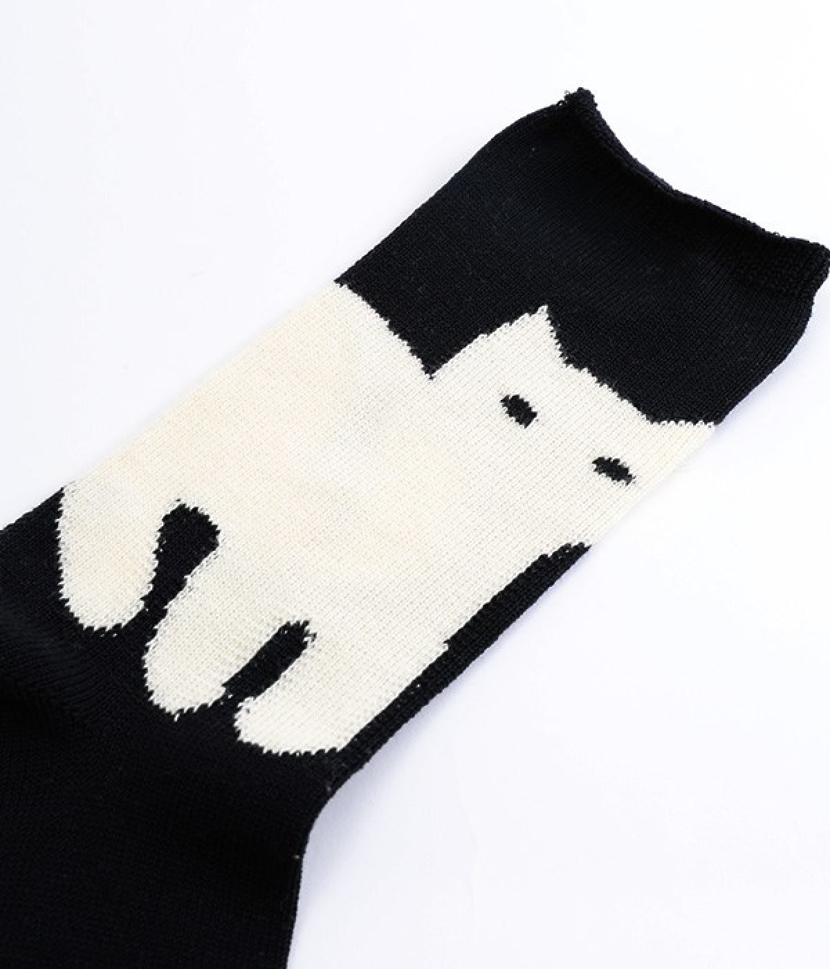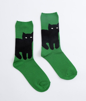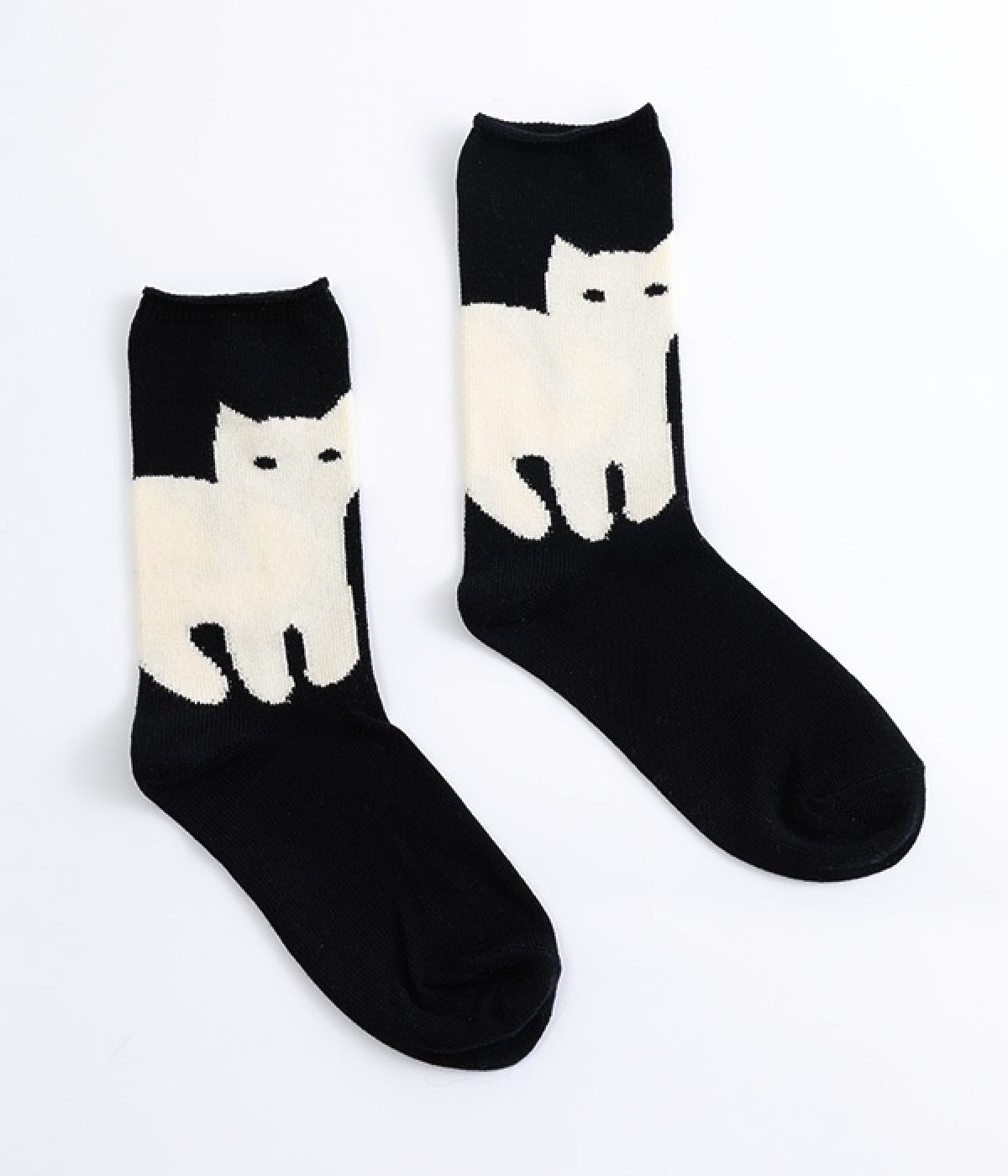 子猫の可愛い立ち姿をシンプルな図案で表現したソックスです。ベースにはシルケット加工を施した毛羽の少ない綿糸を使用し、上品な光沢感が楽しめます。程よい厚みで編み立てたので、心地よく足にフィットしてくれます。じっとこちらを見つめる猫がなんともかわいらしく、見るだけでほっこりとした気持ちに。足元コーディネートのアクセントになるアイテムです。