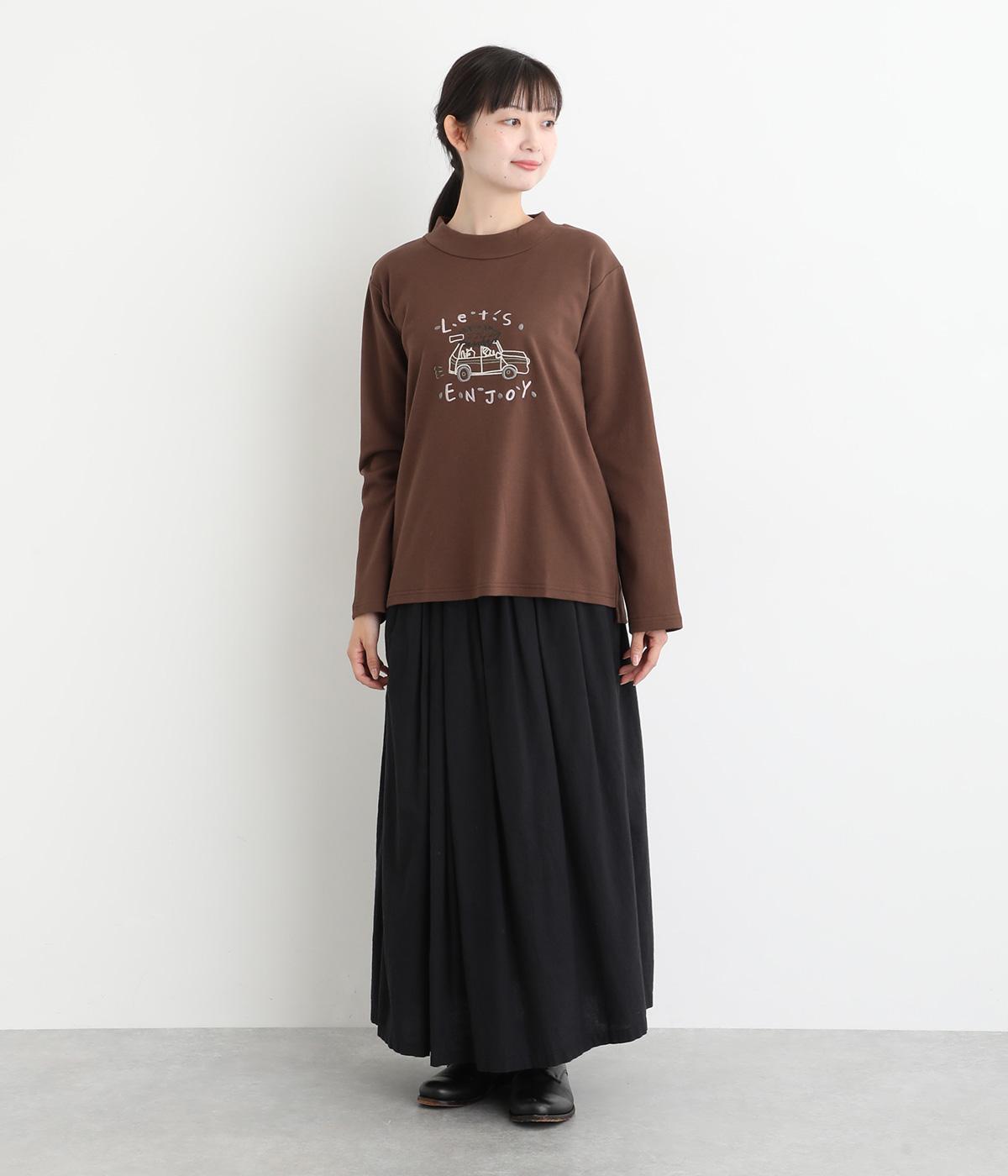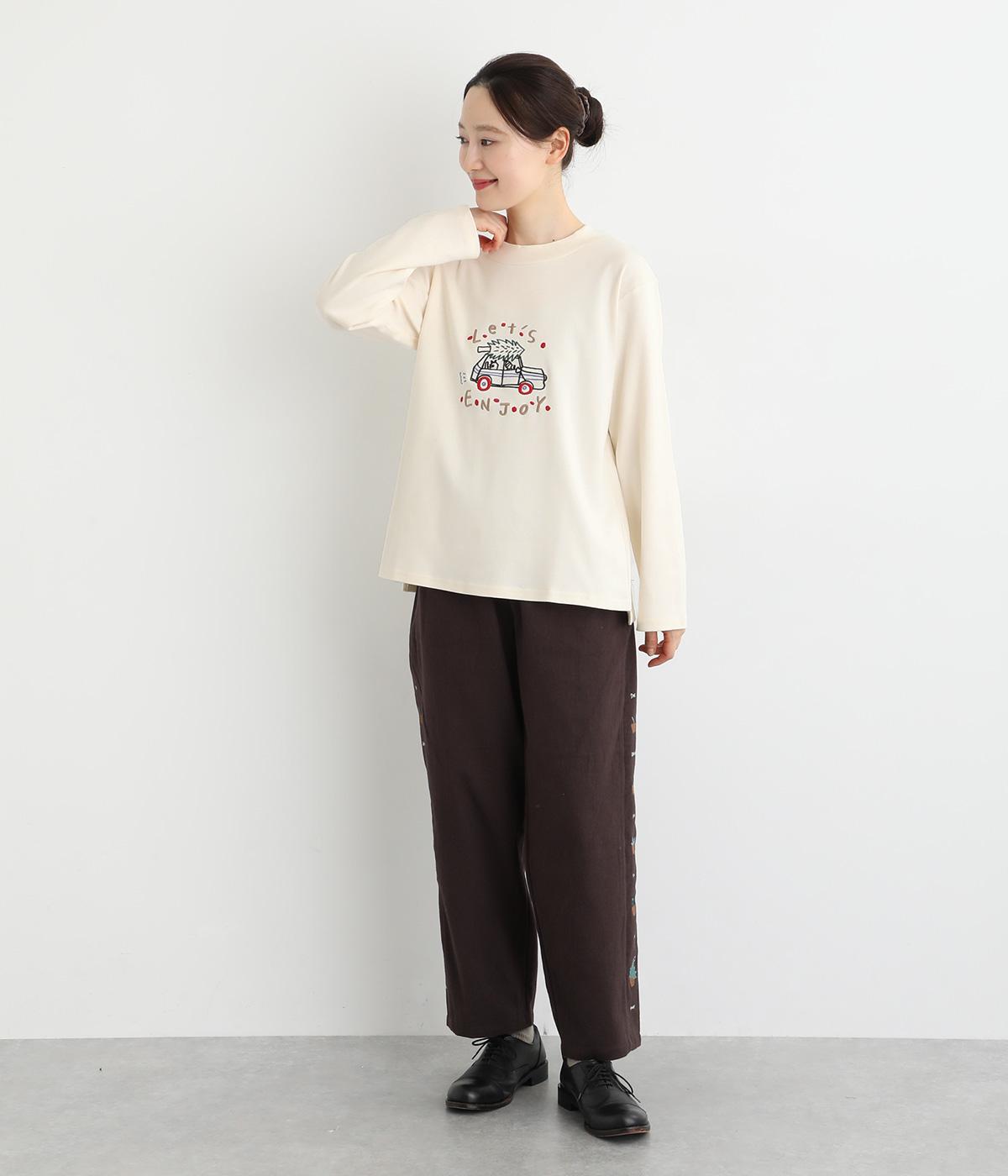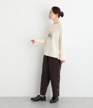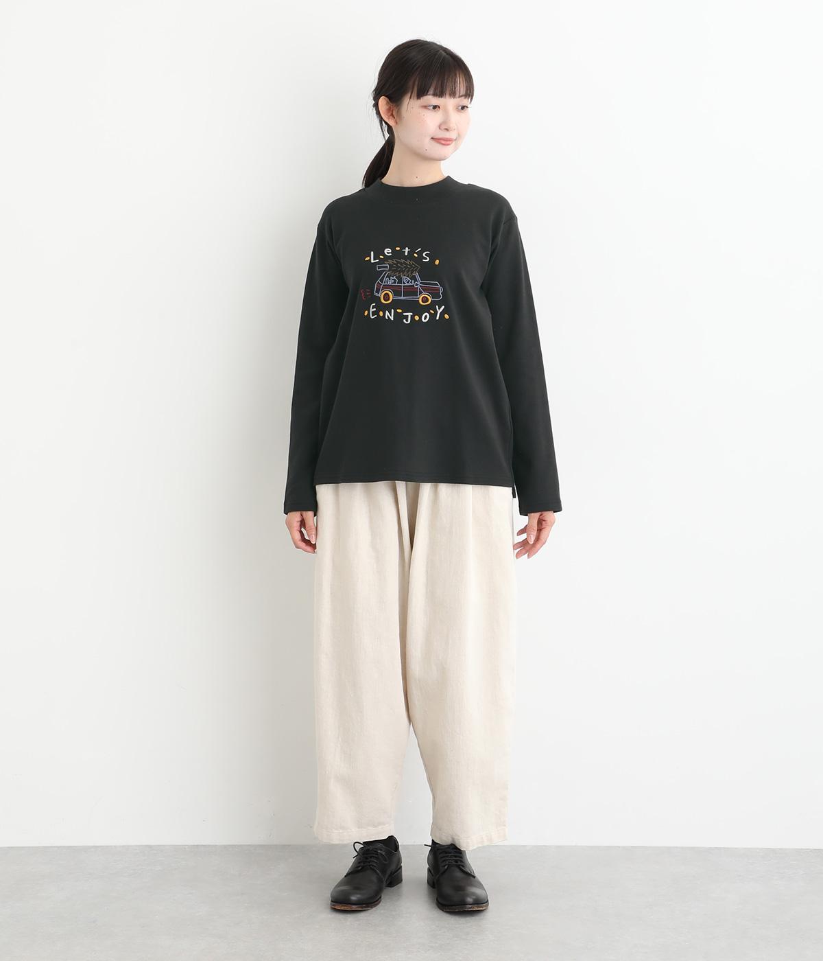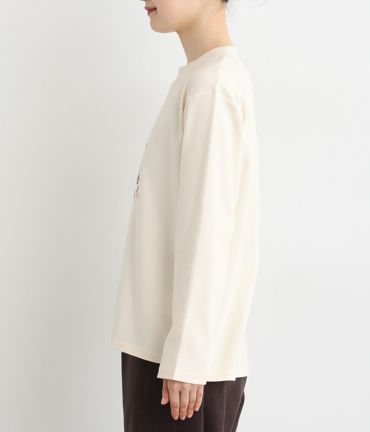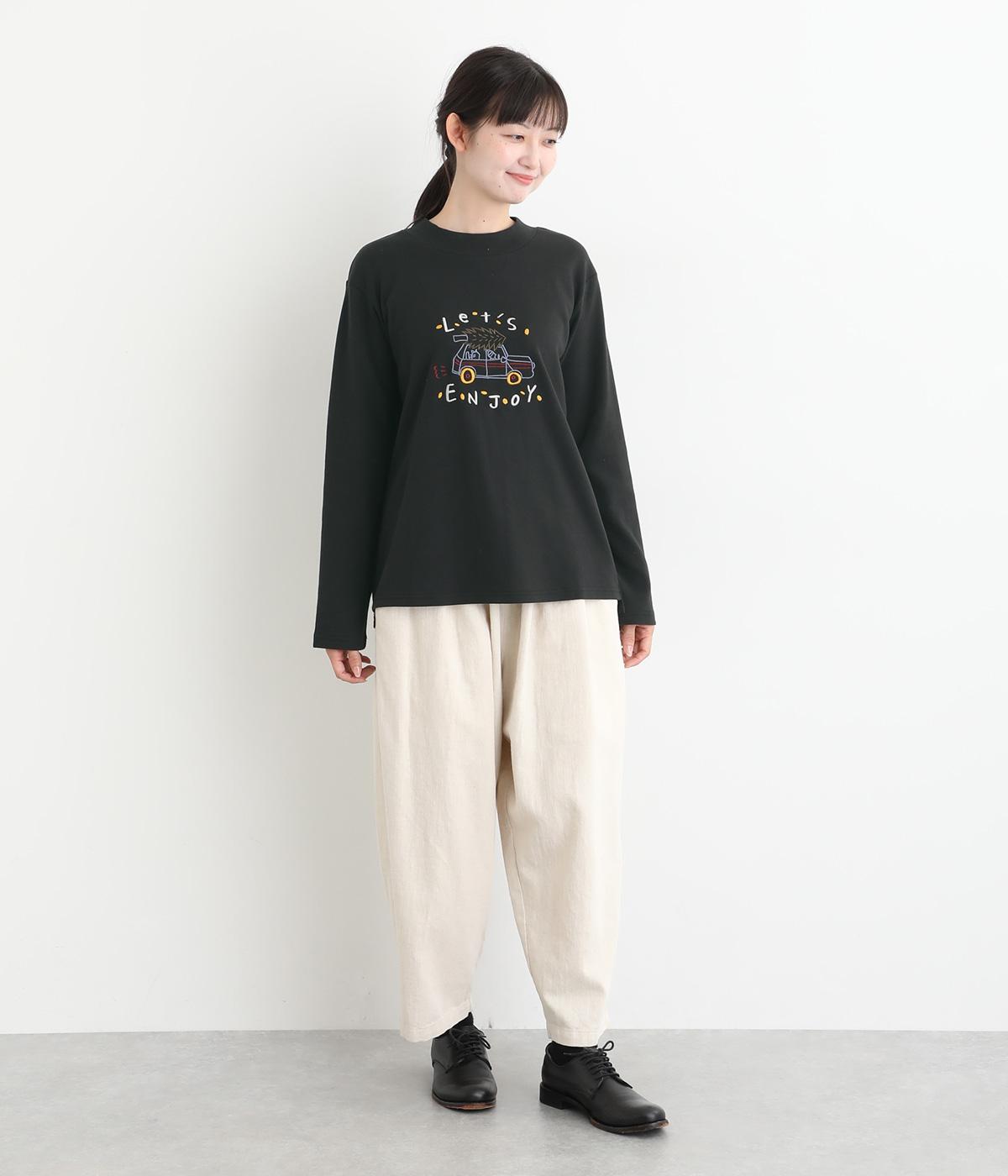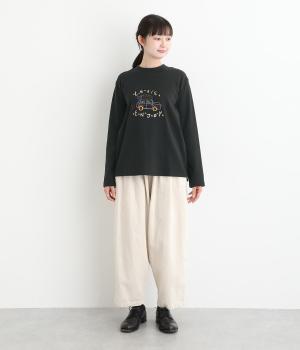 レトロ感があるポップな刺しゅうが目をひくデザインです。シンプルなシルエットながら個性のある一枚に仕上がりました。前後差をつけた裾がぬけ感を出し、コーディネートに遊び心をプラスします。