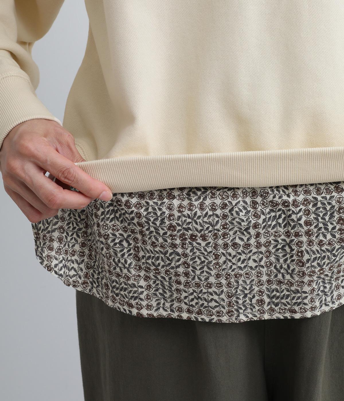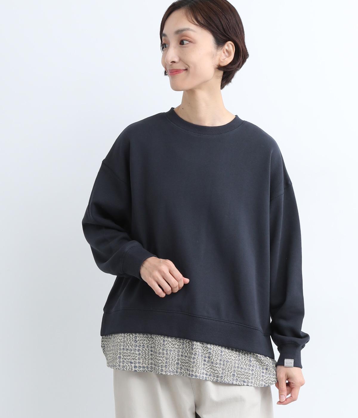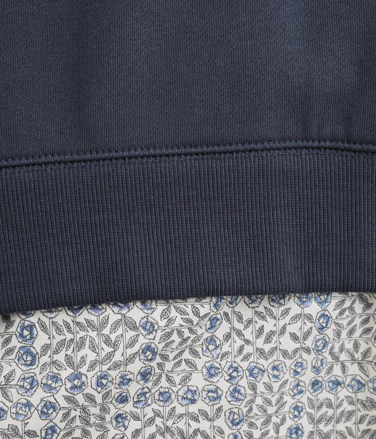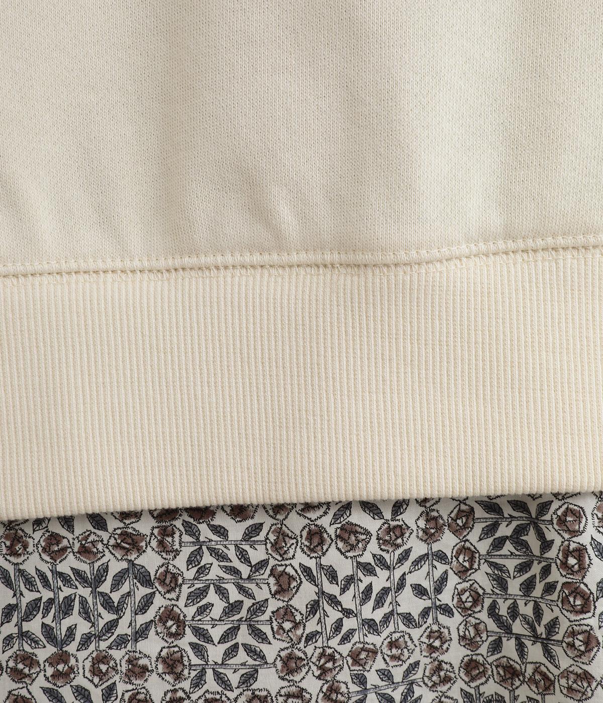 リバティプリントがちらりとのぞくデザインでトレーナーのカジュアルさに華やかさをプラスし、レイヤード風スタイルが一枚でイージーに叶います。実際には裾のみ切り替えているのでもたつくことなくすっきり着こなせるのも◎。