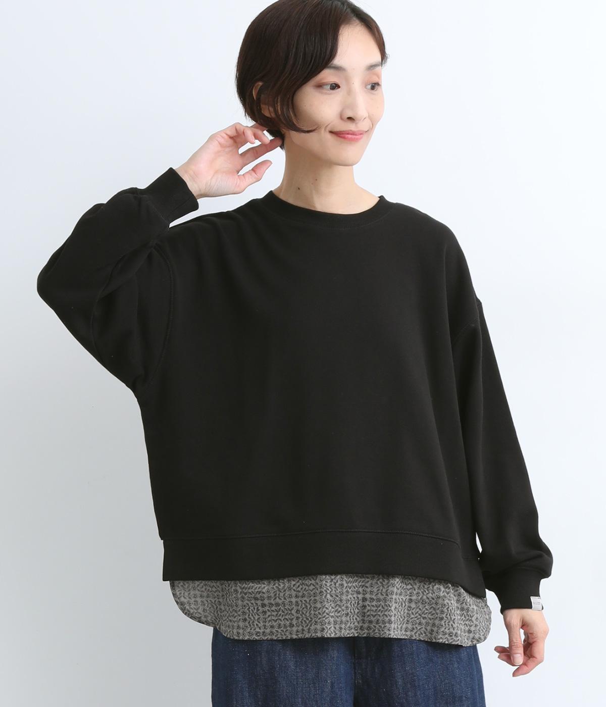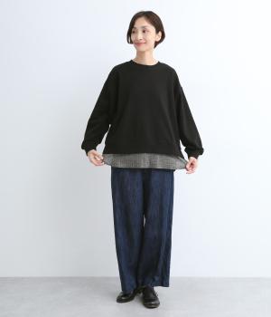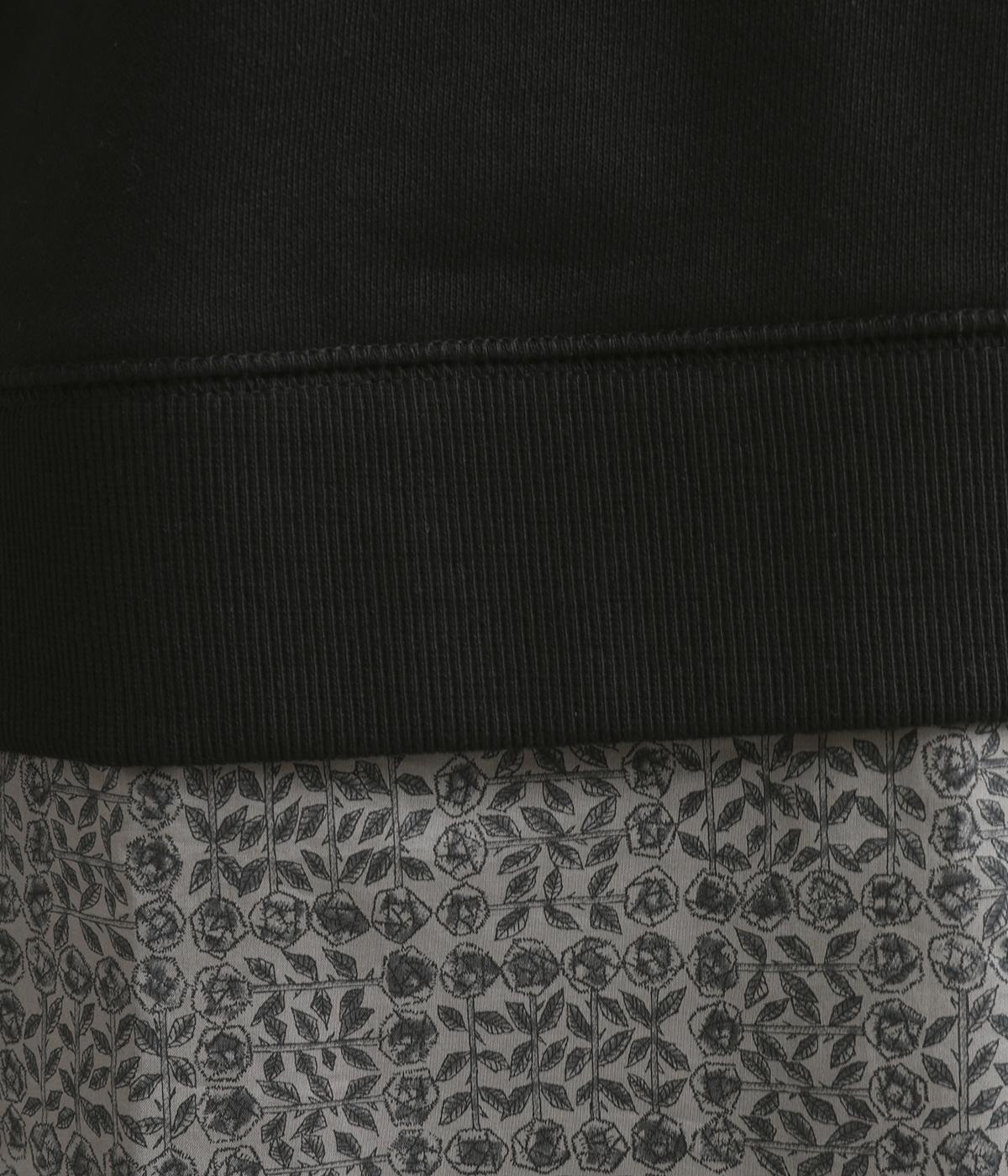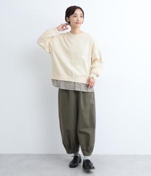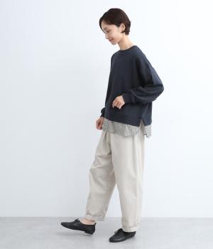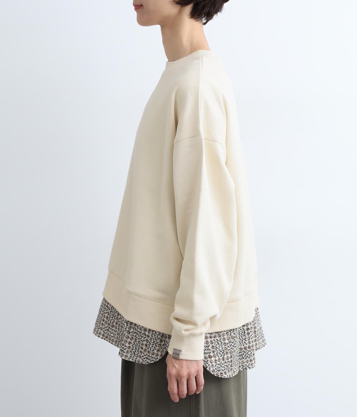 リバティプリントがちらりとのぞくデザインでトレーナーのカジュアルさに華やかさをプラスし、レイヤード風スタイルが一枚でイージーに叶います。実際には裾のみ切り替えているのでもたつくことなくすっきり着こなせるのも◎。
