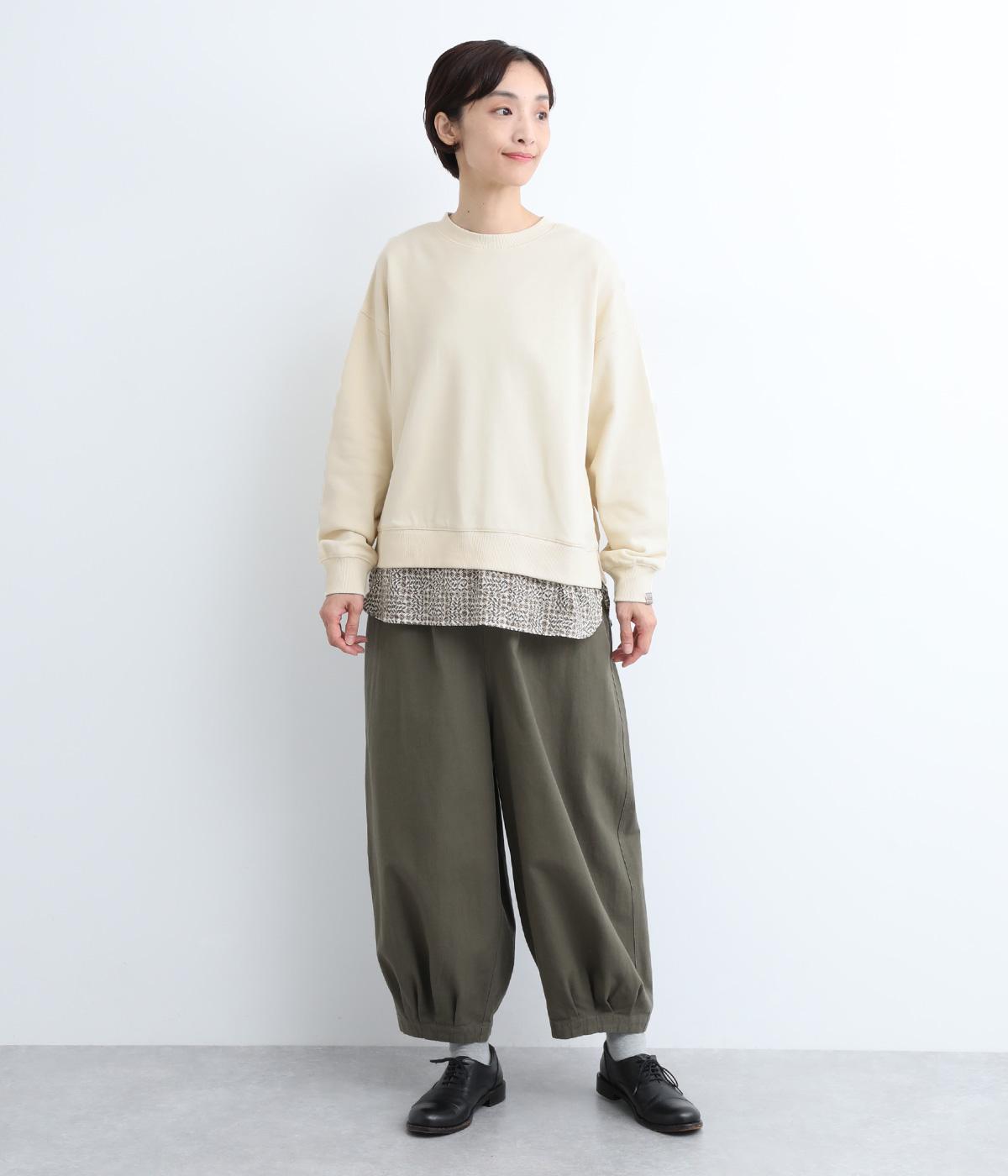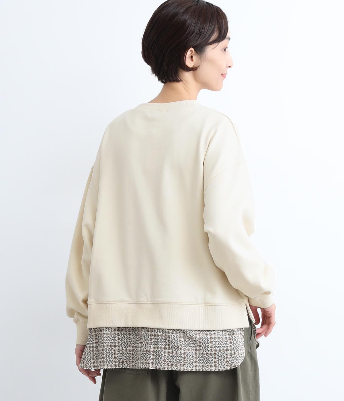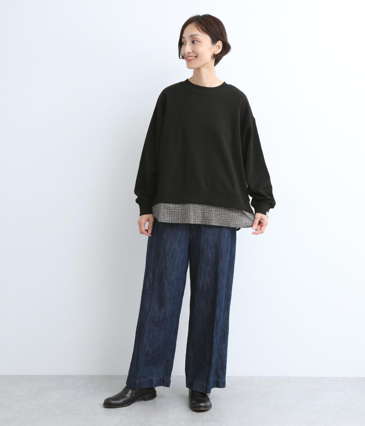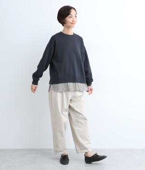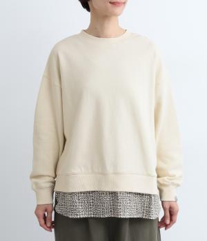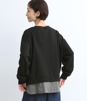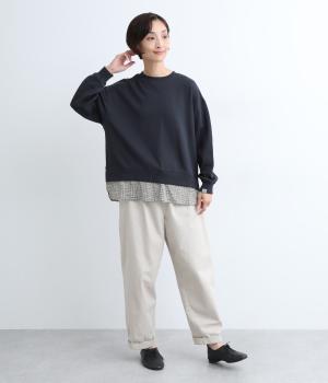 リバティプリントがちらりとのぞくデザインでトレーナーのカジュアルさに華やかさをプラスし、レイヤード風スタイルが一枚でイージーに叶います。実際には裾のみ切り替えているのでもたつくことなくすっきり着こなせるのも◎。