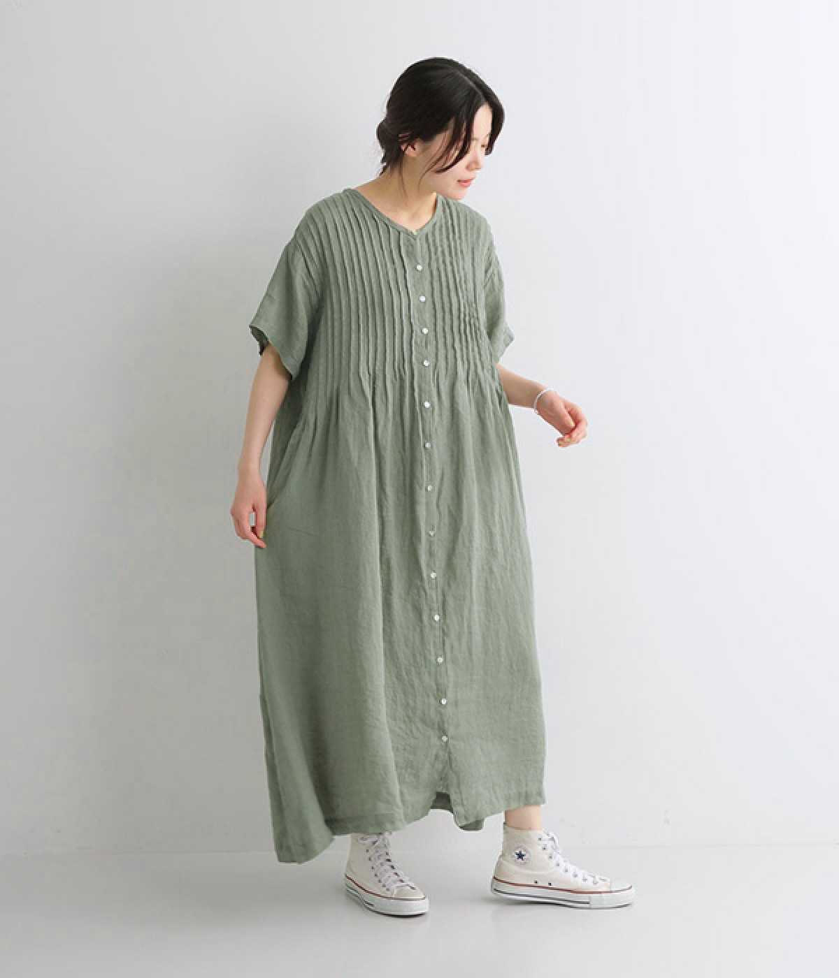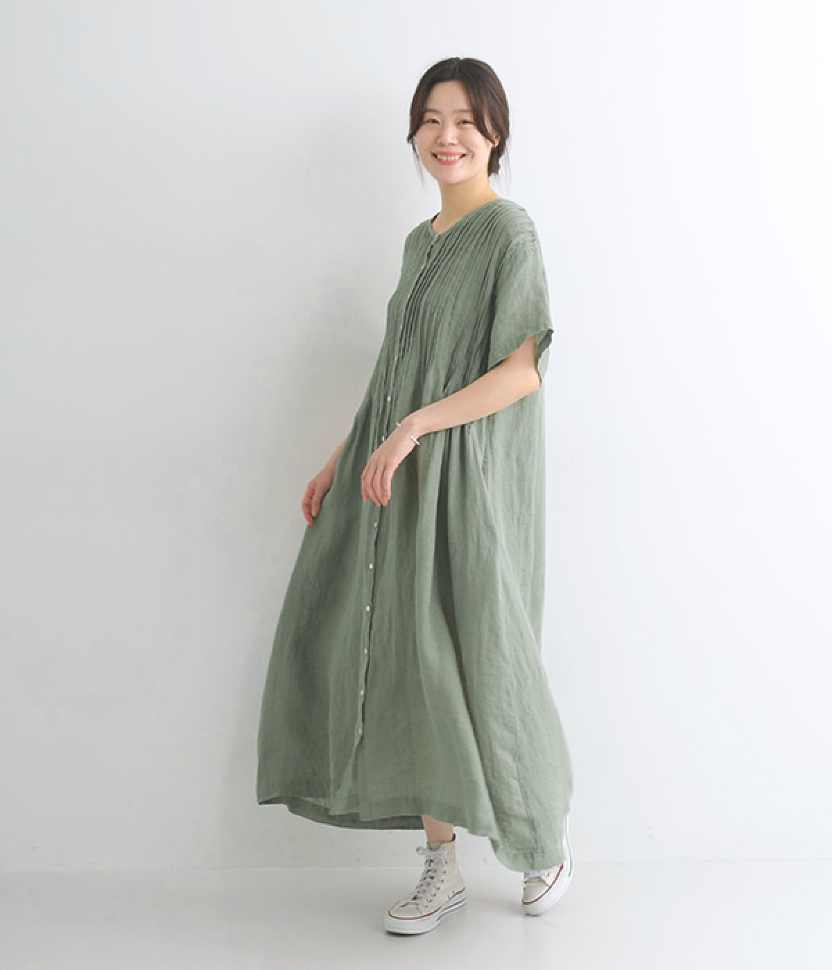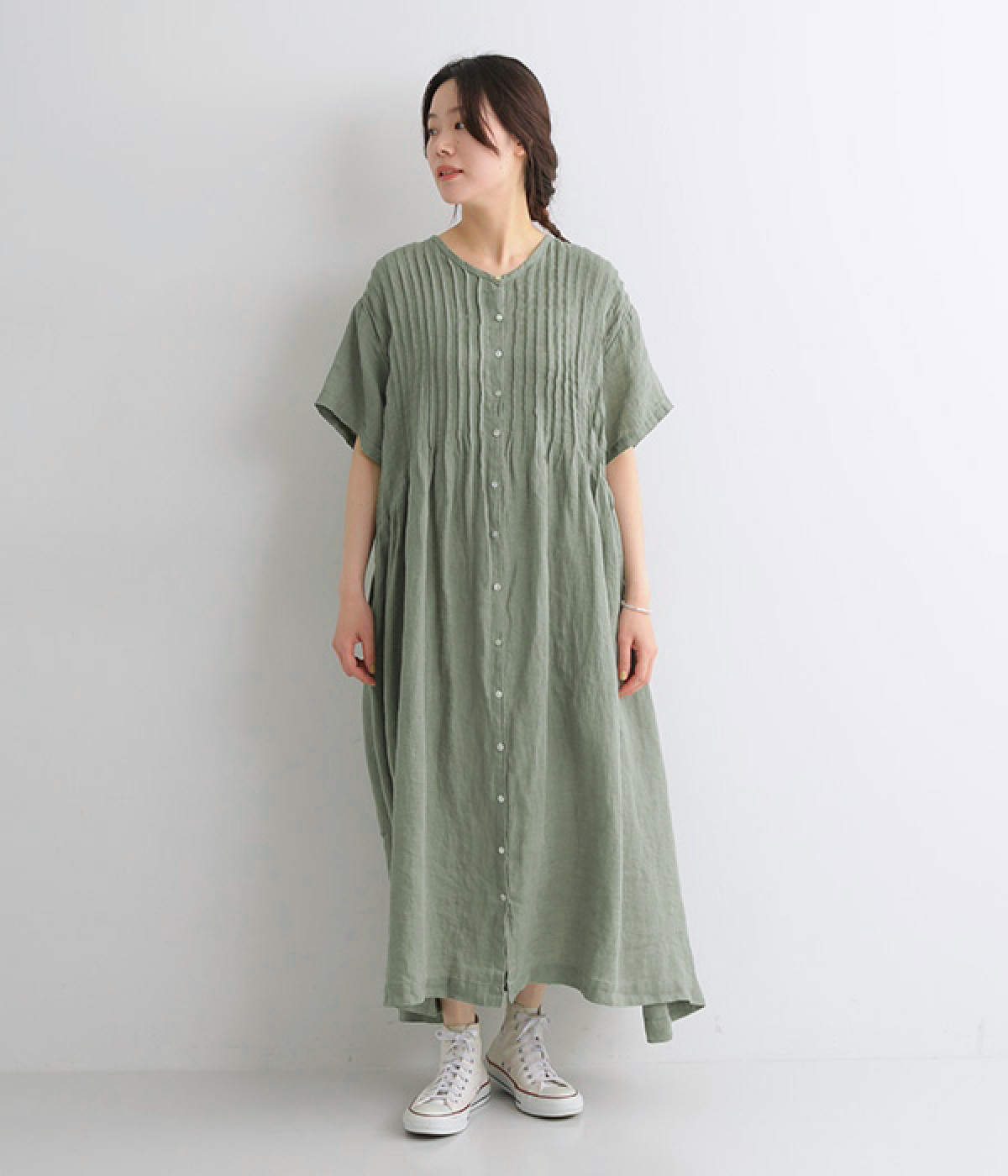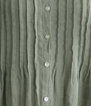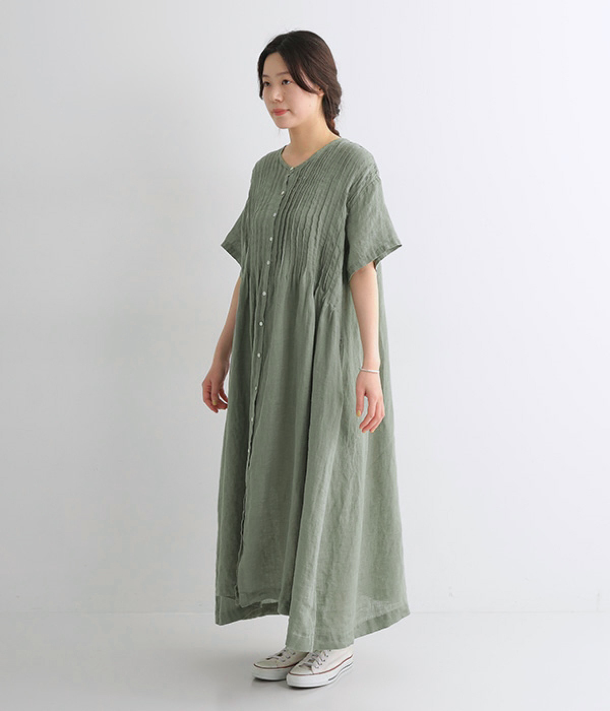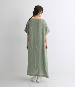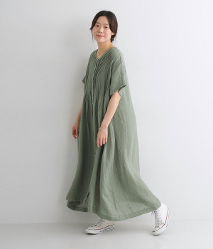 リネンシャンブレー 前ピンタックワンピース(ダルグリーン-ONESIZE)
