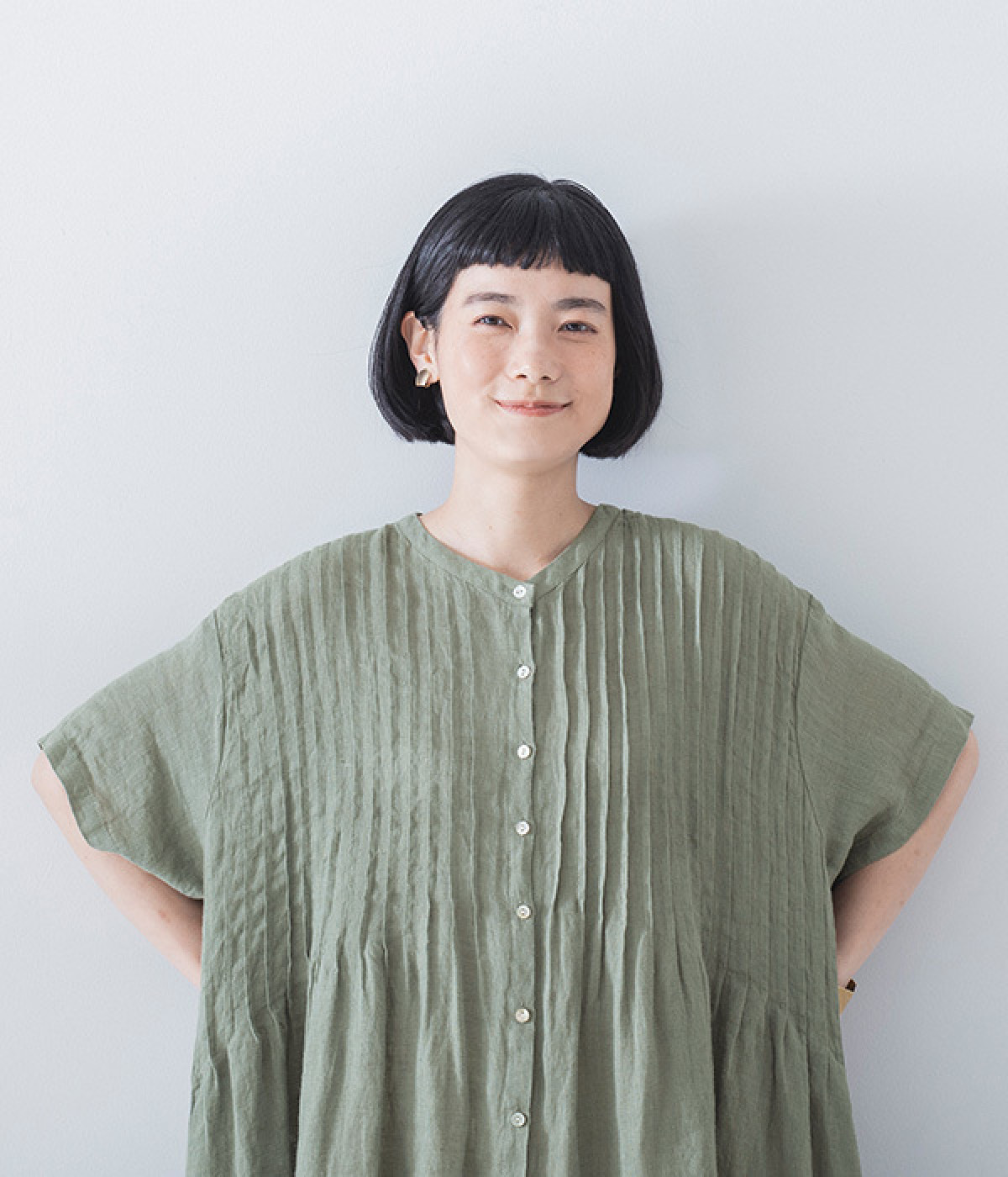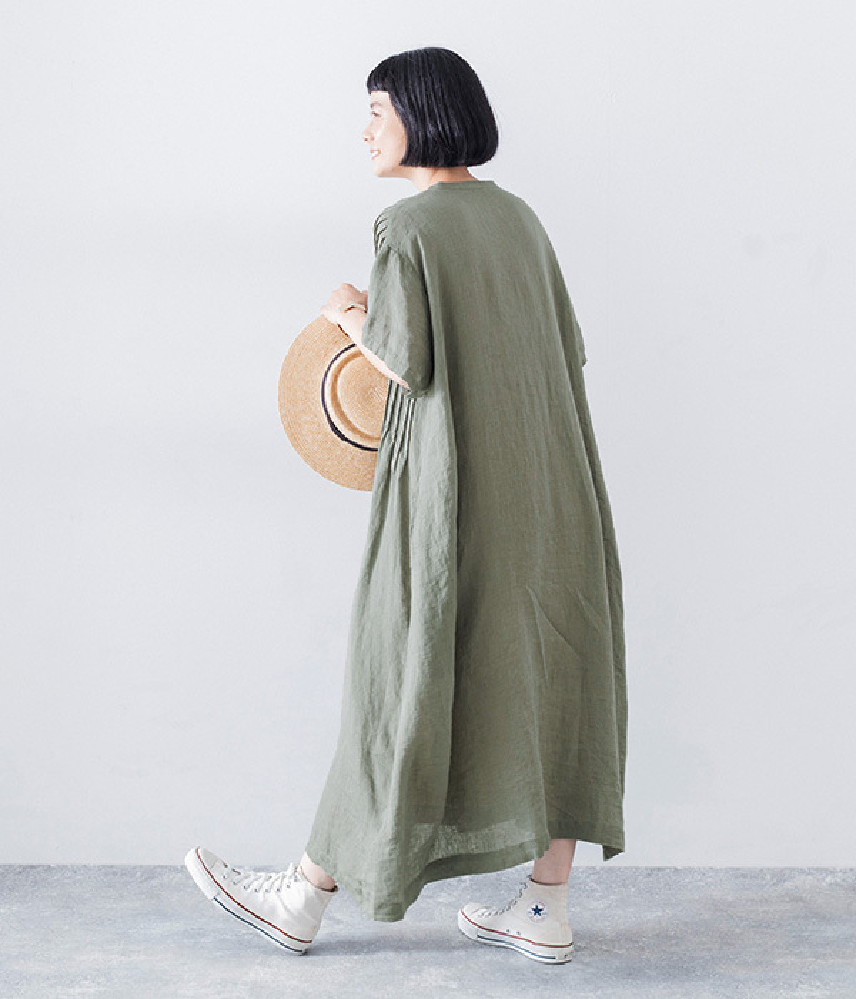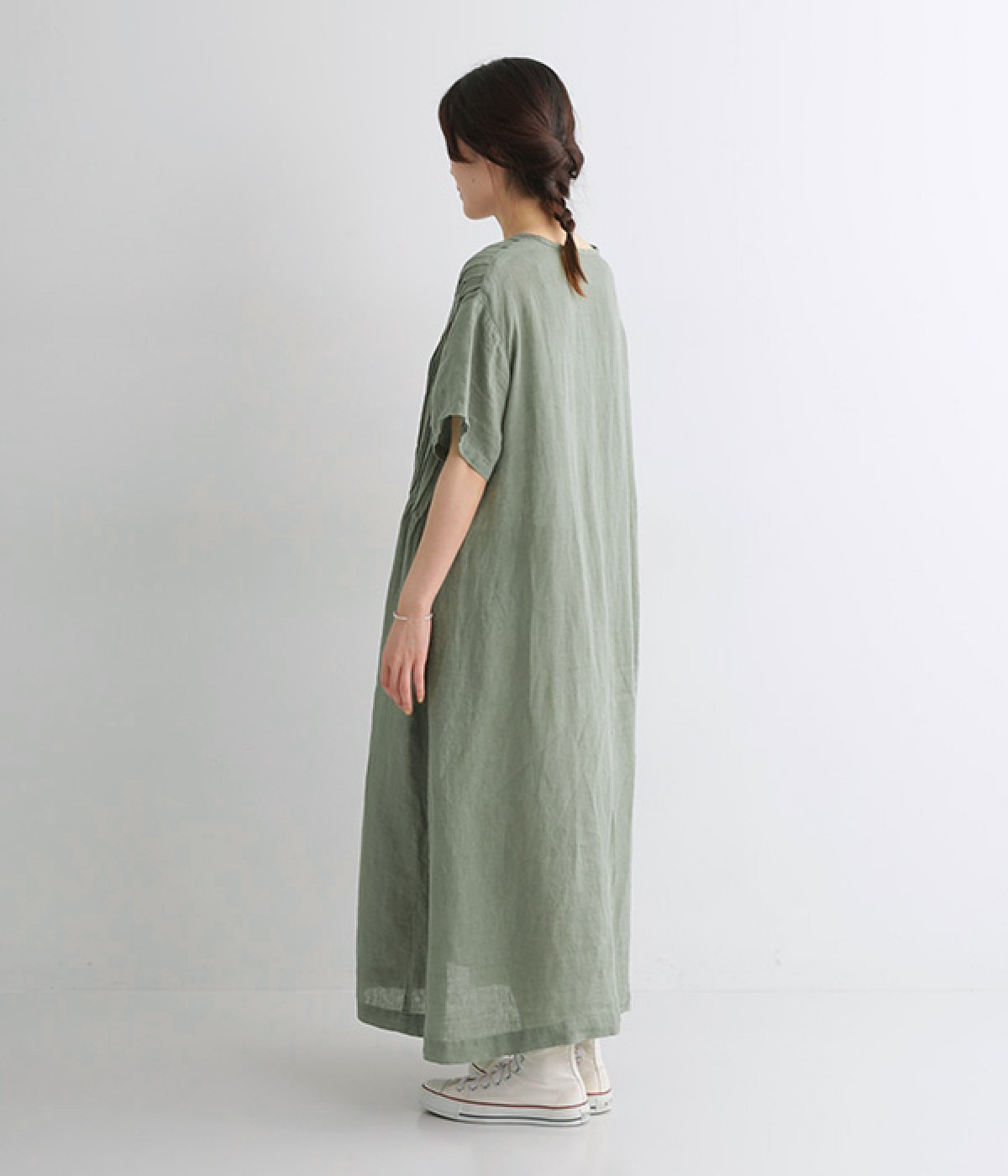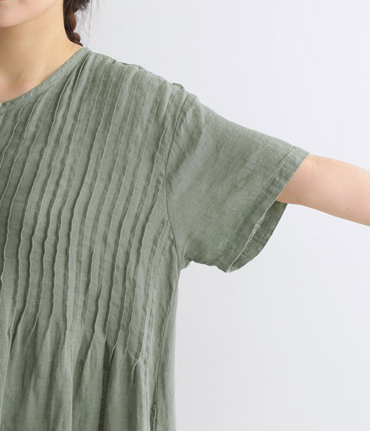 リネンシャンブレー 前ピンタックワンピース(ダルグリーン-ONESIZE)