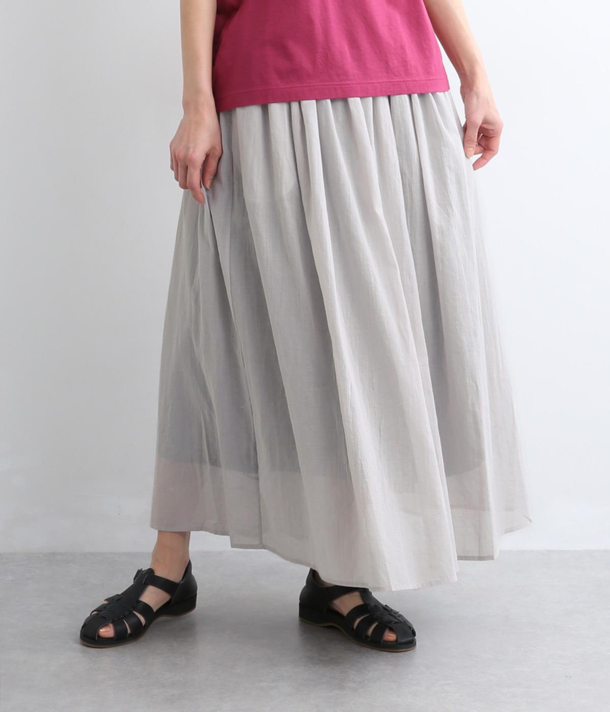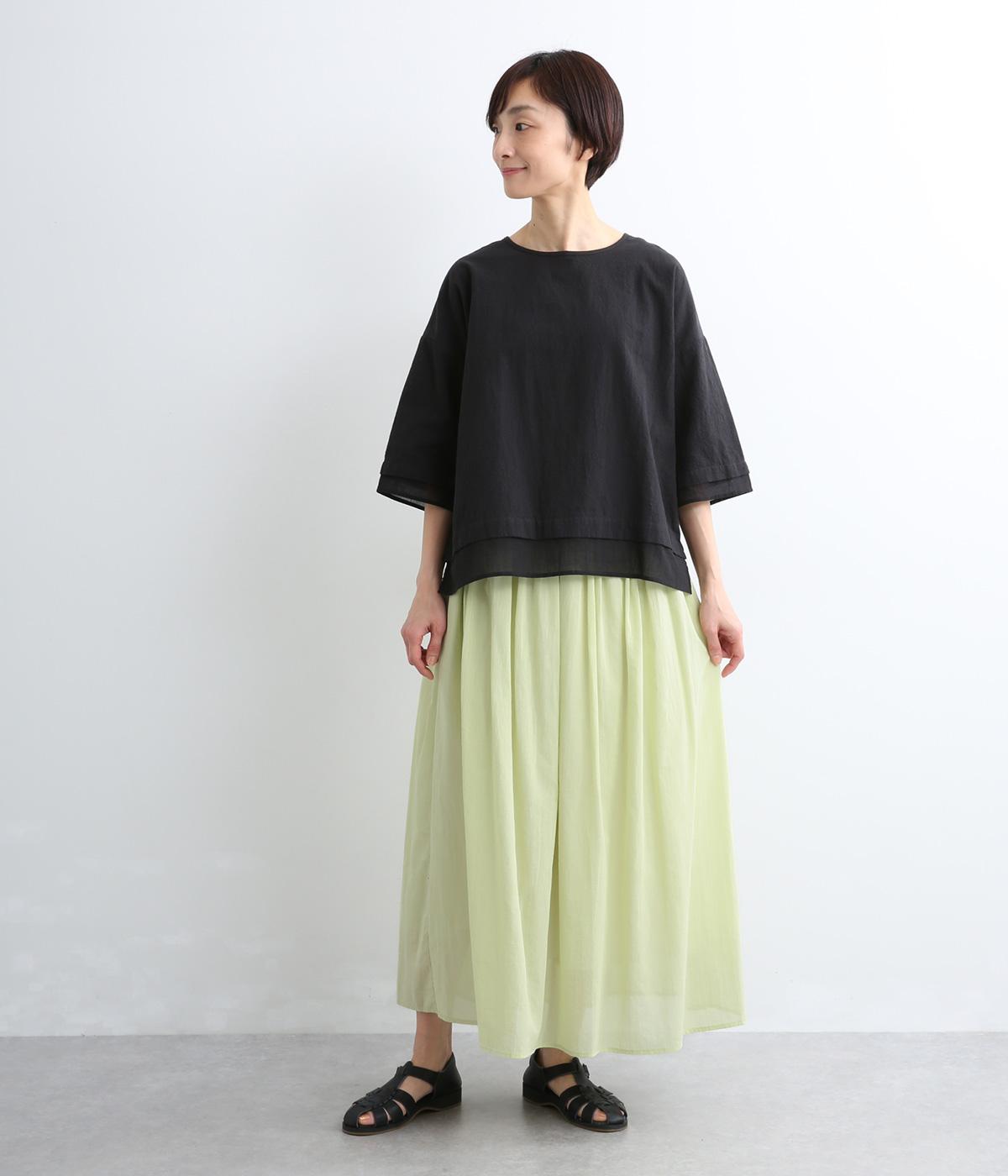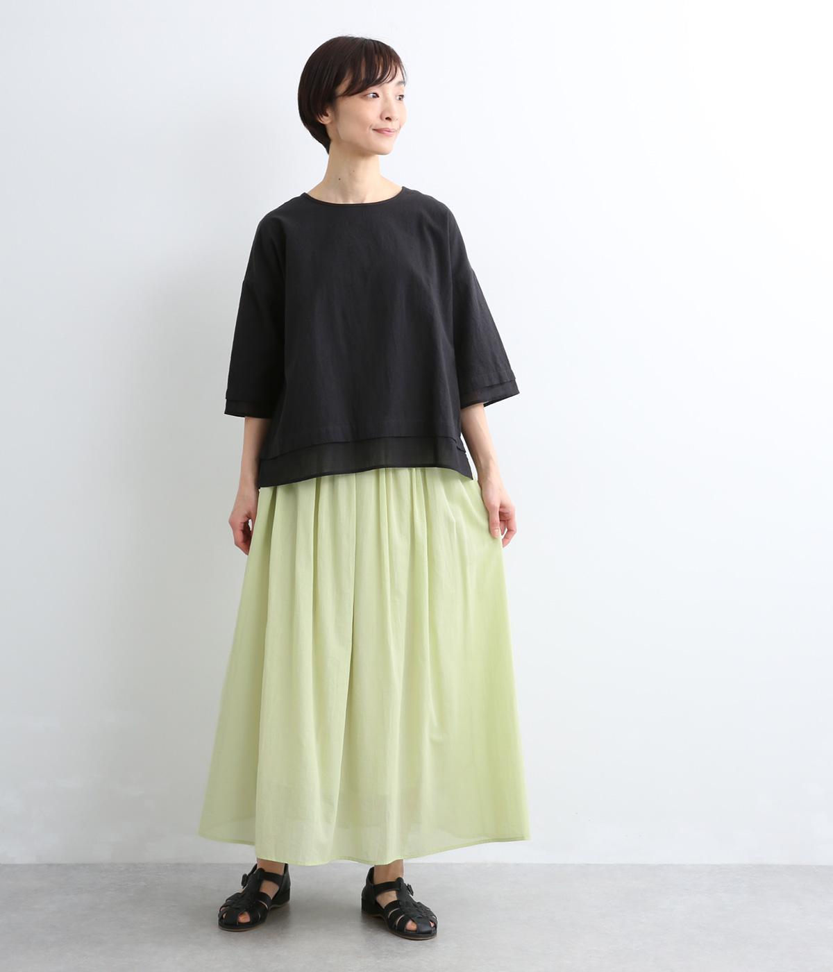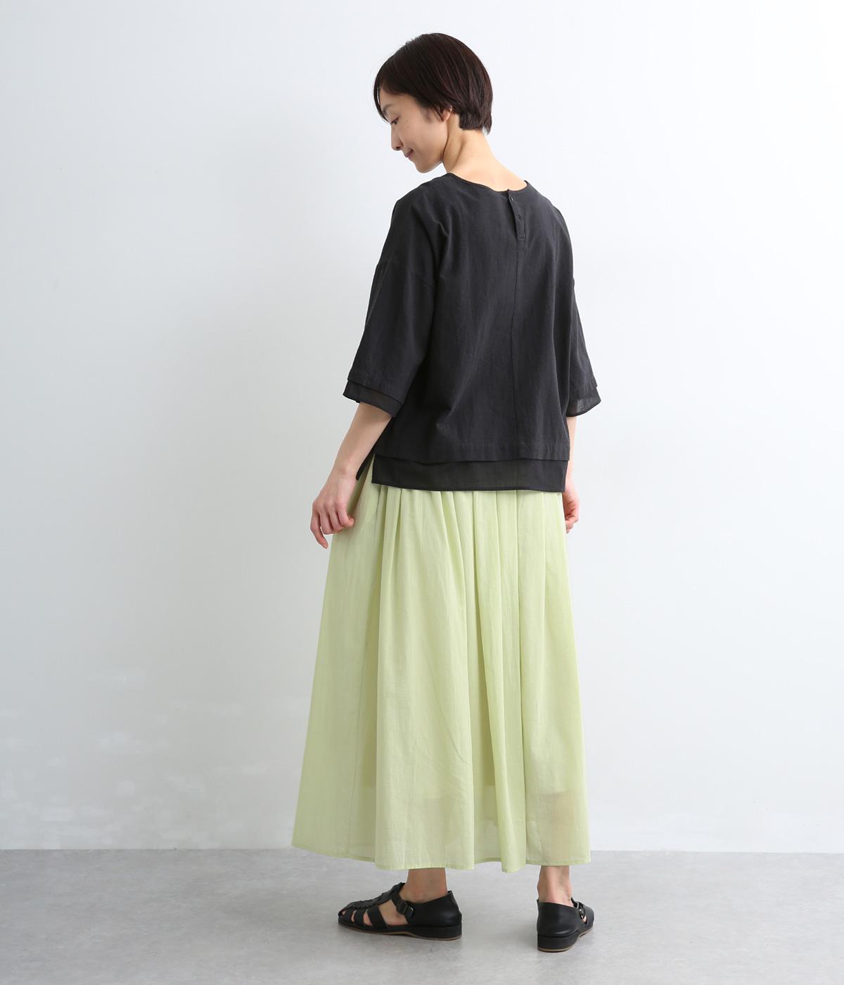 透け感のあるガーゼ素材と、ほどよい厚みの天竺素材を重ねた、二層仕立てのスカートです。異素材のコントラストで奥行きのある表情に。ほどよいボリュームのAラインシルエットが動くたびにゆれ、女性らしさを引き立てます。シンプルなトップスと合わせるだけで、華やかなコーディネートに仕上がる一枚です。