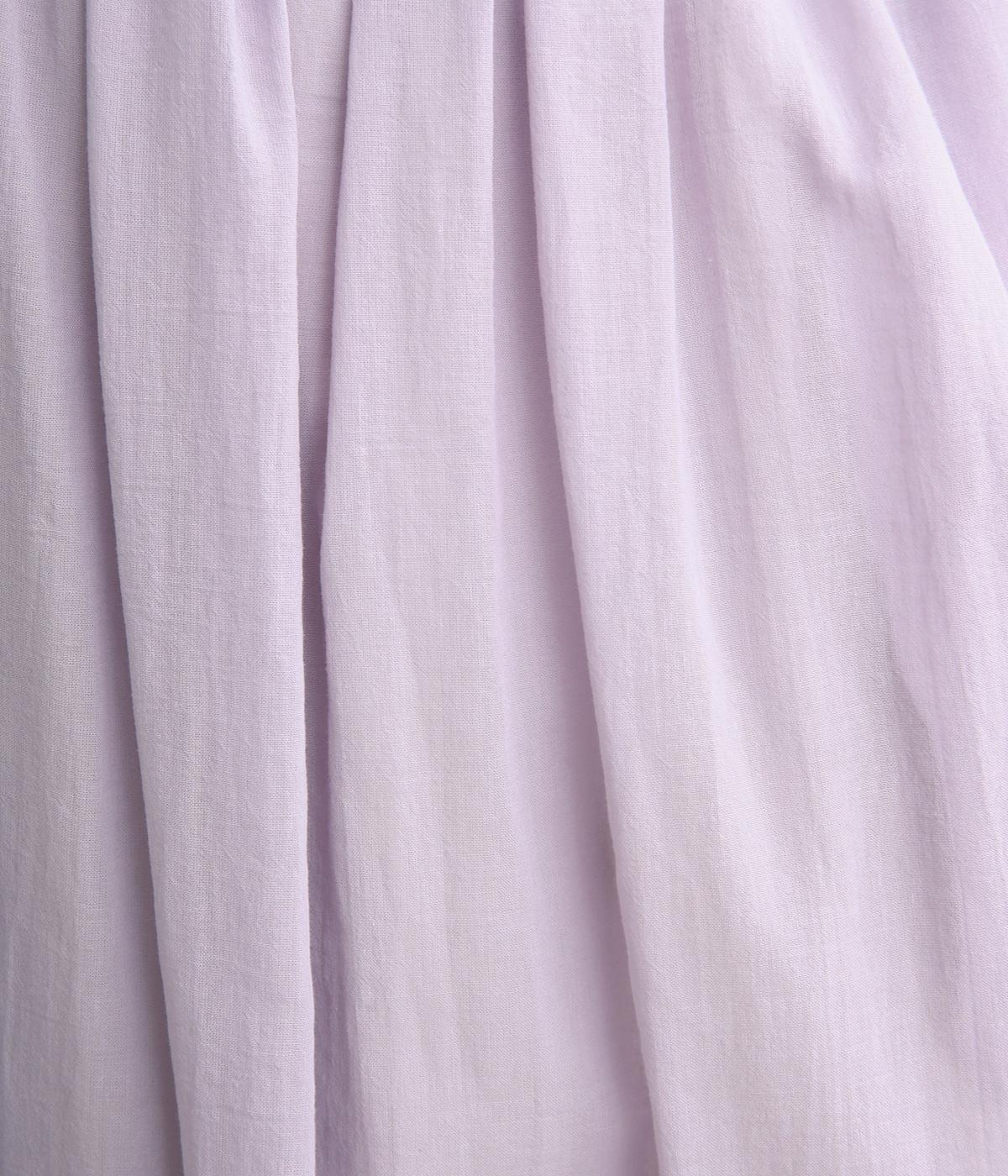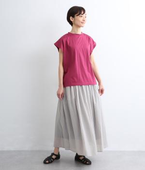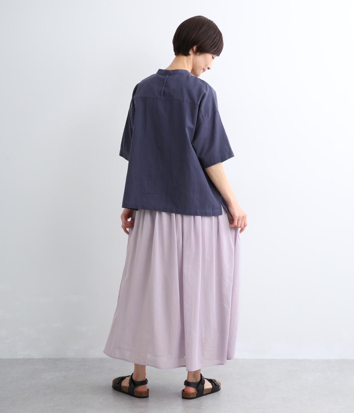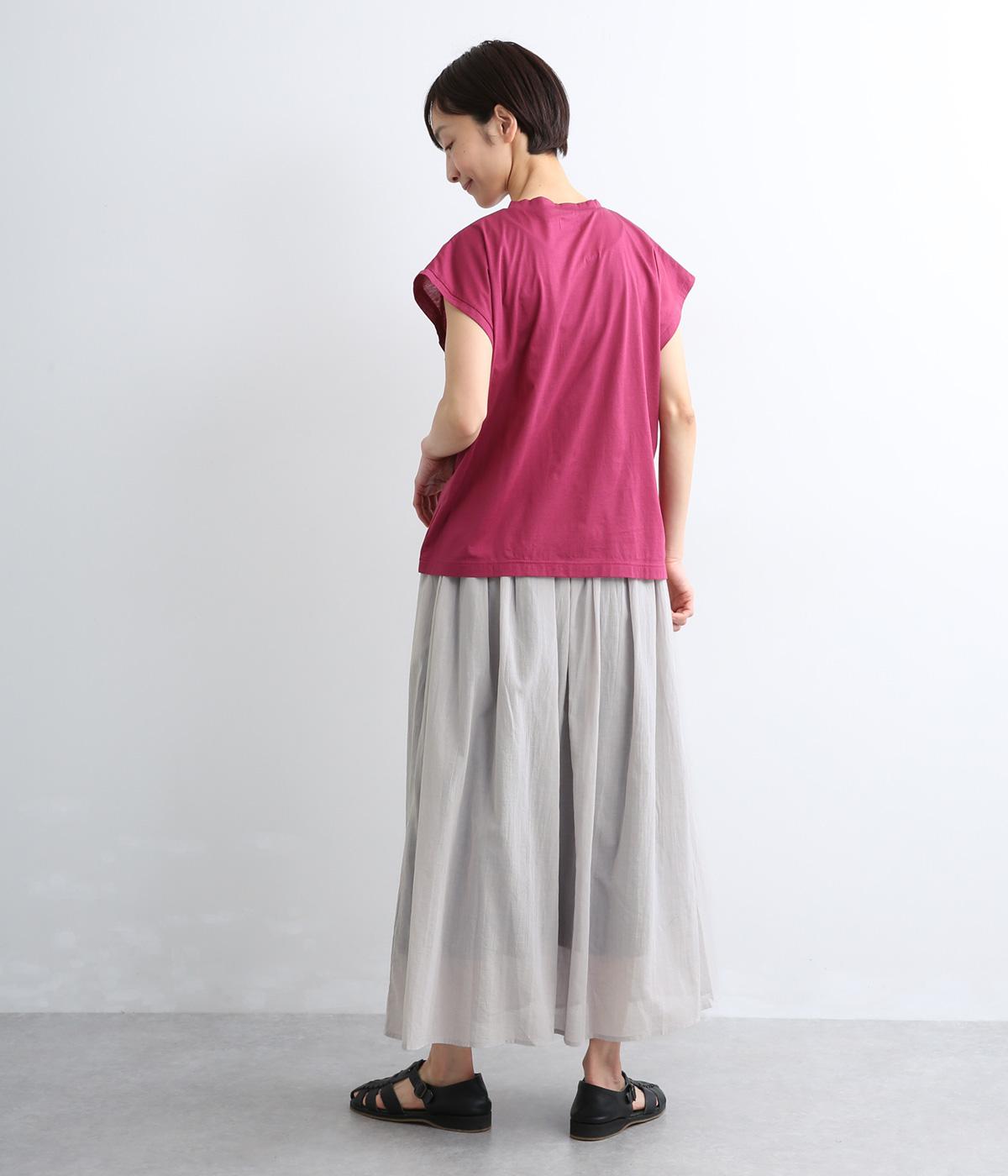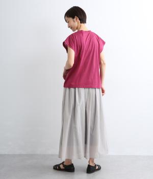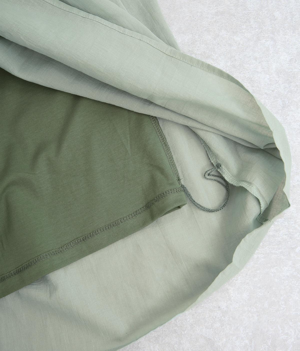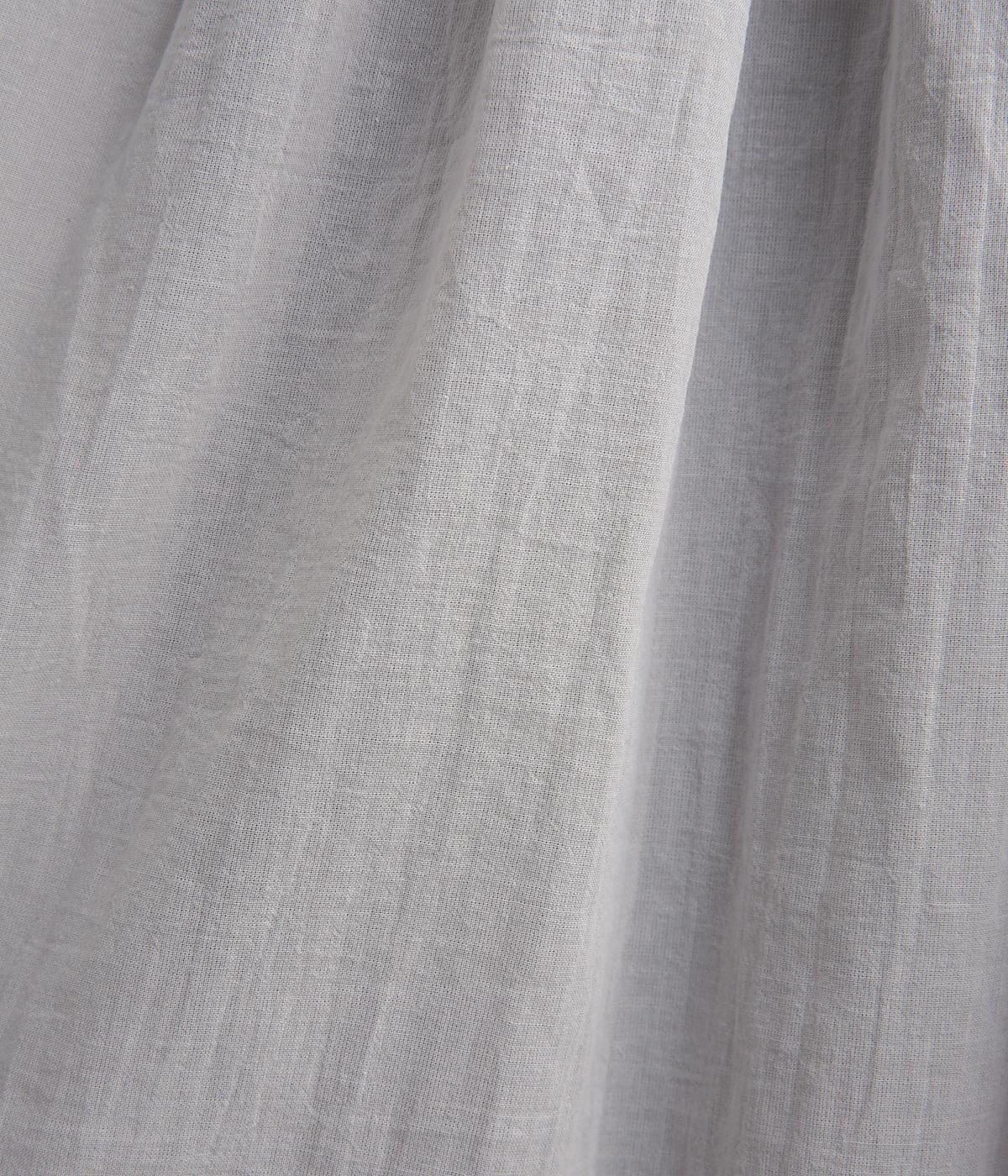 外側にはやわらかなガーゼ素材を重ね、ほんのり透ける軽やかな表情に仕上げました。裏地は、シルケット加工を施したのびのよいコットン天竺を合わせ、するりとしたなめらかな肌ざわりに。さらりとした質感と通気性のよさで、心地よく着用できます。