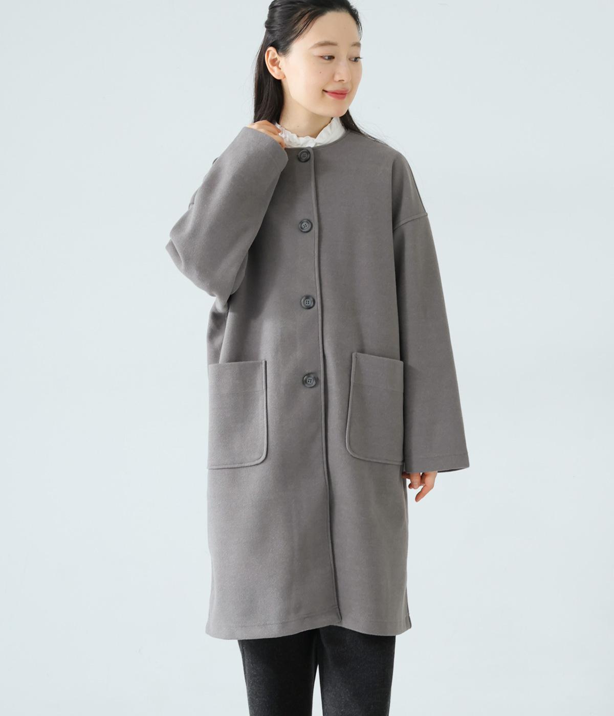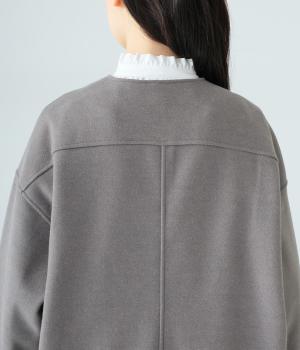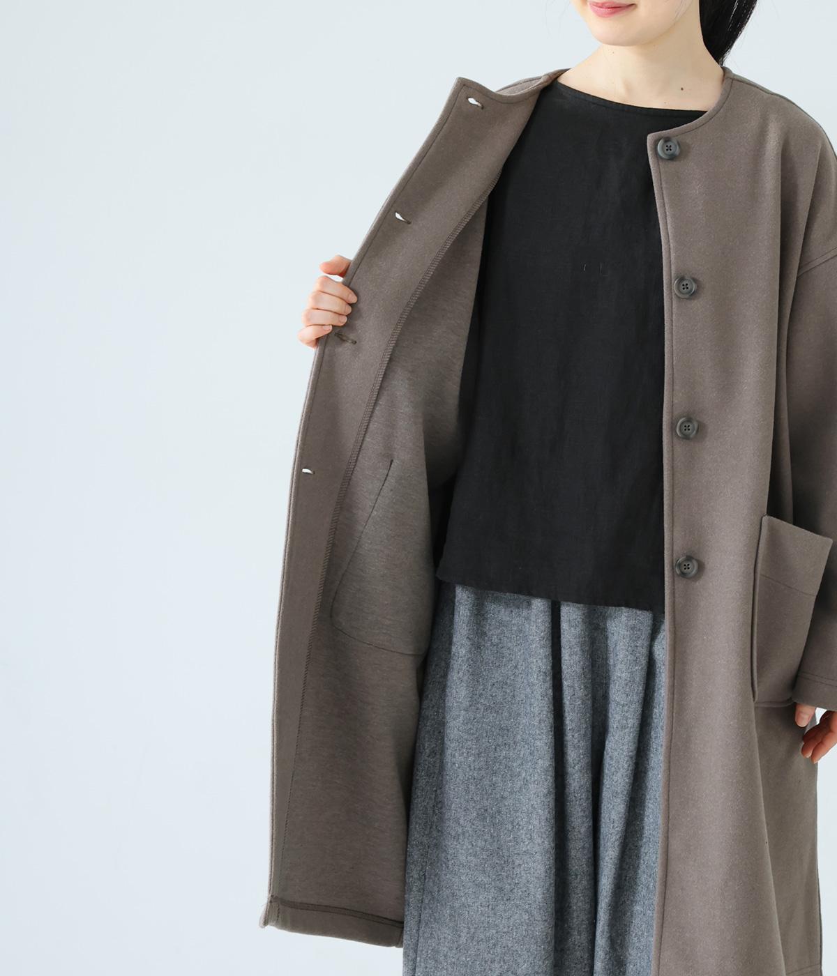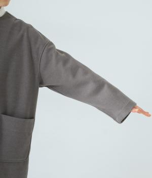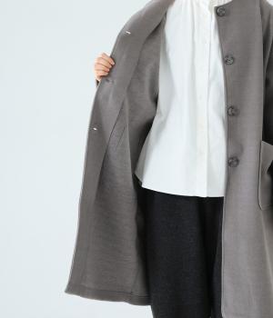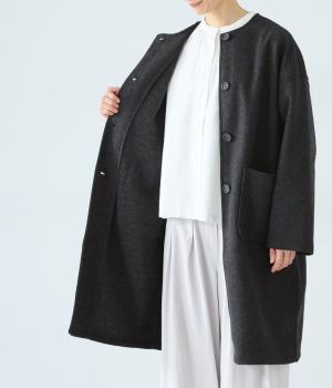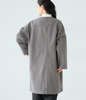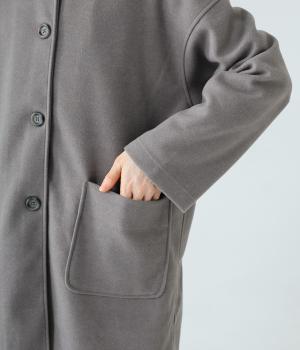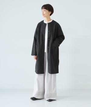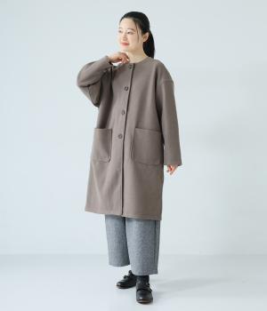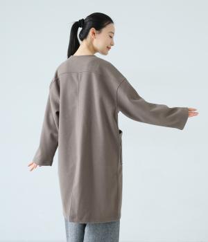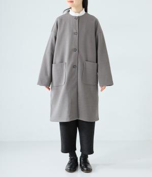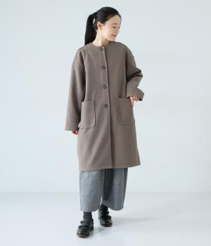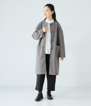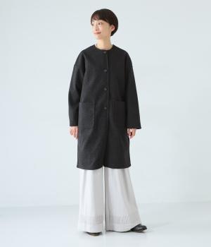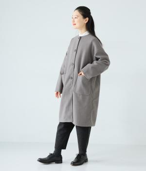 シンプルなノーカラーデザインで上品に仕上げたコート。フロントの大きなパッチポケットがアクセントです。ゆったりとしたサイズ感で、さまざまな装いにごわつきなく羽織りやすいのが◎。後ろ裾にスリットを入れているので足さばきも快適です。