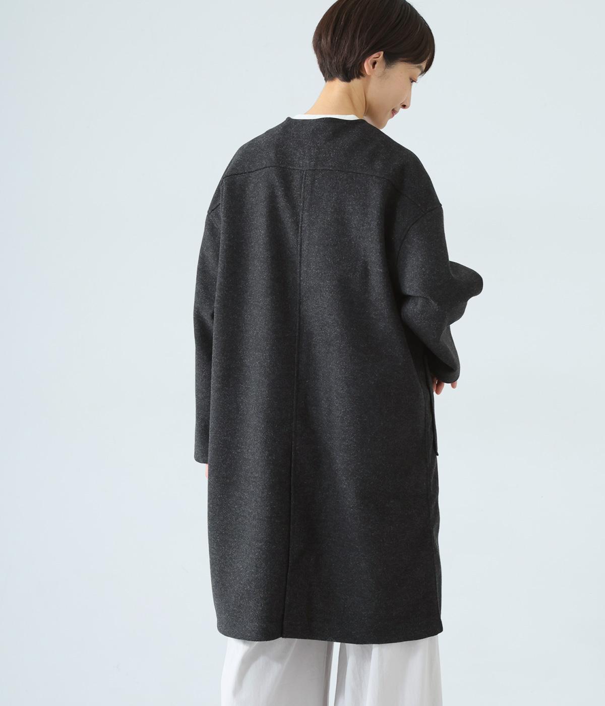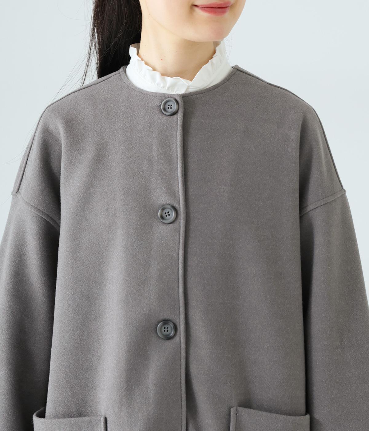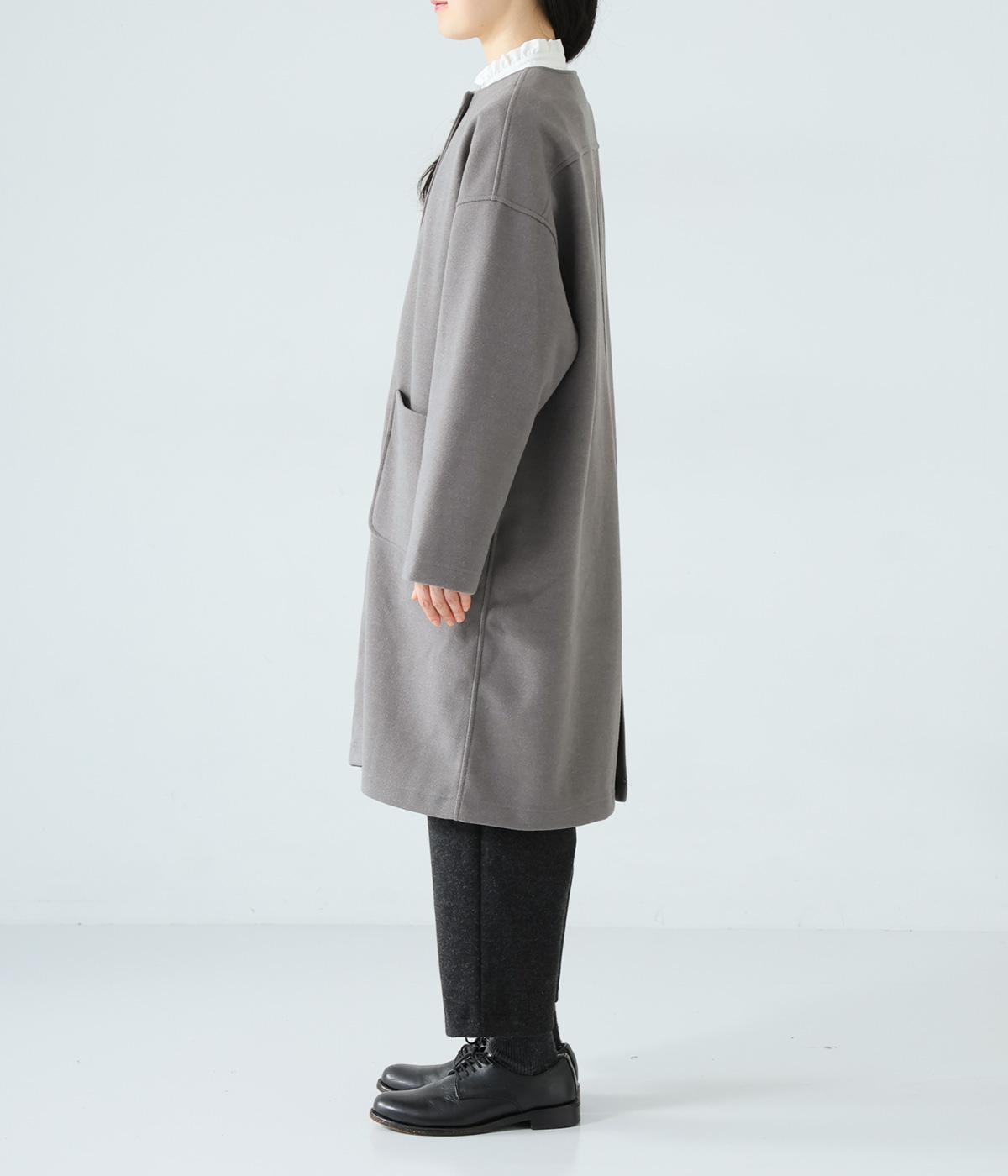 シンプルなノーカラーデザインで上品に仕上げたコート。フロントの大きなパッチポケットがアクセントです。ゆったりとしたサイズ感で、さまざまな装いにごわつきなく羽織りやすいのが◎。後ろ裾にスリットを入れているので足さばきも快適です。