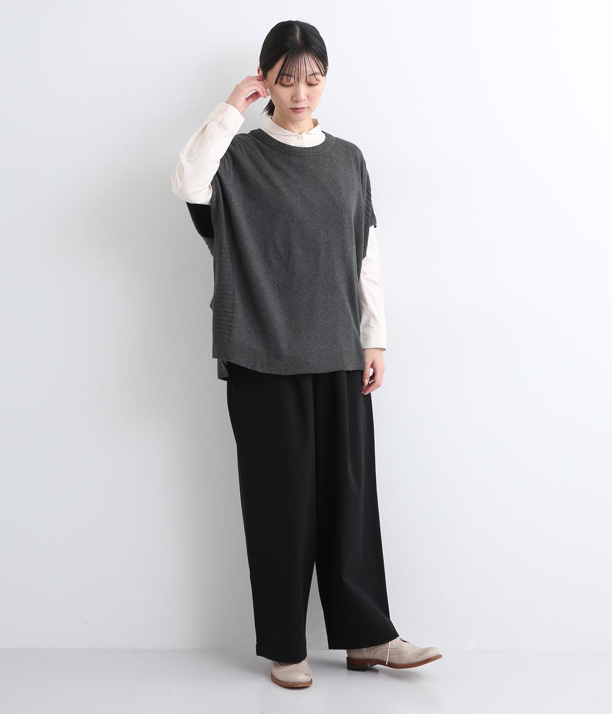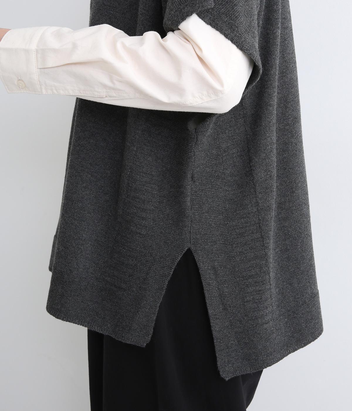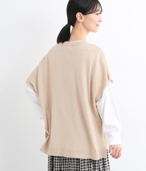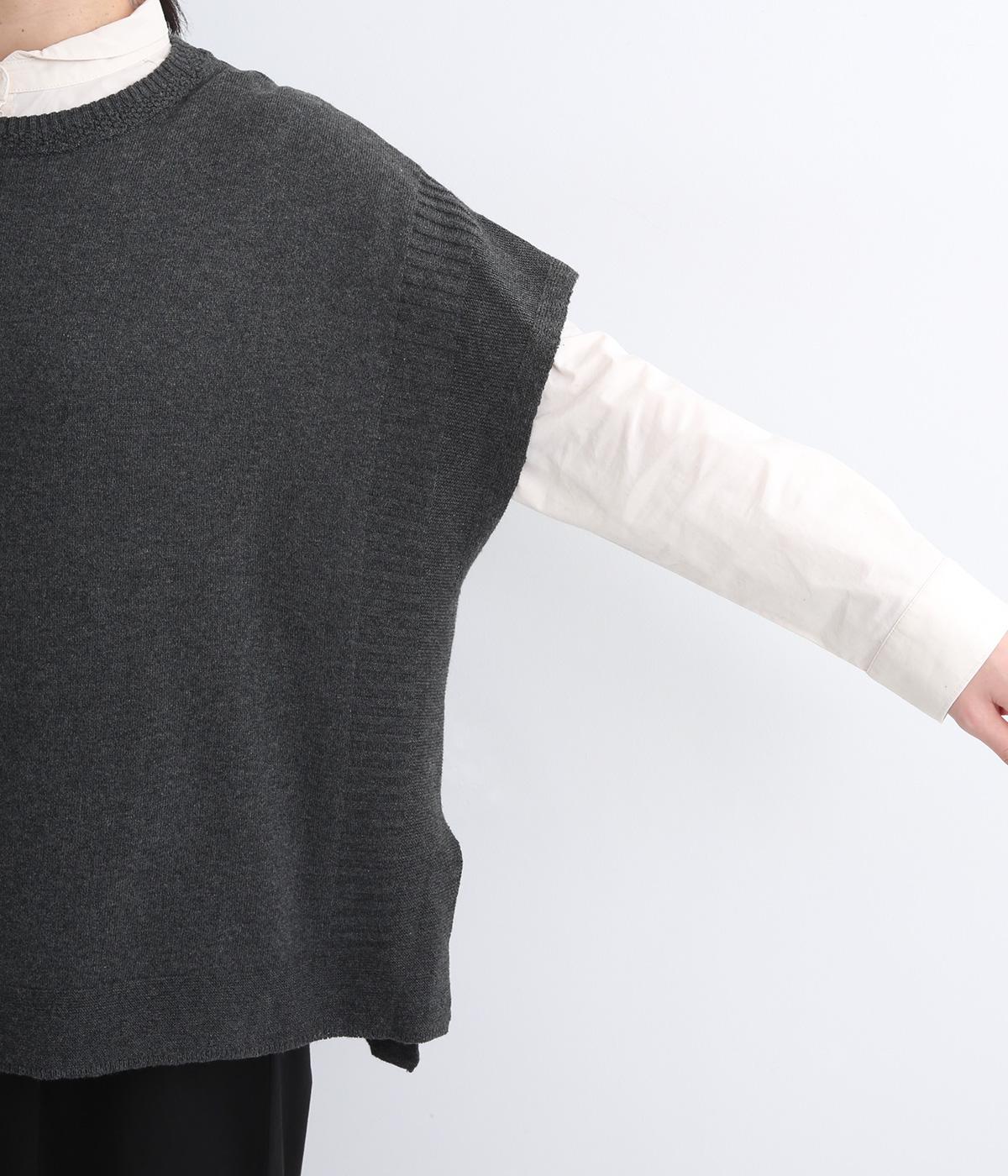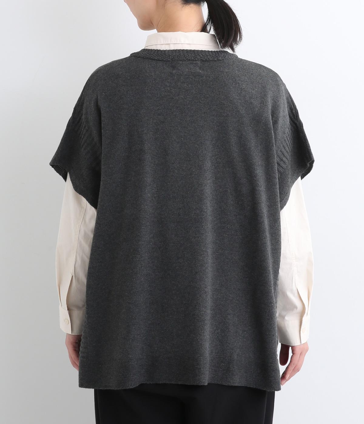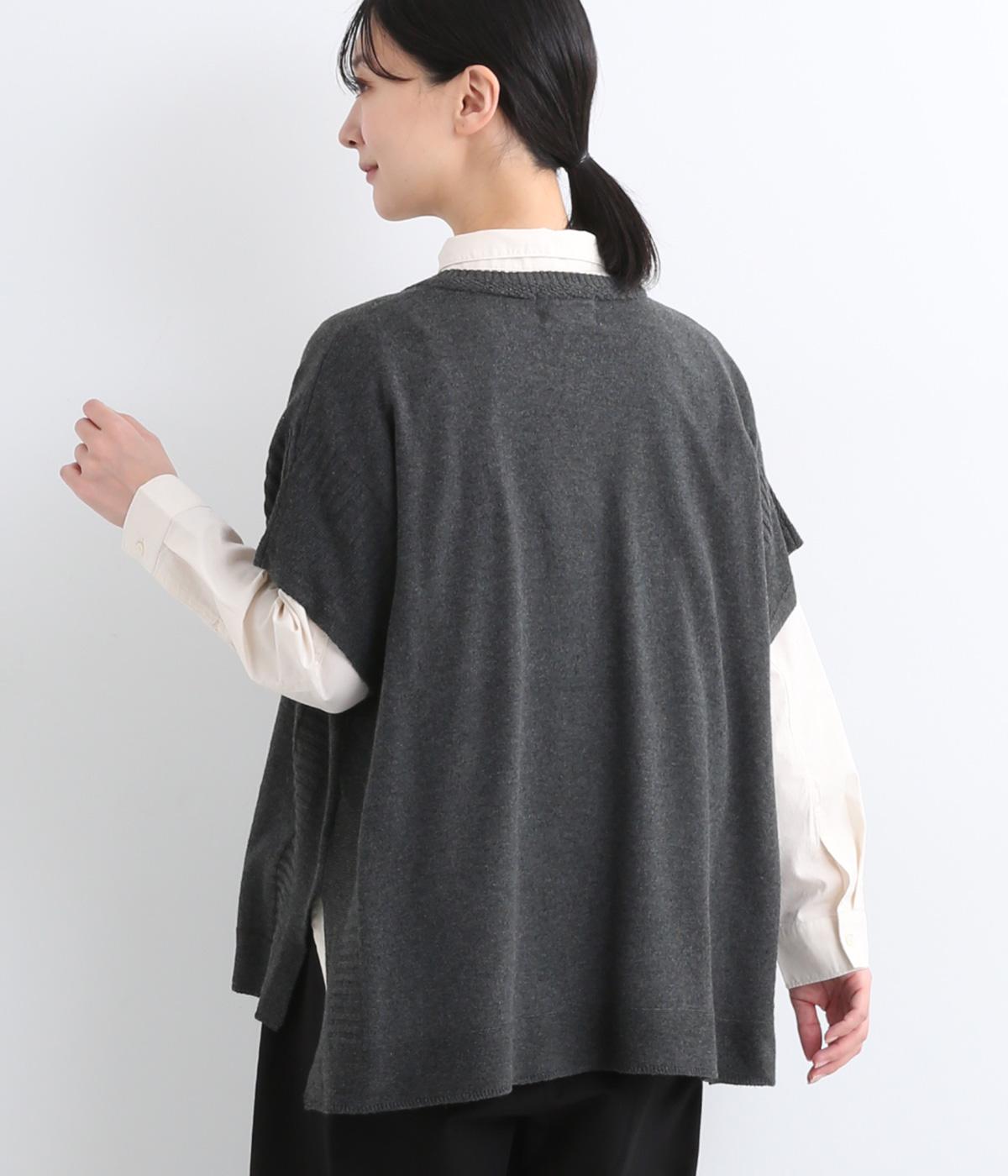 襟ぐりとアームホールの柄編みがアクセントになったニットベスト。ゆとりのあるシルエットで、さまざまなトップスとのレイヤードが楽しめます。サイドスリットを入れ前後差をつけた裾は、縦長ラインを強調しすっきり見せも叶えます。