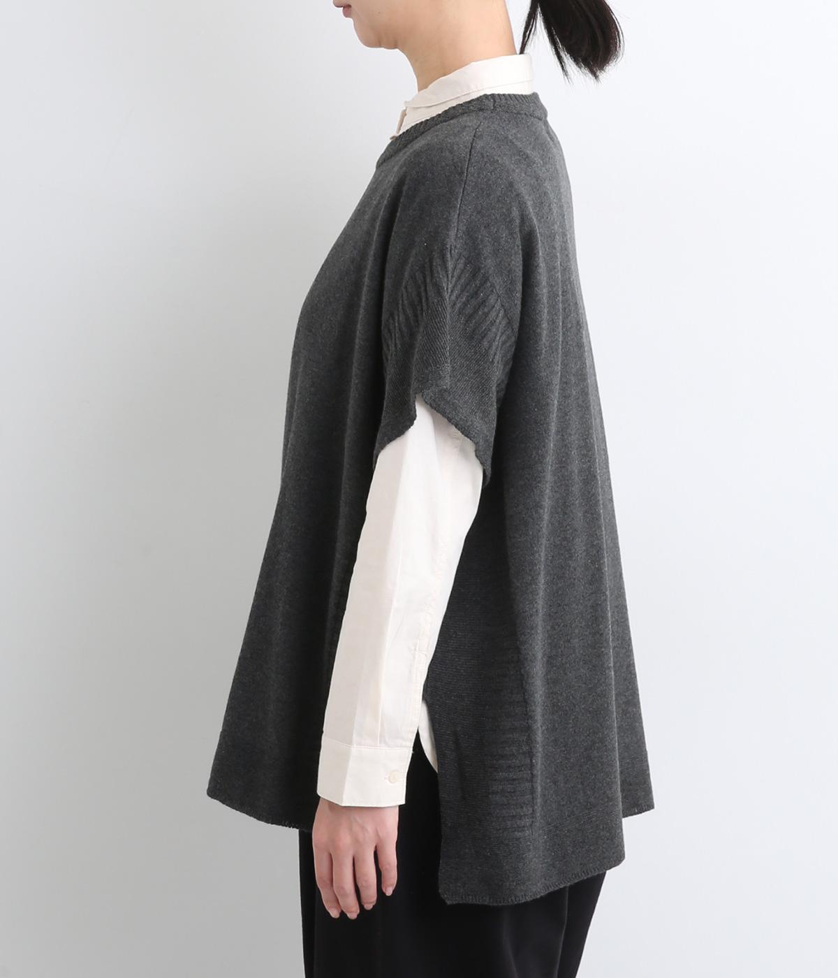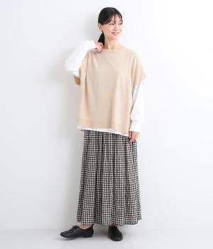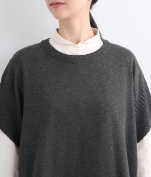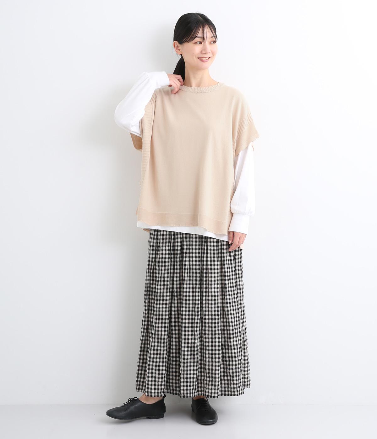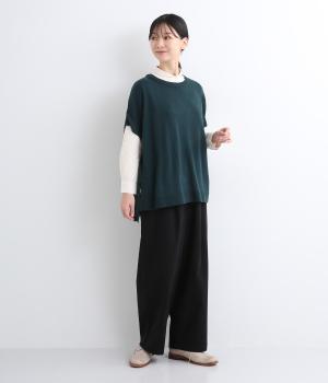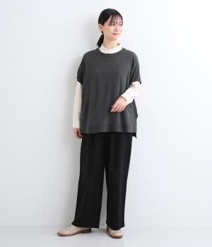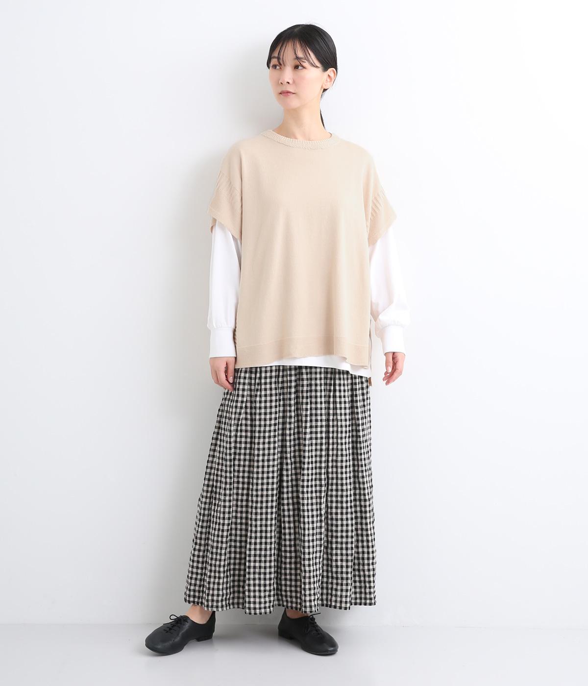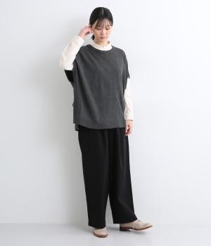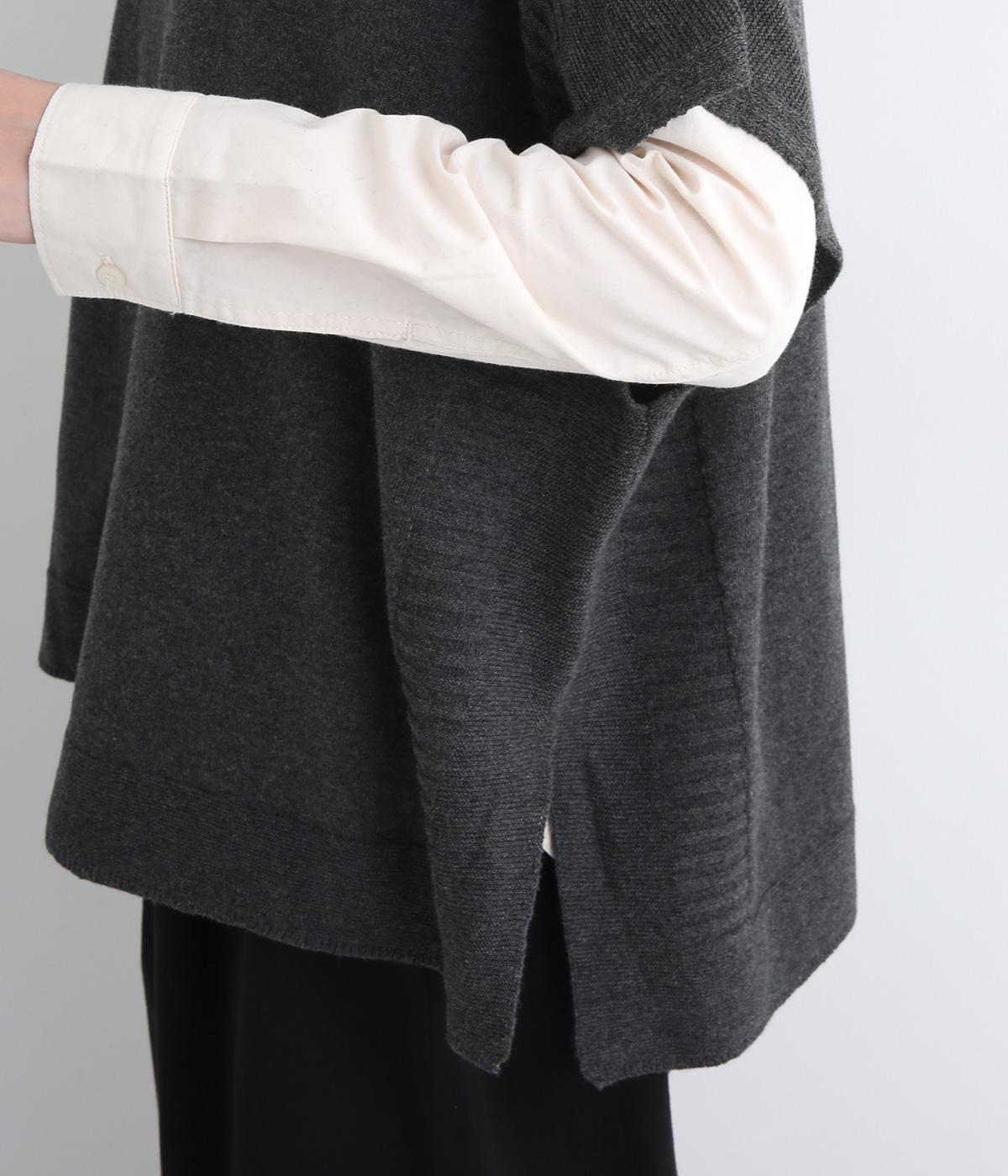 襟ぐりとアームホールの柄編みがアクセントになったニットベスト。ゆとりのあるシルエットで、さまざまなトップスとのレイヤードが楽しめます。サイドスリットを入れ前後差をつけた裾は、縦長ラインを強調しすっきり見せも叶えます。