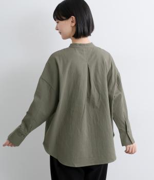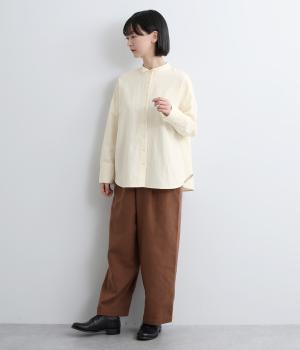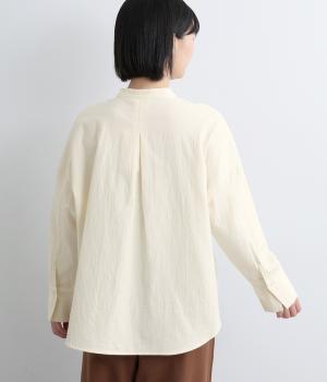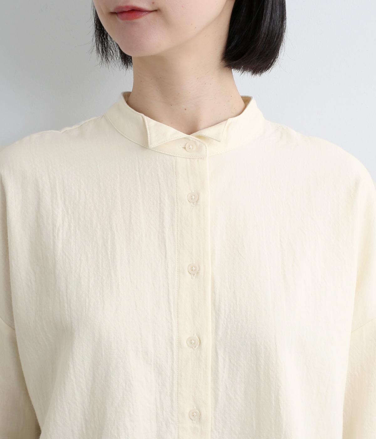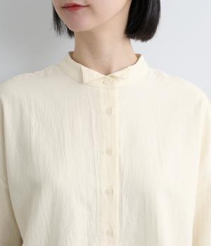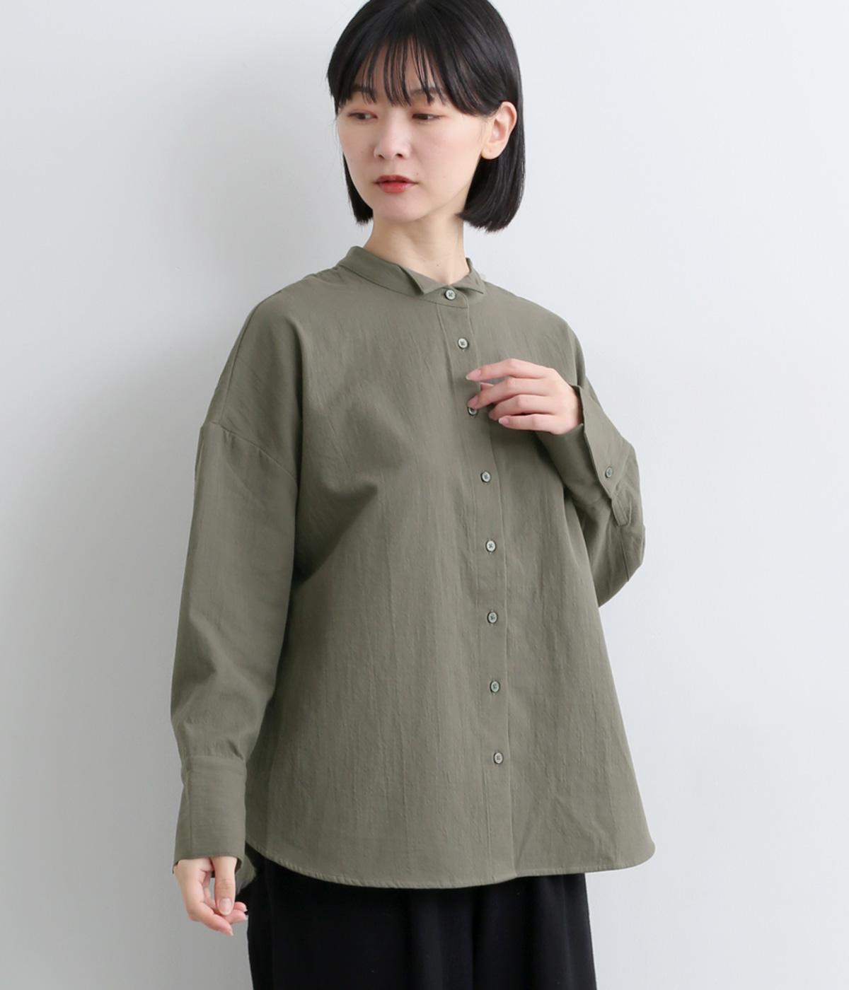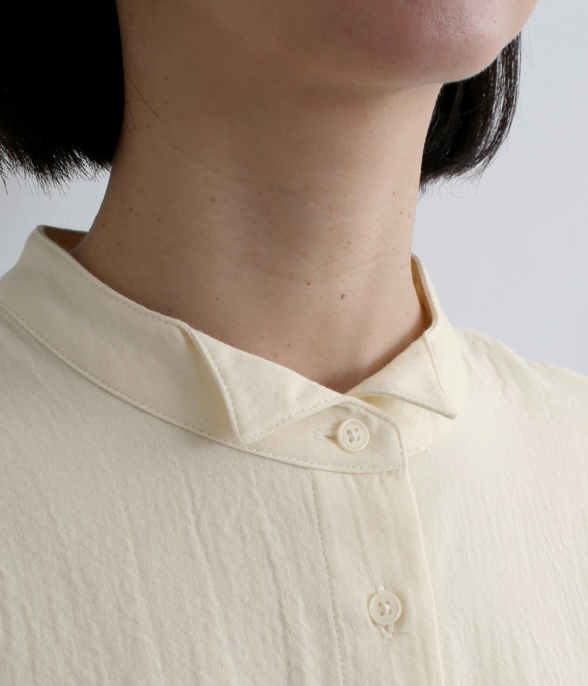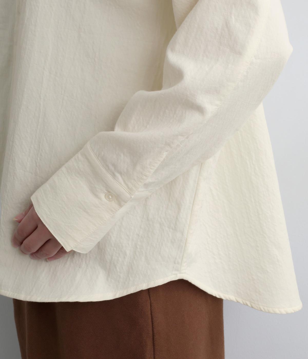 ちょこんと折り返した小さな襟が上品なムードを添えるブラウス。後ろヨーク下にタックを入れ、身頃にゆとりを持たせました。長めの着丈とラウンドヘムにも注目を。ニットやスエットなどを上から重ねて、裾を覗かせたレイヤードスタイルをたのしめます。
