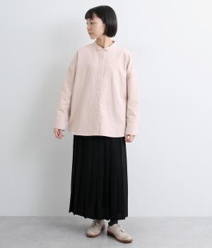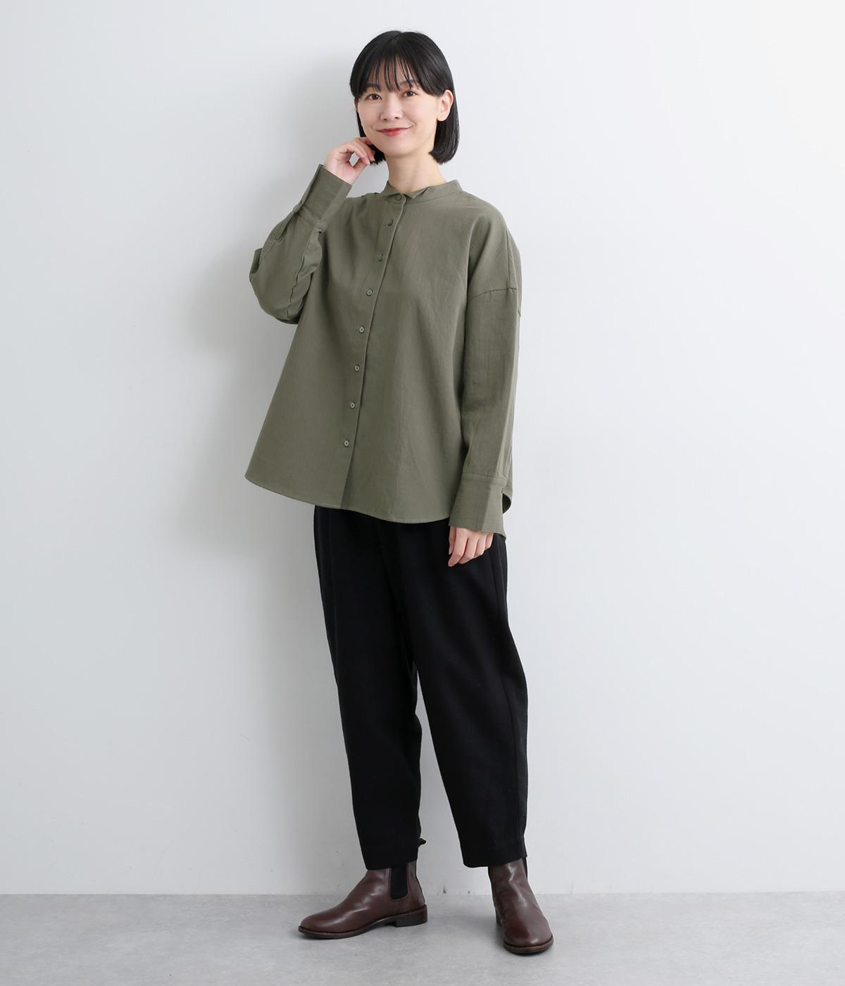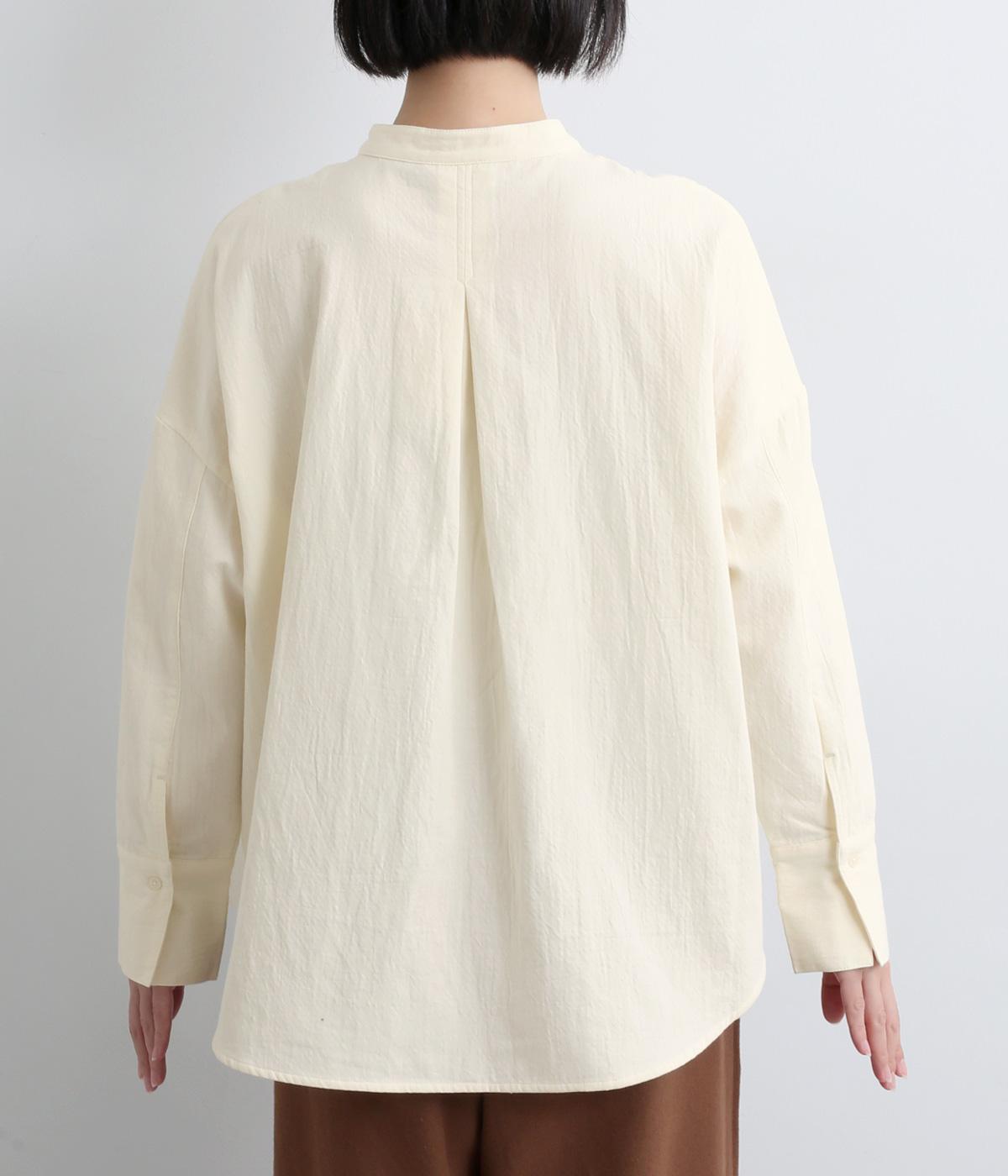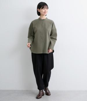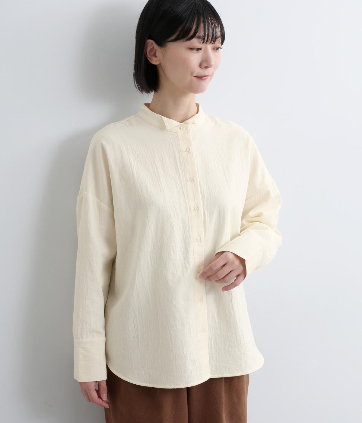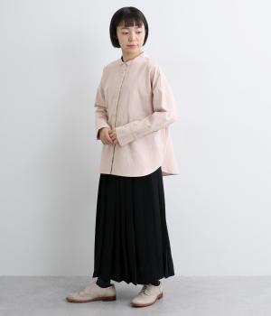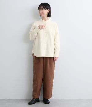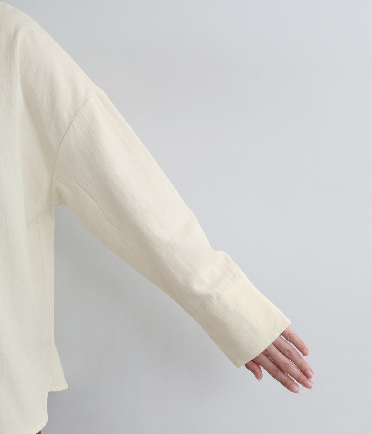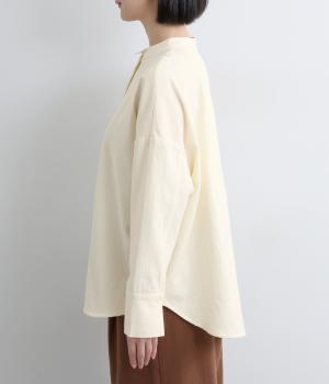 ちょこんと折り返した小さな襟が上品なムードを添えるブラウス。後ろヨーク下にタックを入れ、身頃にゆとりを持たせました。長めの着丈とラウンドヘムにも注目を。ニットやスエットなどを上から重ねて、裾を覗かせたレイヤードスタイルをたのしめます。