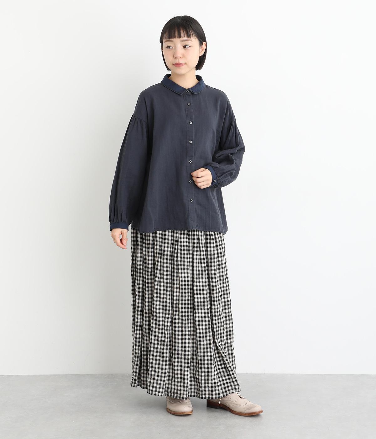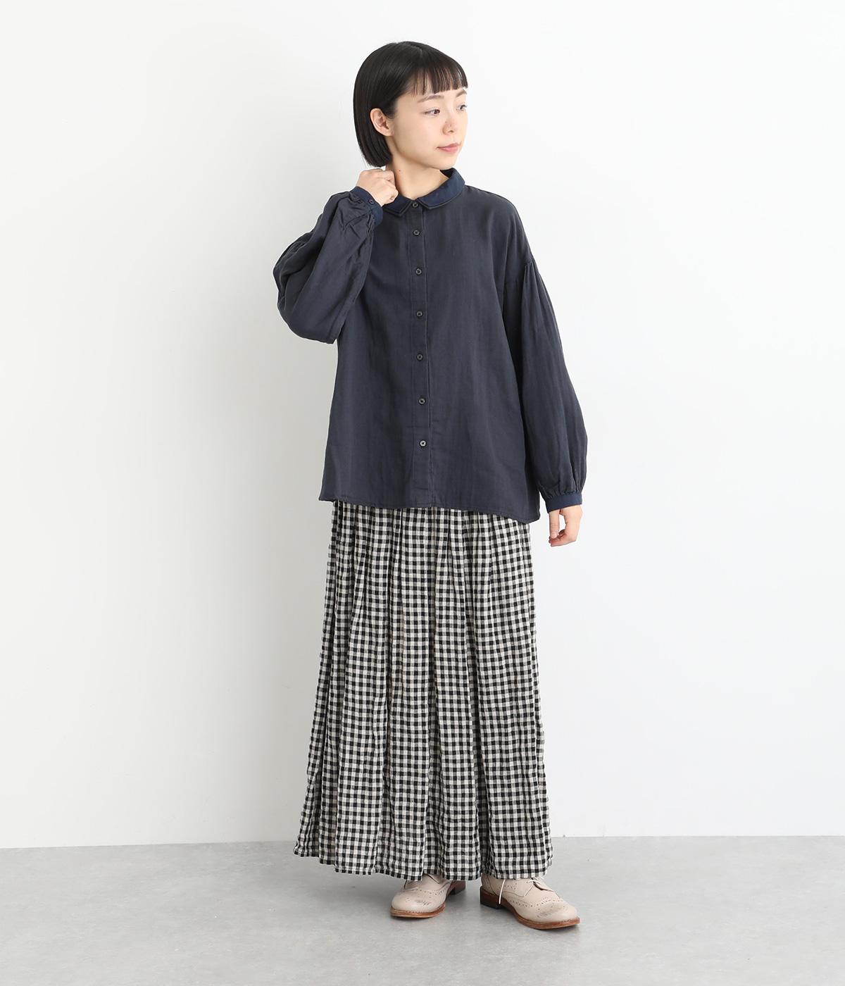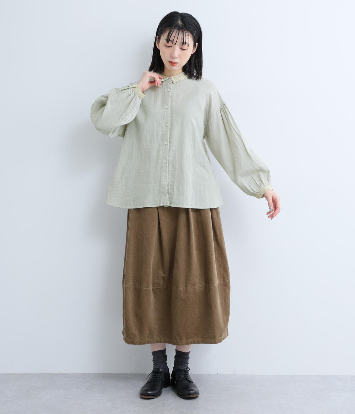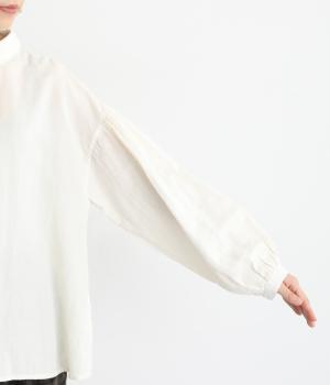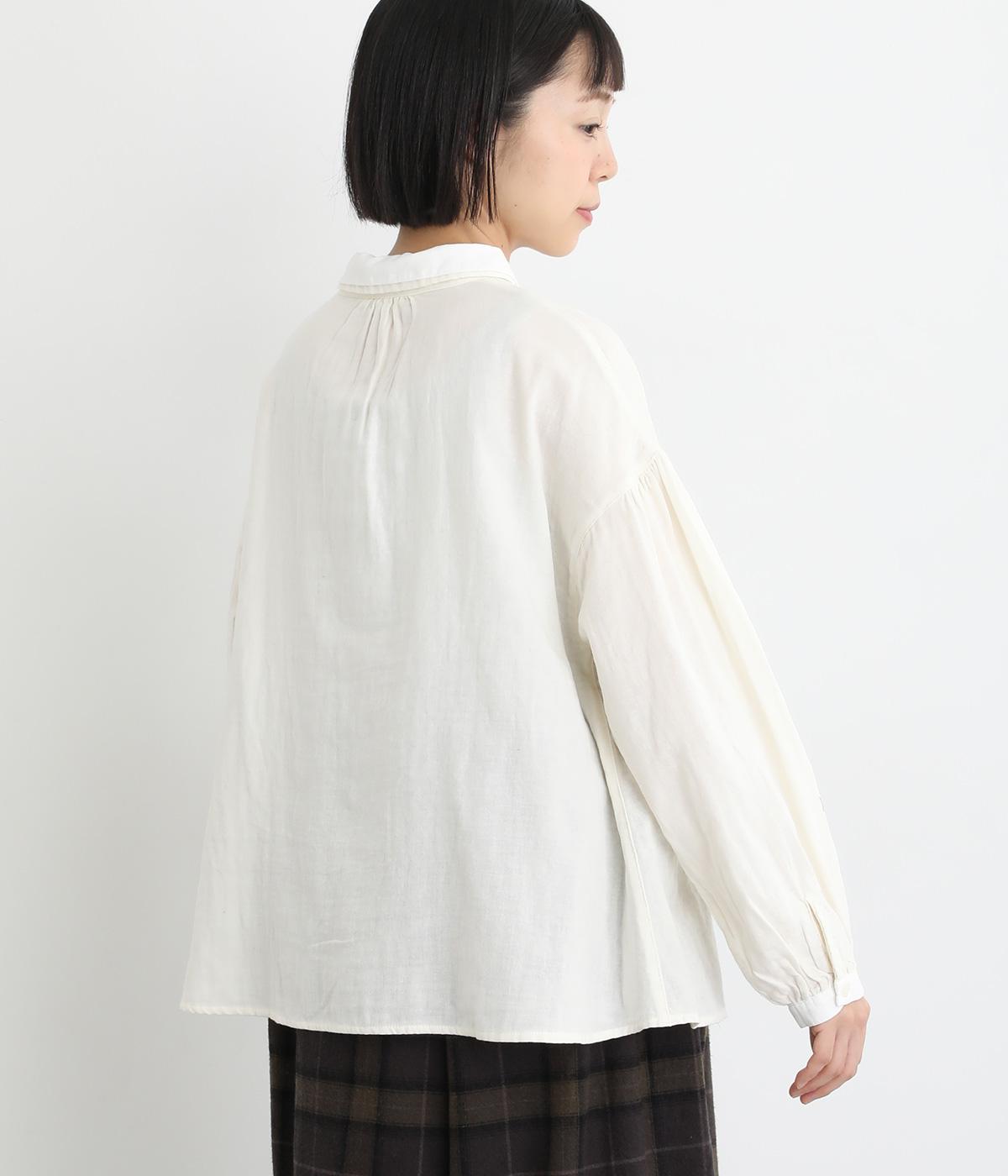 素材を組み合わせた2枚襟が、顔まわりにさりげなく上品なアクセントを添えるブラウスです。袖にはたっぷりとギャザーが入っており、ふわりとしたボリュームで華やかな印象に。後ろ身頃のヨーク下に施されたギャザーが自然な落ち感を生み、どの角度から見ても美しいシルエットに仕上がりました。