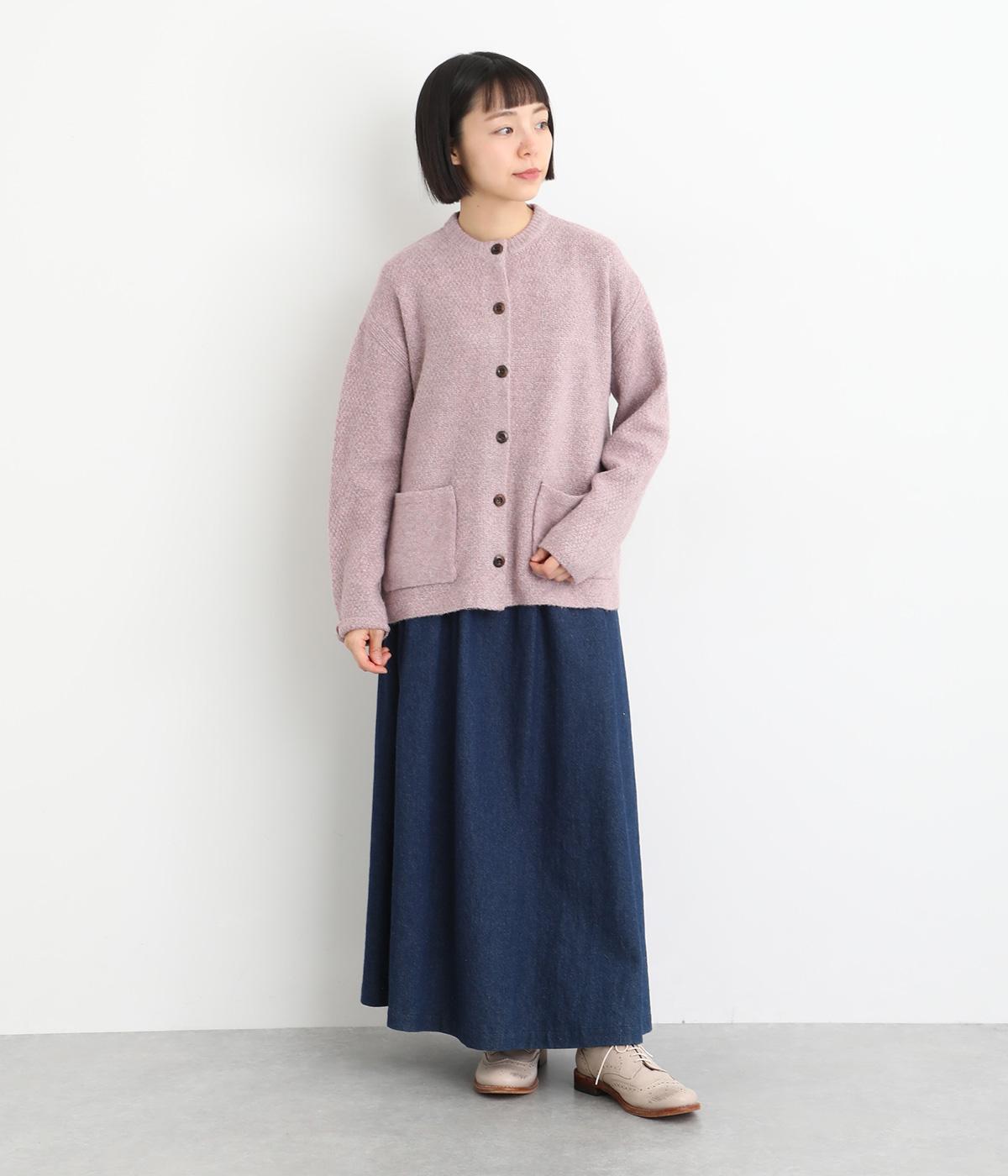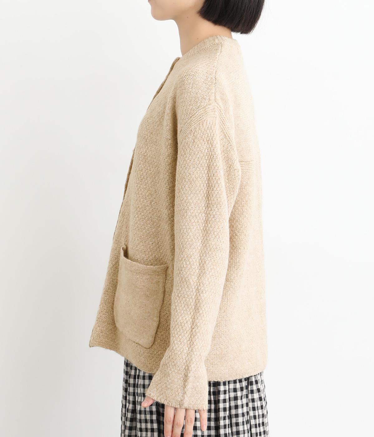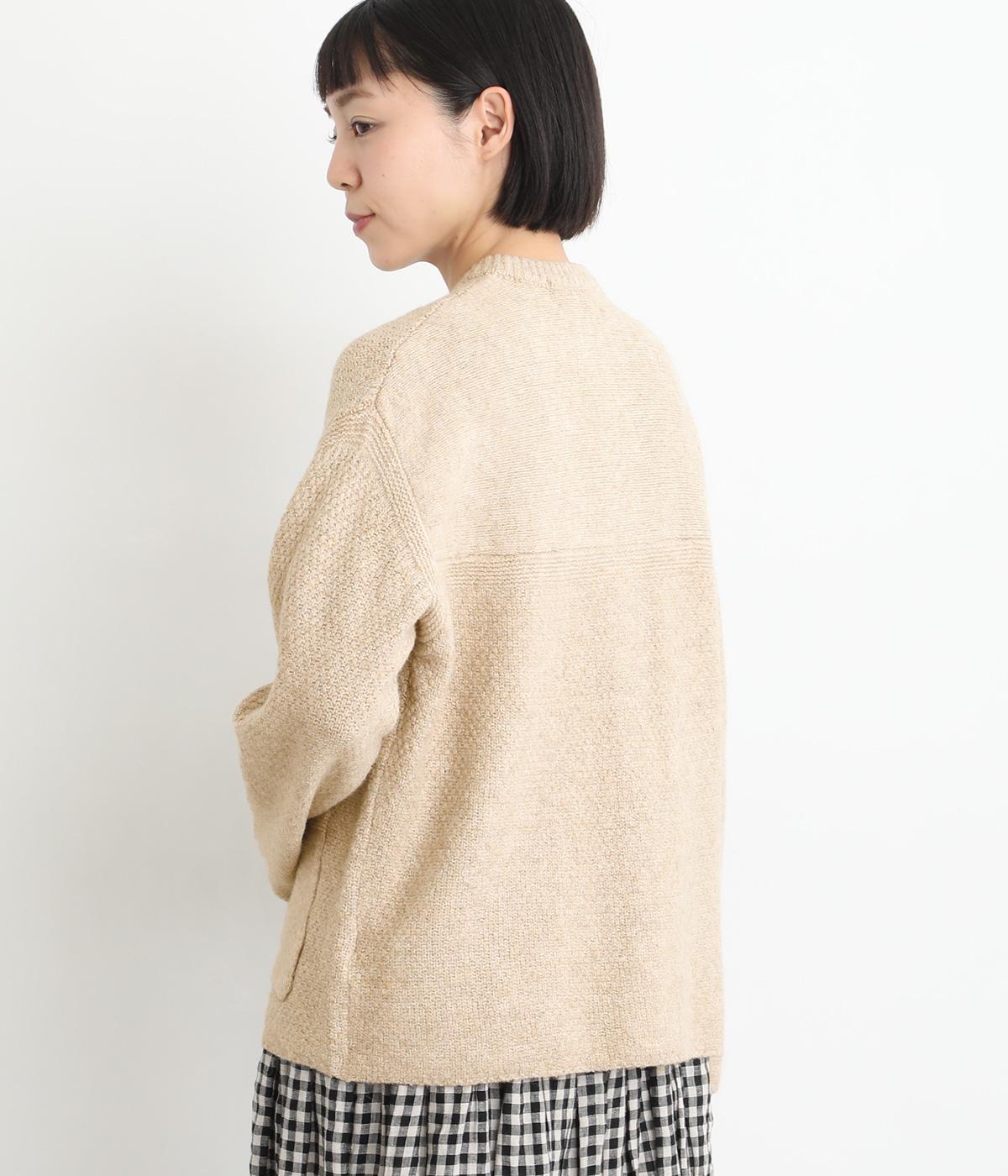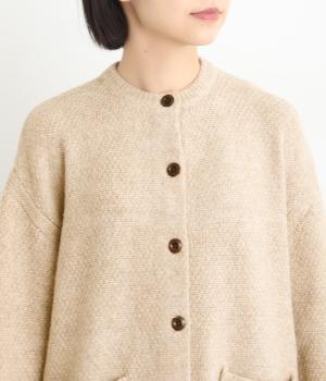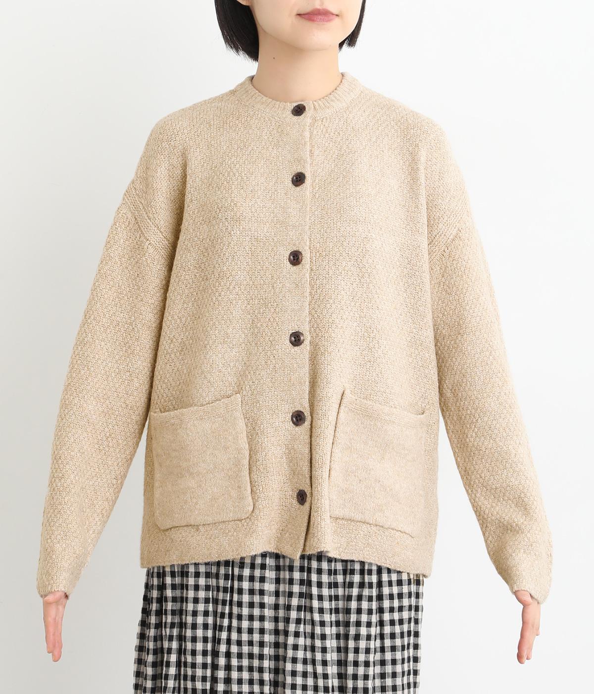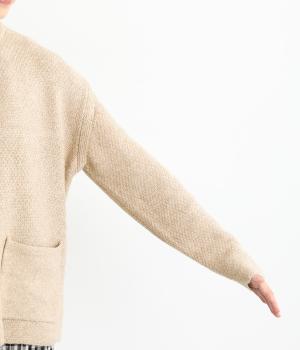 ふっくらとした粒状の編み地が広がり、ぬくもりのある雰囲気をつくります。ポケット部分はフラットな編み地で切り替え、素材の表情を引き立てました。背面はヨーク位置で編み方を変え、さりげないアクセントに。木ボタンの素朴さがよりナチュラルな印象を深めます。
