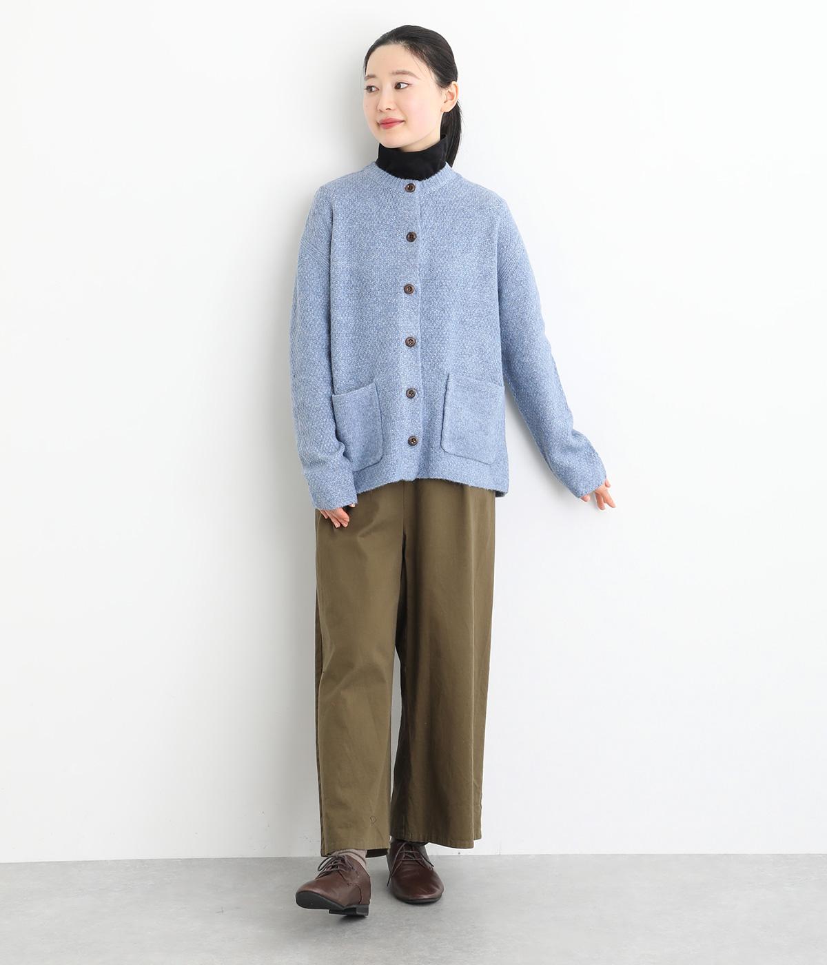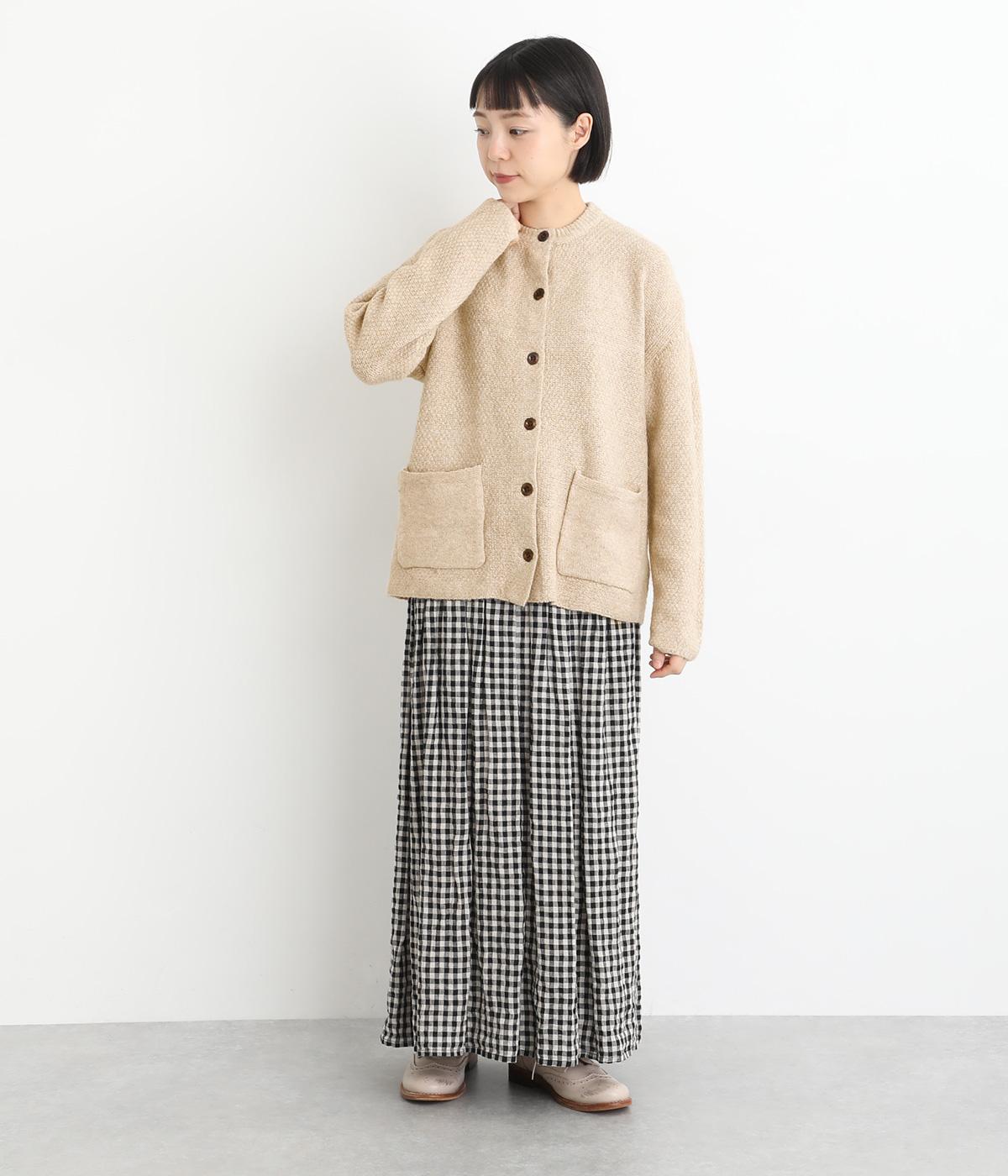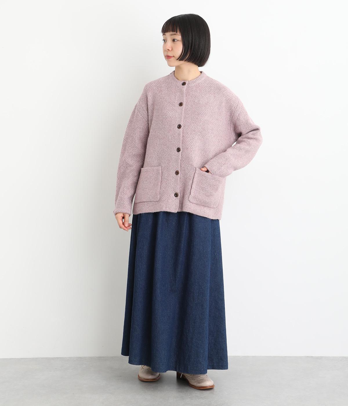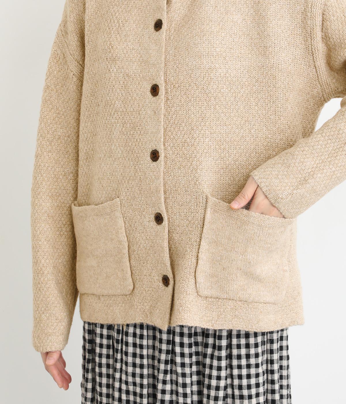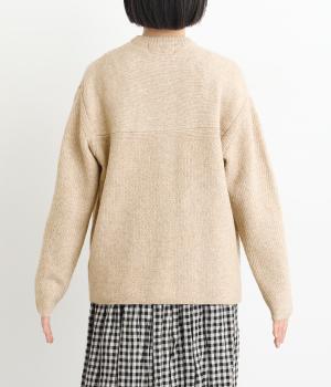 ふっくらとした粒状の編み地が広がり、ぬくもりのある雰囲気をつくります。ポケット部分はフラットな編み地で切り替え、素材の表情を引き立てました。背面はヨーク位置で編み方を変え、さりげないアクセントに。木ボタンの素朴さがよりナチュラルな印象を深めます。