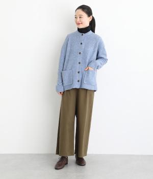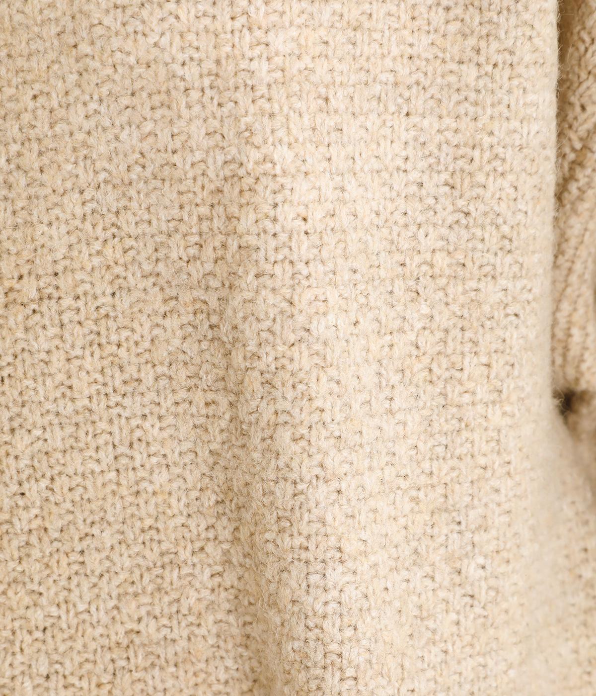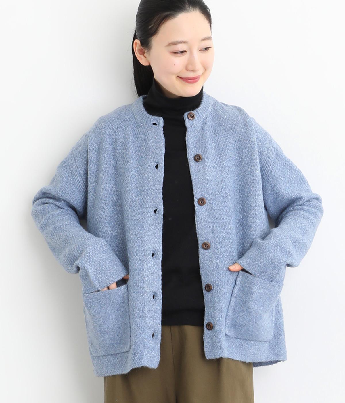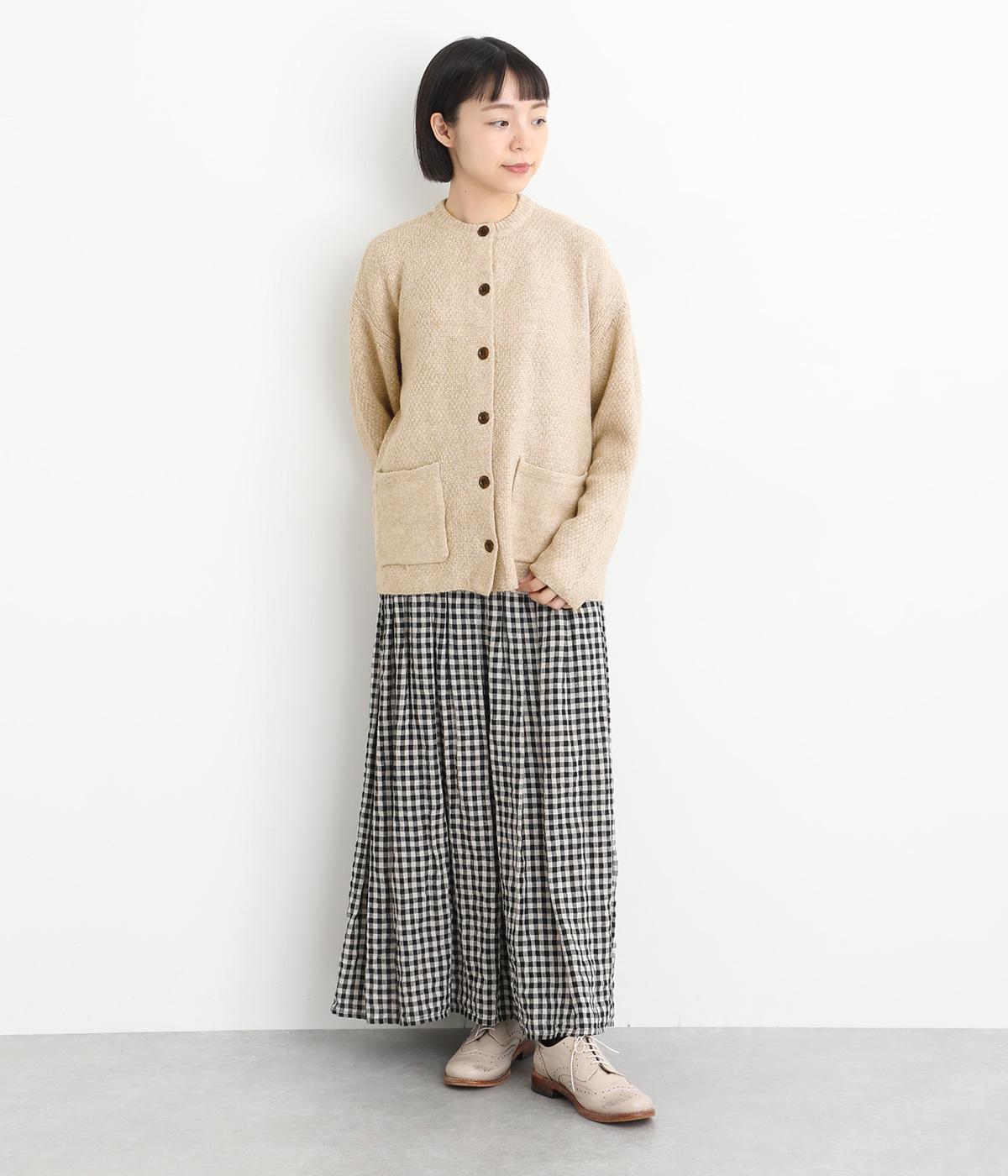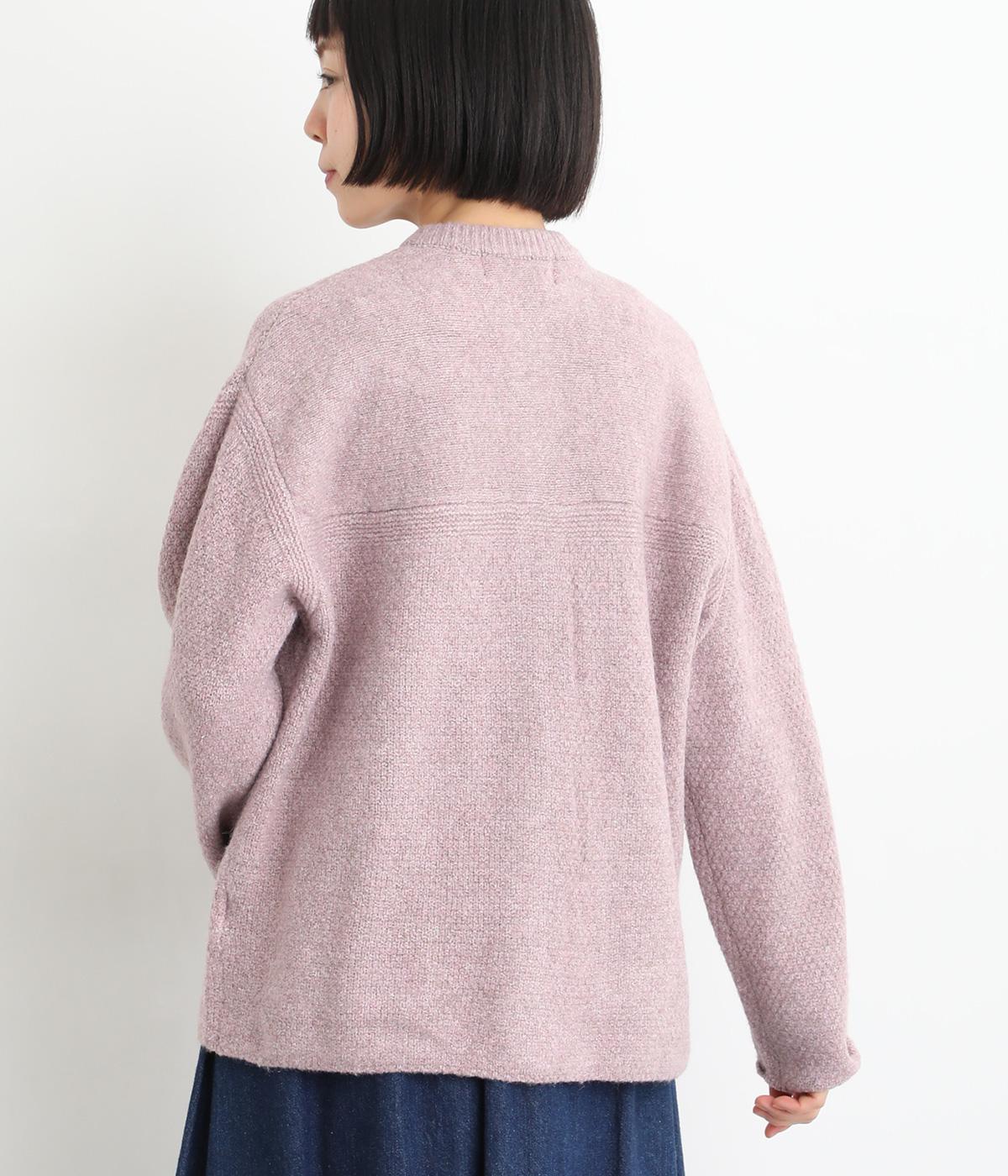 ふっくらとした粒状の編み地が広がり、ぬくもりのある雰囲気をつくります。ポケット部分はフラットな編み地で切り替え、素材の表情を引き立てました。背面はヨーク位置で編み方を変え、さりげないアクセントに。木ボタンの素朴さがよりナチュラルな印象を深めます。