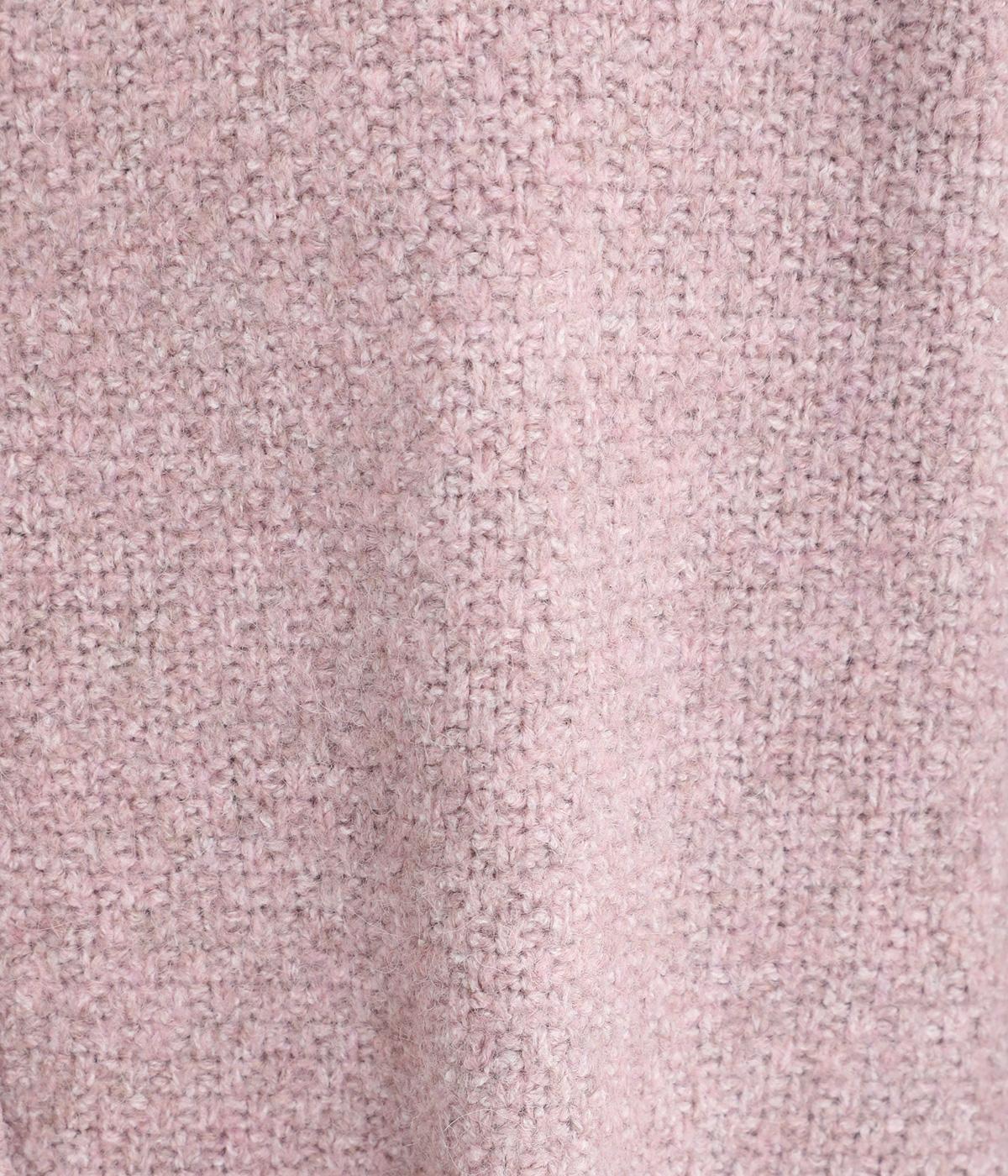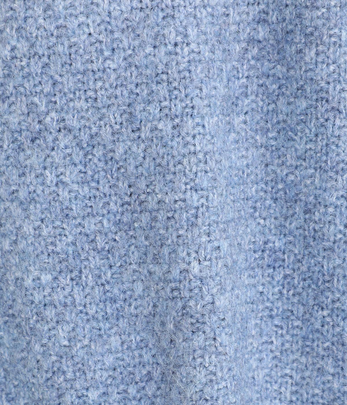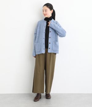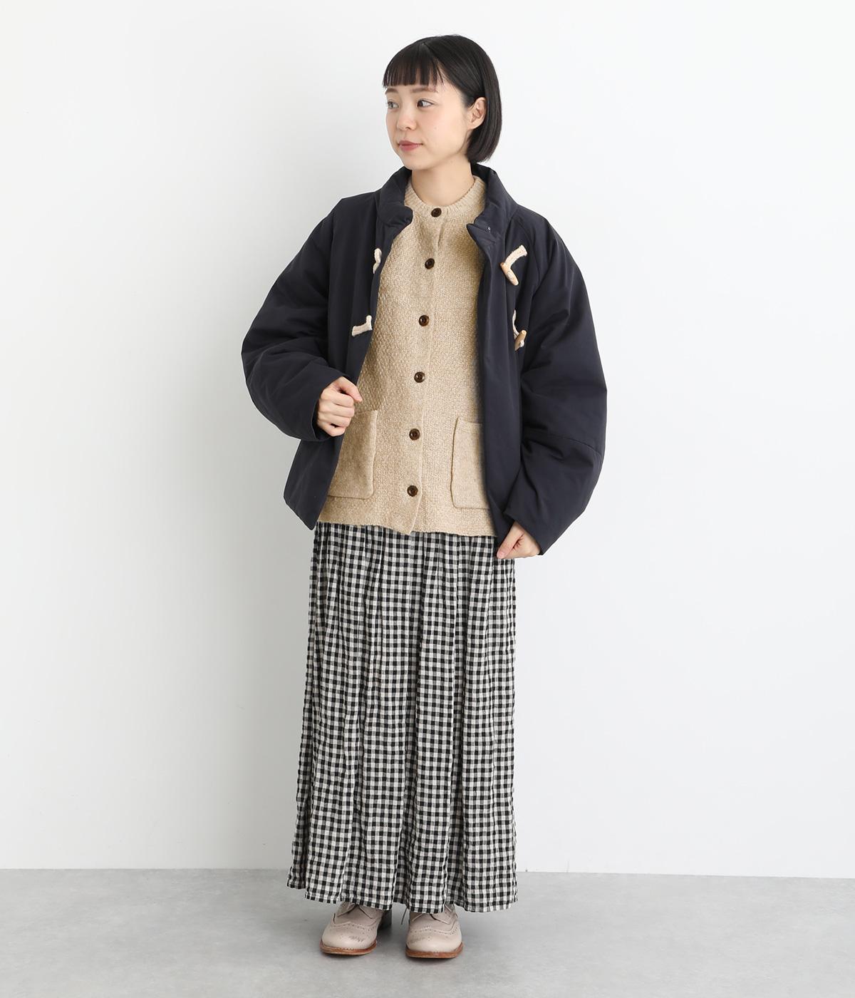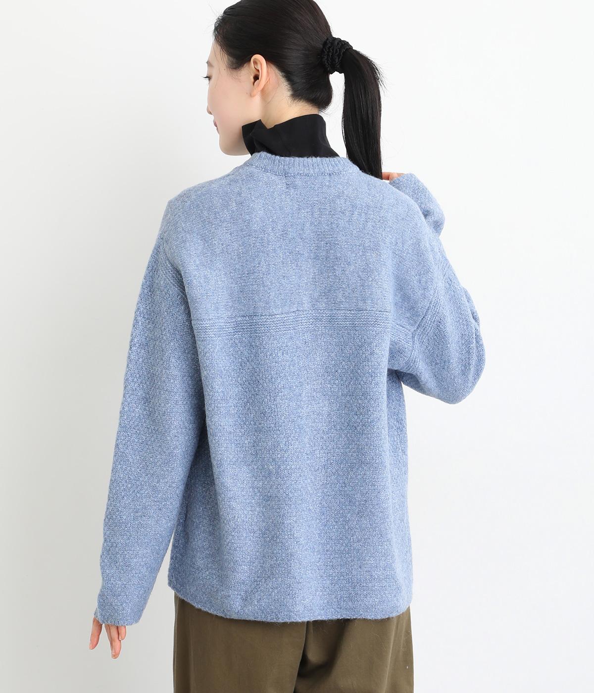 ふっくらとした粒状の編み地が広がり、ぬくもりのある雰囲気をつくります。ポケット部分はフラットな編み地で切り替え、素材の表情を引き立てました。背面はヨーク位置で編み方を変え、さりげないアクセントに。木ボタンの素朴さがよりナチュラルな印象を深めます。