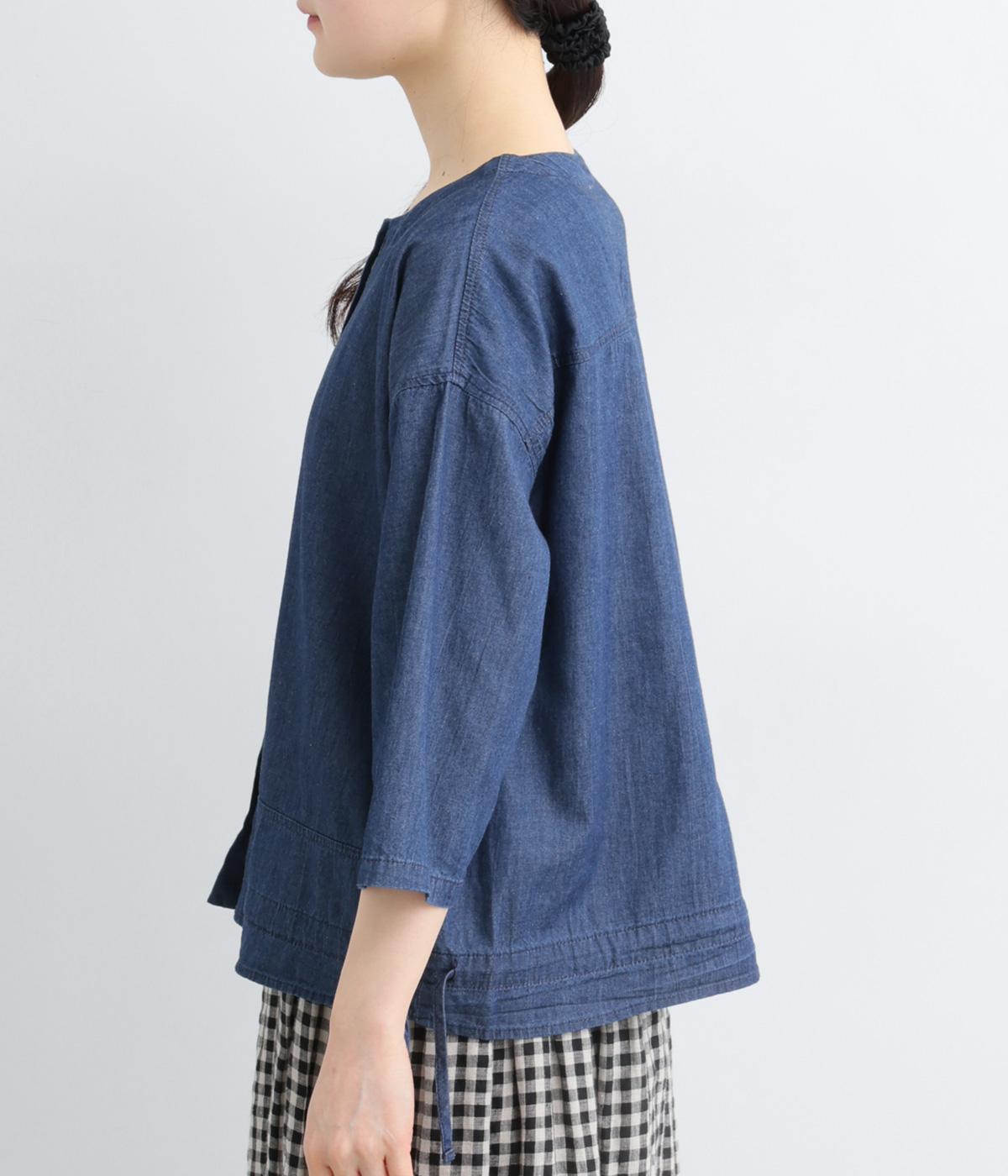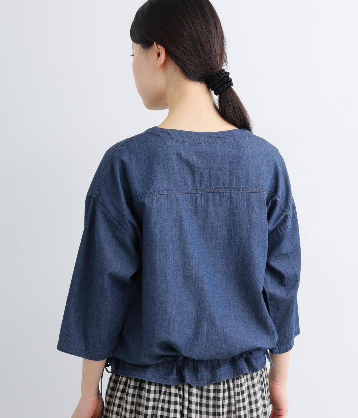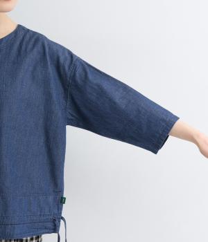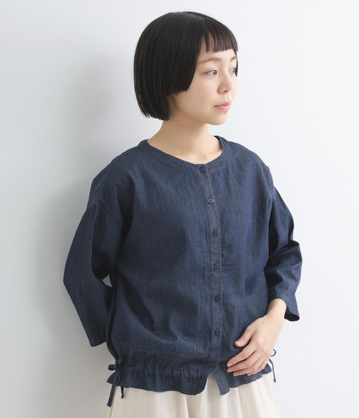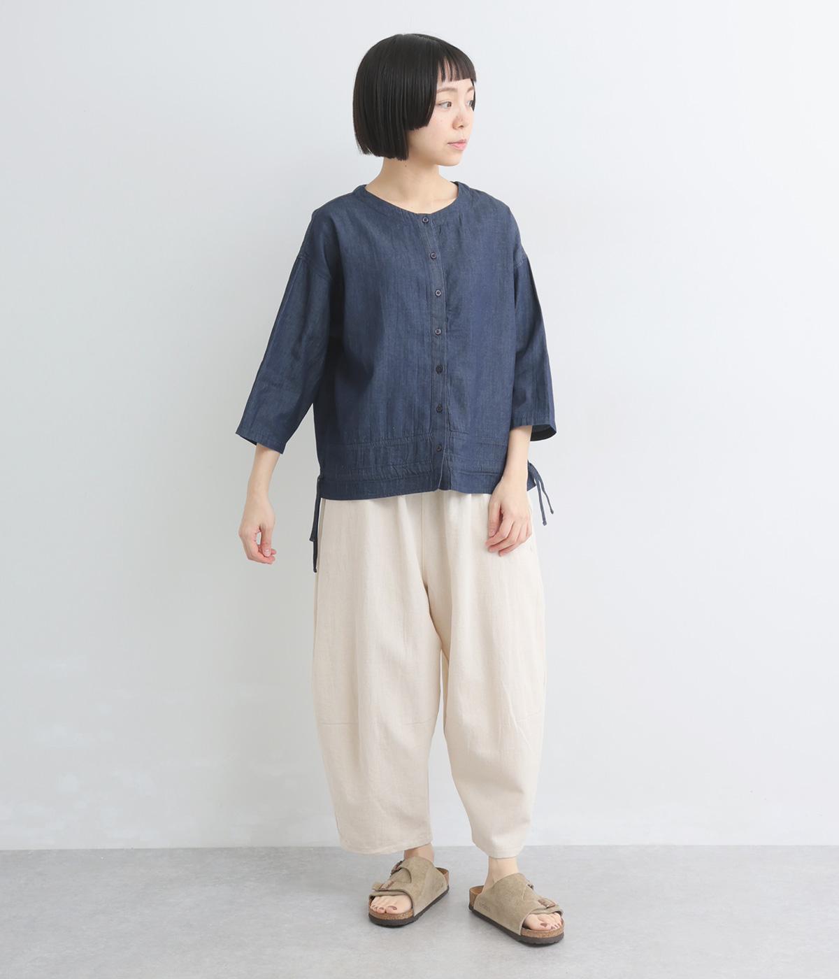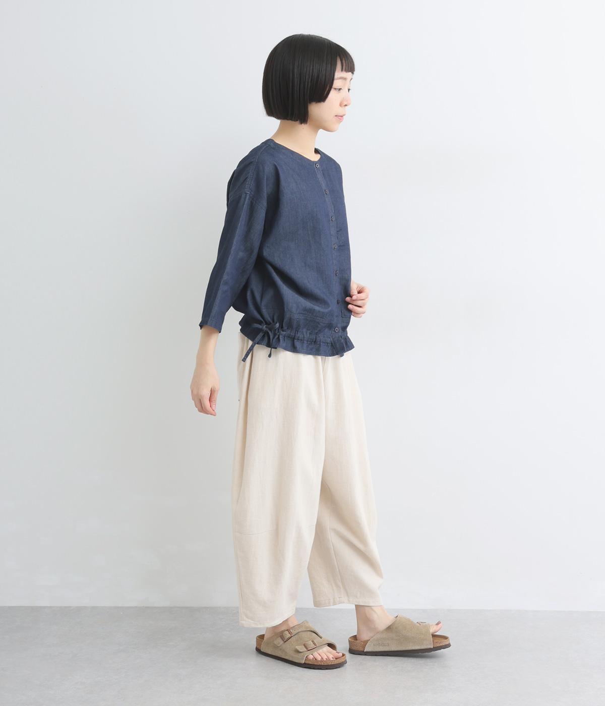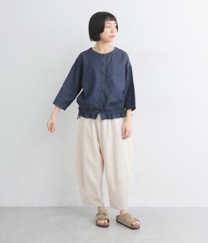 ワイドシルエットと、すっきりとしたノーカラーの首元が好バランスなブラウスです。裾に通したドローコードを絞ると、コクーンシルエットとしての着こなしも楽しめます。前をあけて、羽織りとして合わせるのもおすすめな一枚です。